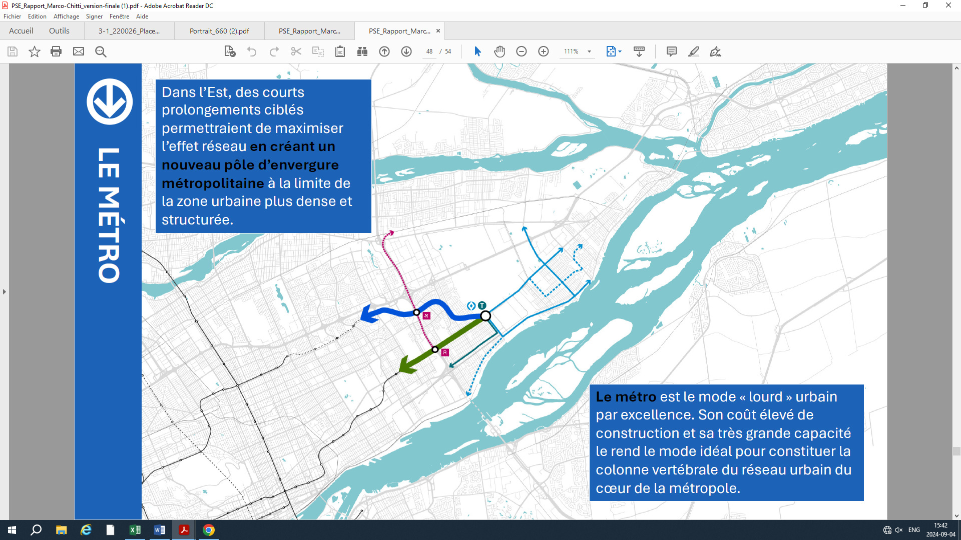 En somme, il veut garder la portion au nord du tramway, and remplacer la branche est du PSE avec un SRB, et étant donné c’est moins cher, construire plus de SRB au courte terme. Avec cela, au long terme, prolonger le métro et bonifier le train de l’est, mais dans 40-50 ans.