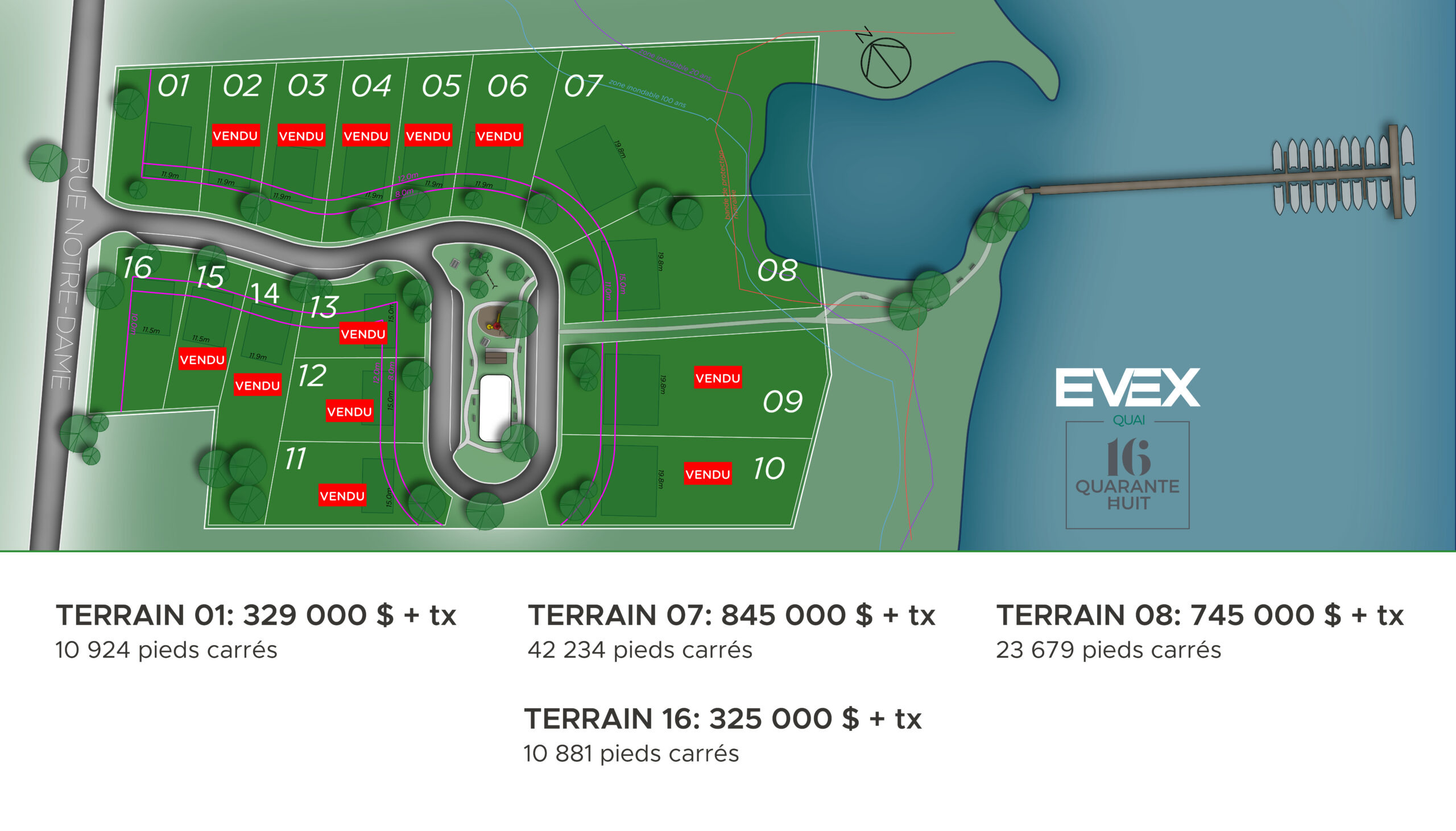 Ce projet unique de Groupe Evex propose un quartier résidentiel composé de 16 terrains dont 4 sont riverains. Les terrains, qui sont construisibles dès l’été 2023, ceintureront un espace familial composé d’une patinoire en hiver, de paniers de basketball en été ainsi que des aires de jeux 4 saisons. Un quai par terrain sera également disponible pour les amateurs de bateaux qui désirent l’amarrer à quelques pas de la maison.