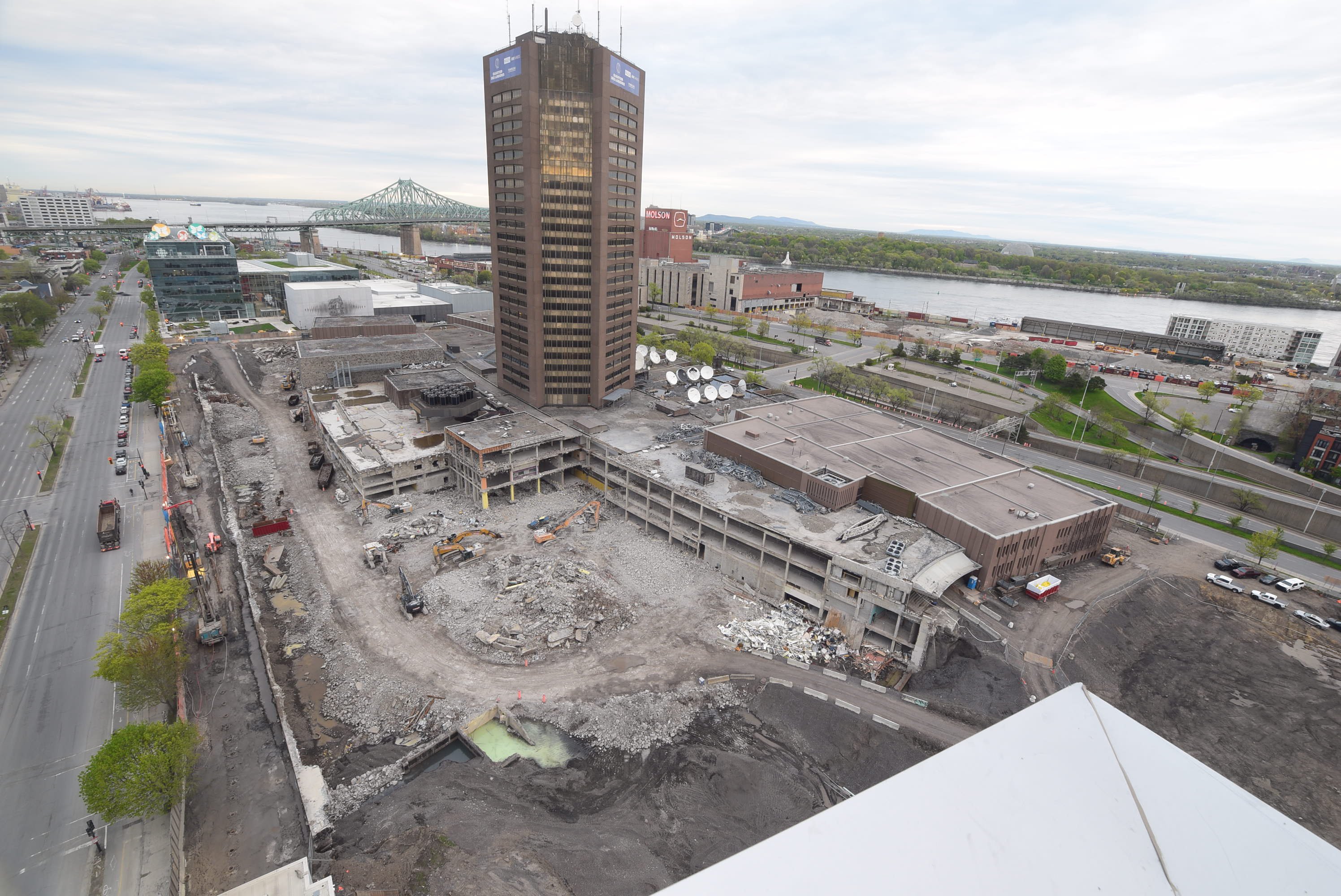 L’ensemble des étages sous terre et tous les édifices autour de la tour seront démolis. Il ne restera que la tour, qui sera transformée. Ryan Barihi, gérant adjoint de projet chez Pomerleau, l’entreprise responsable de ce chantier, explique que plus de la moitié des 300 000 tonnes de béton issues de la démolition sera utilisée pour la construction du nouveau complexe.