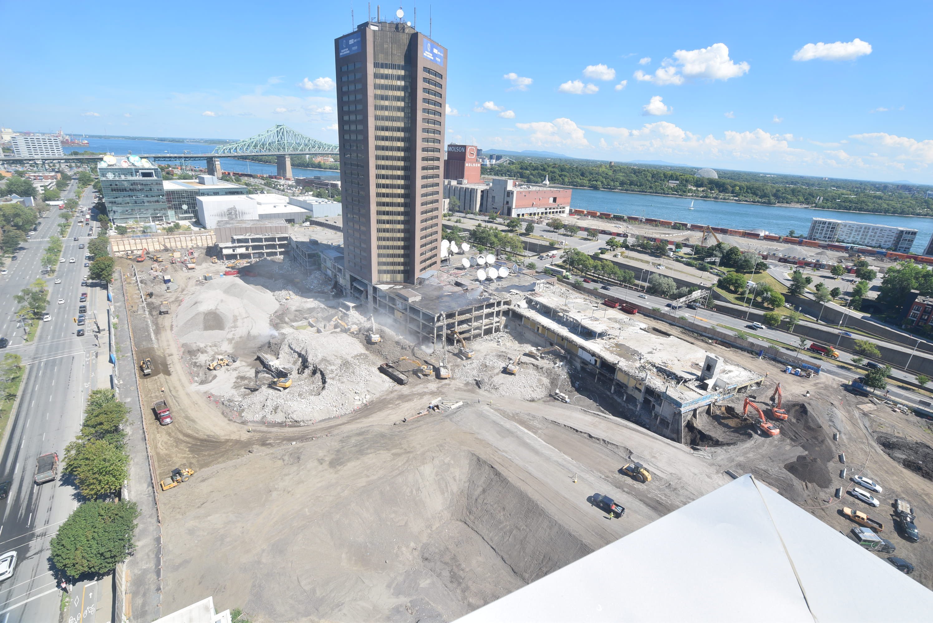 “La phase 2 qui consiste à démolir le long de l’avenue Viger débutera ensuite pour se terminer en novembre. C’est pendant cette deuxième phase que le revêtement de l’ancienne tour brune de Radio-Canada sera retiré, ne laissant debout que la structure de l’édifice.”