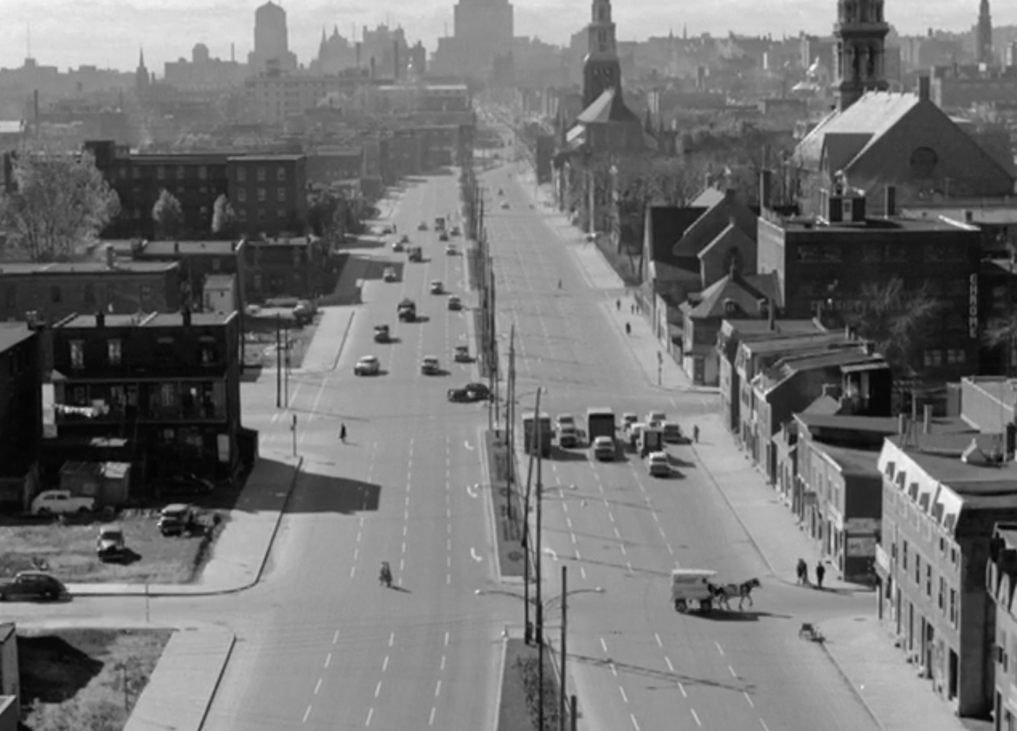 Le boulevard René-Lévesque au niveau de la maison Radio-Canada actuelle avant le rasage de son côté sud. Emplacement actuel sur google earth pour comparer. Hâte de voir ça ressemblera à quoi suite au développement du Quartier des lumières.