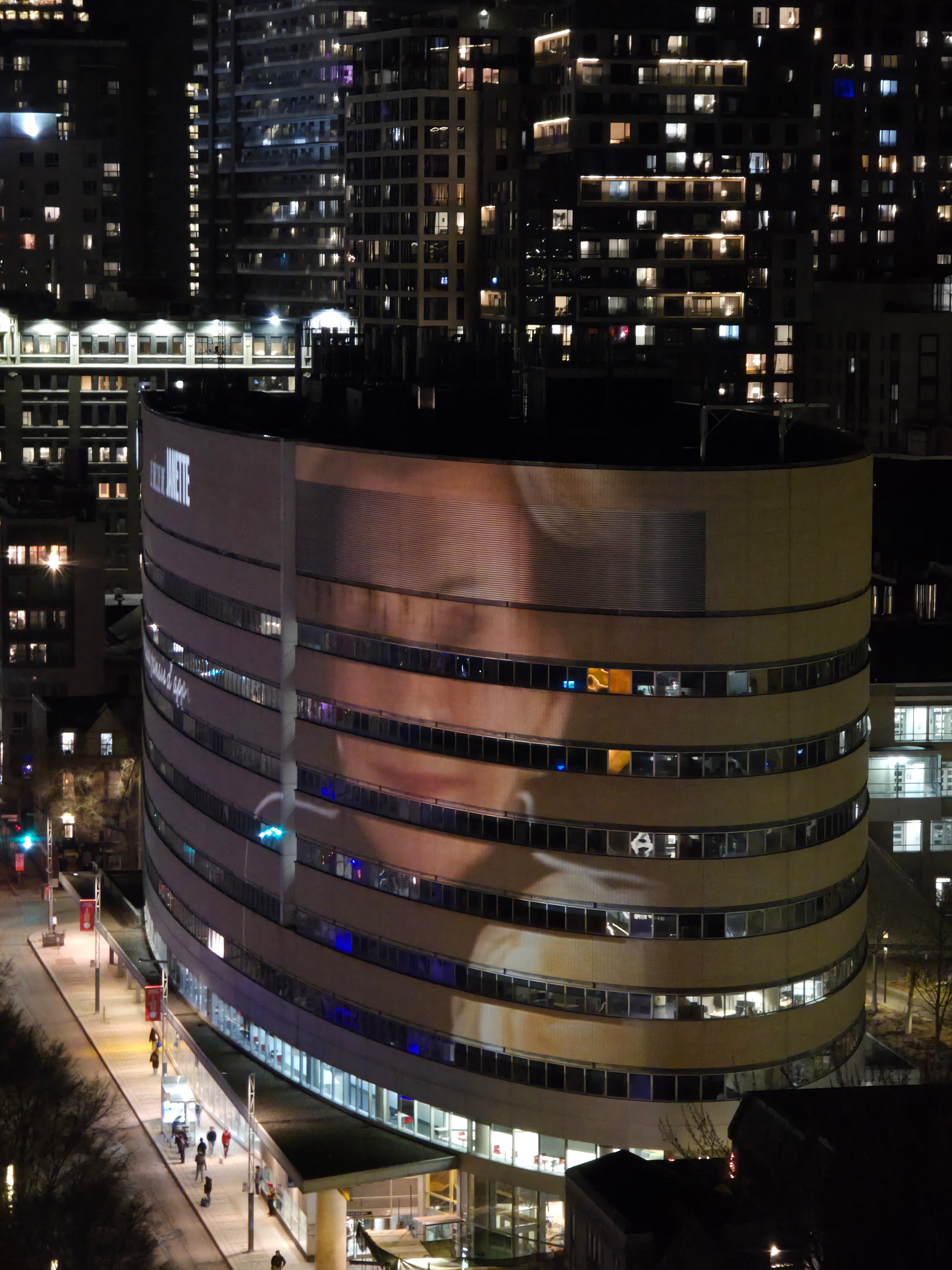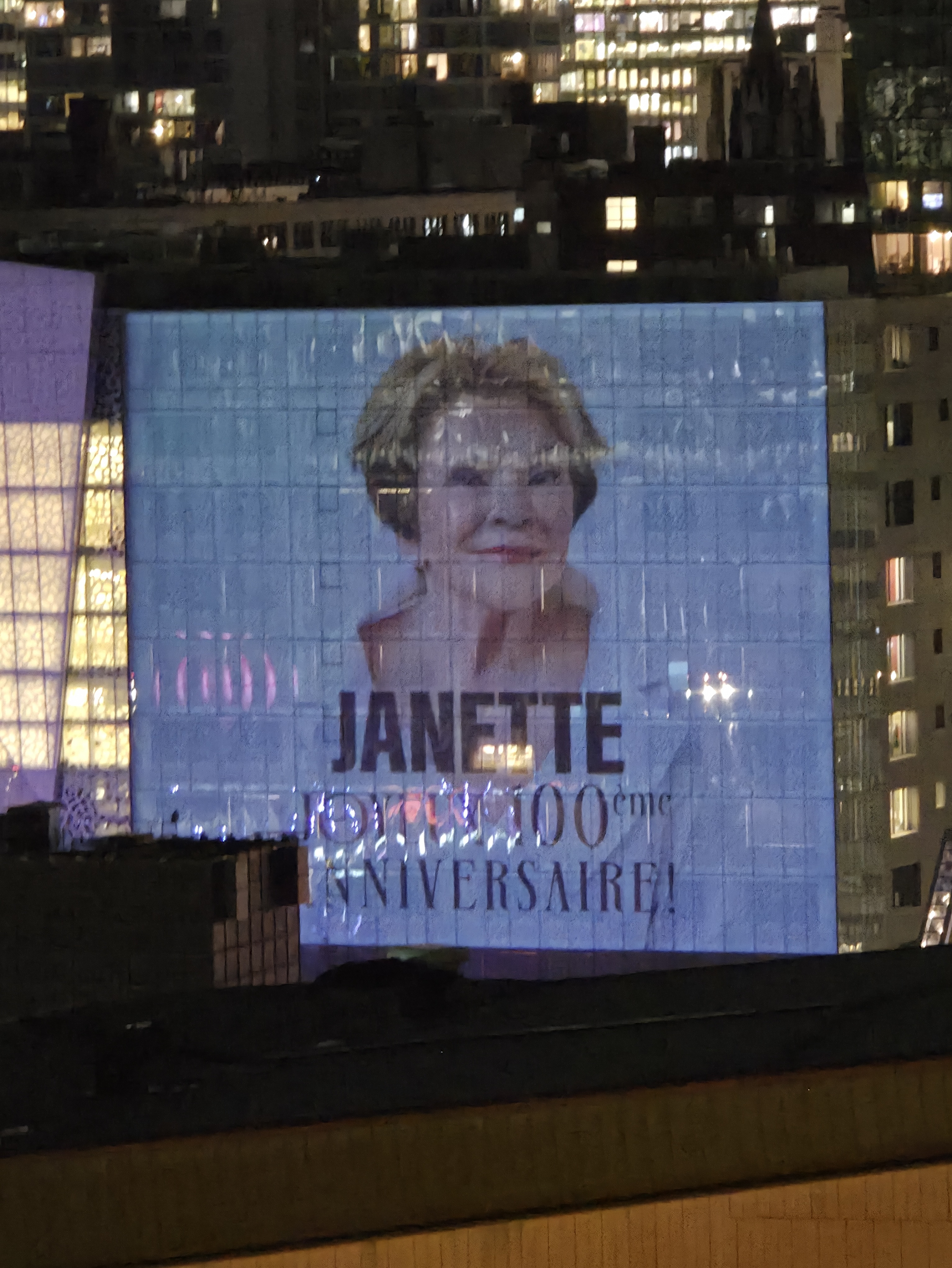 On souligne le 100è anniversaire de Janette Bertrand en projection sur l’édifice Wilder ainsi que sur l’édifice de l’UQAM au Quartier des Spectacles.