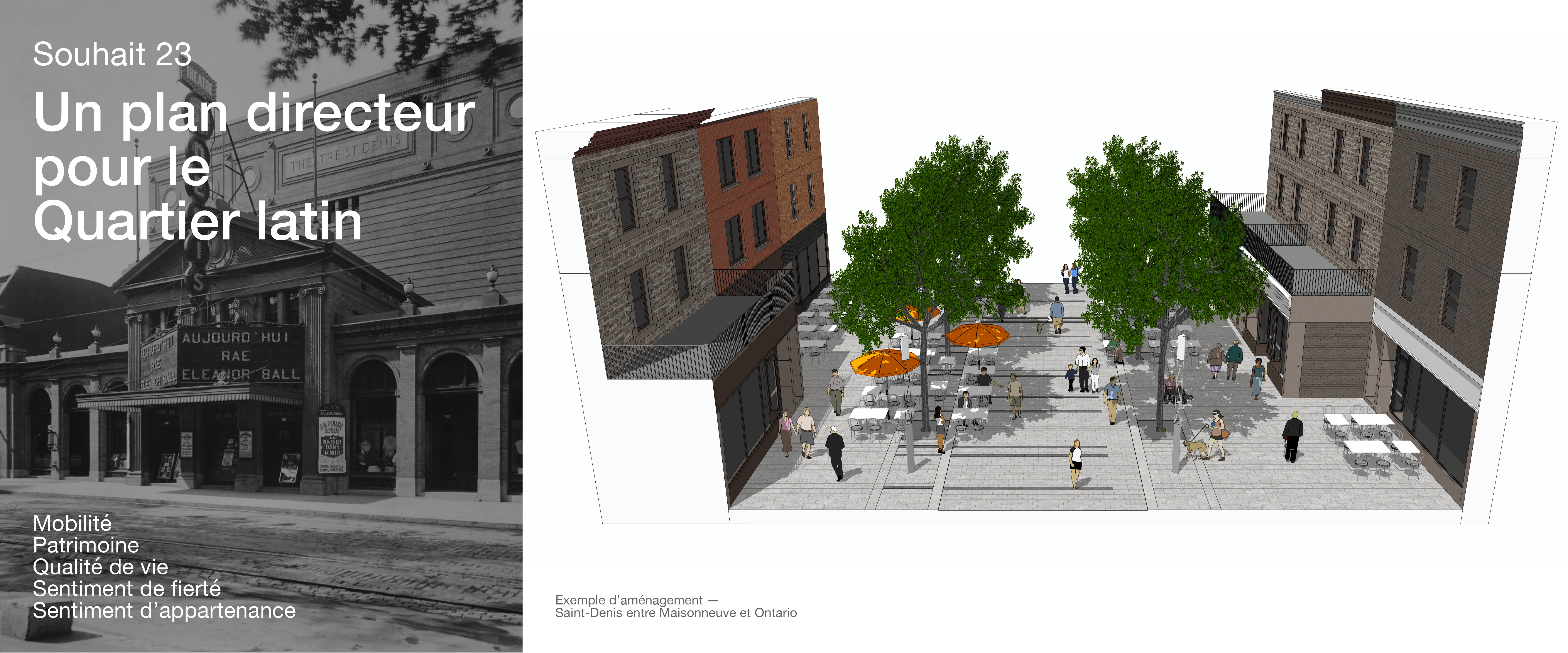 23.1 L’élaboration d’un plan directeur complet et détaillé pour l’ensemble du territoire, incluant le réaménagement de la rue Saint-Denis comme cœur du Quartier ;