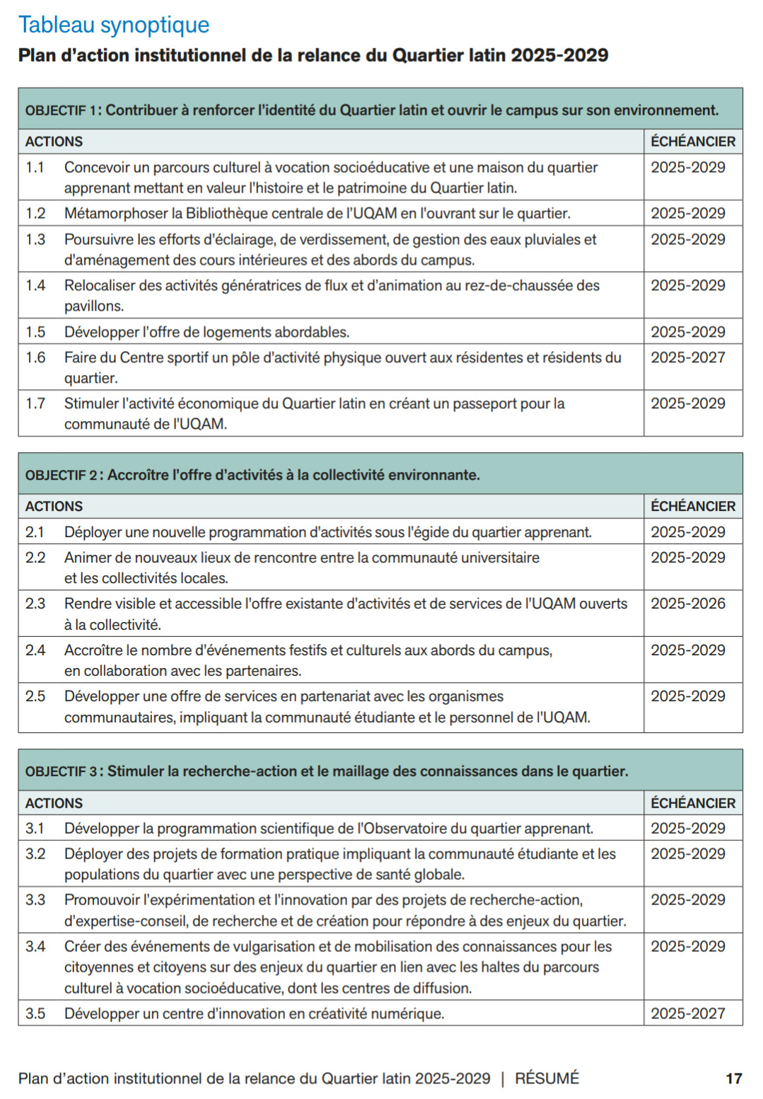 Je trouve louable les initiatives qui ouvriraient l’université au quartier (Objectif 1), notamment l’ouverture des services sportifs aux résidents du quartier, la “métamorphose” de la bibliothèque pour la rendre plus accessible au quartier, et la relocalisation de services générateurs de déplacement aux niveaux rez-de-chaussée des pavillons. Voici une capture d’écran du tableau synoptique (page 17 du résumé) comme clin d’oeil rapide: