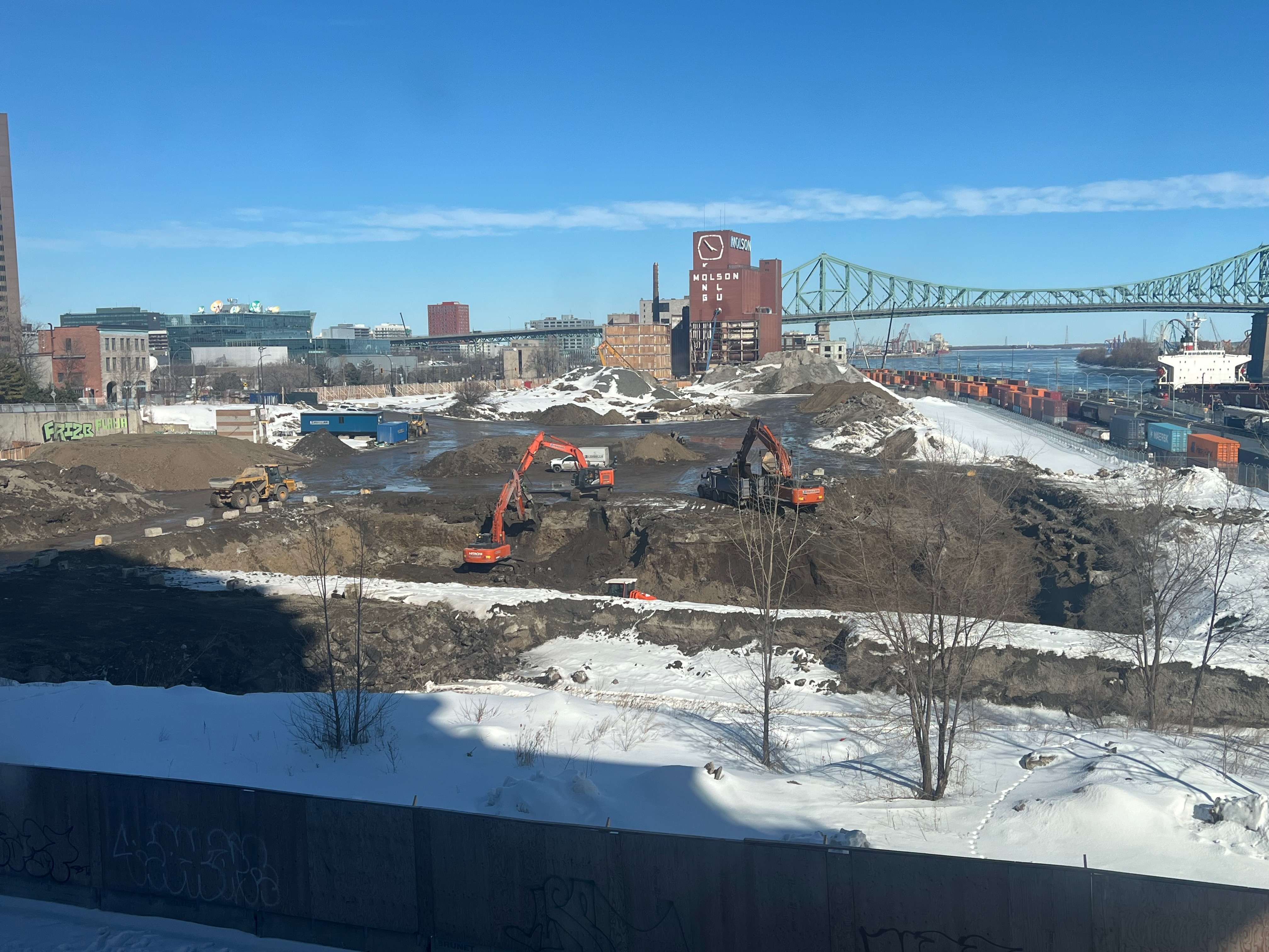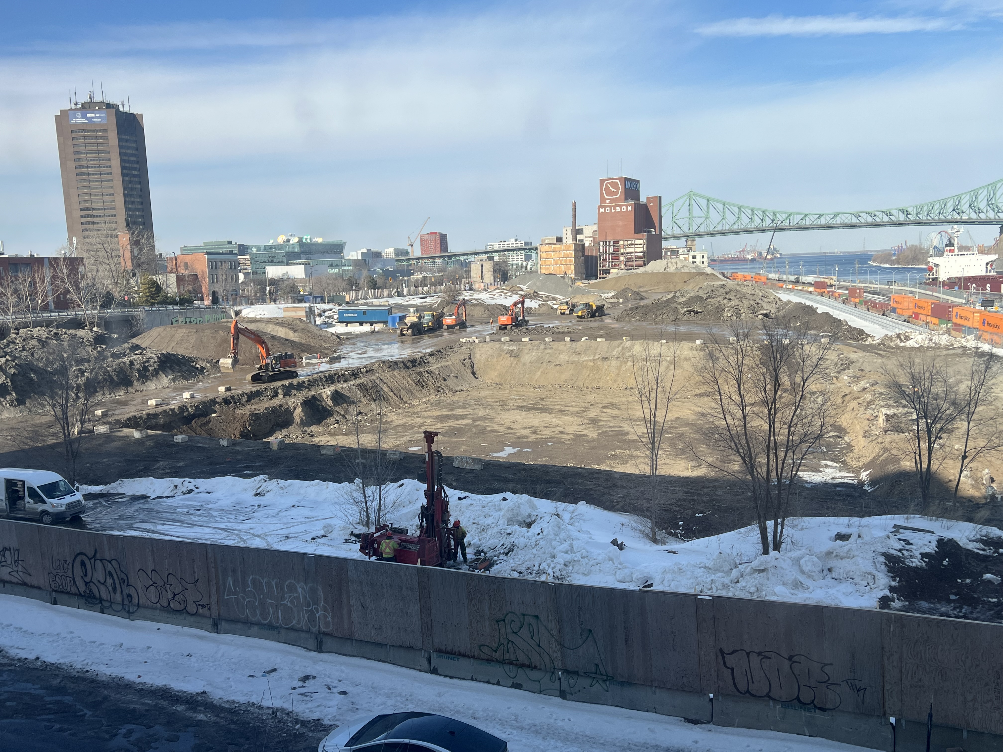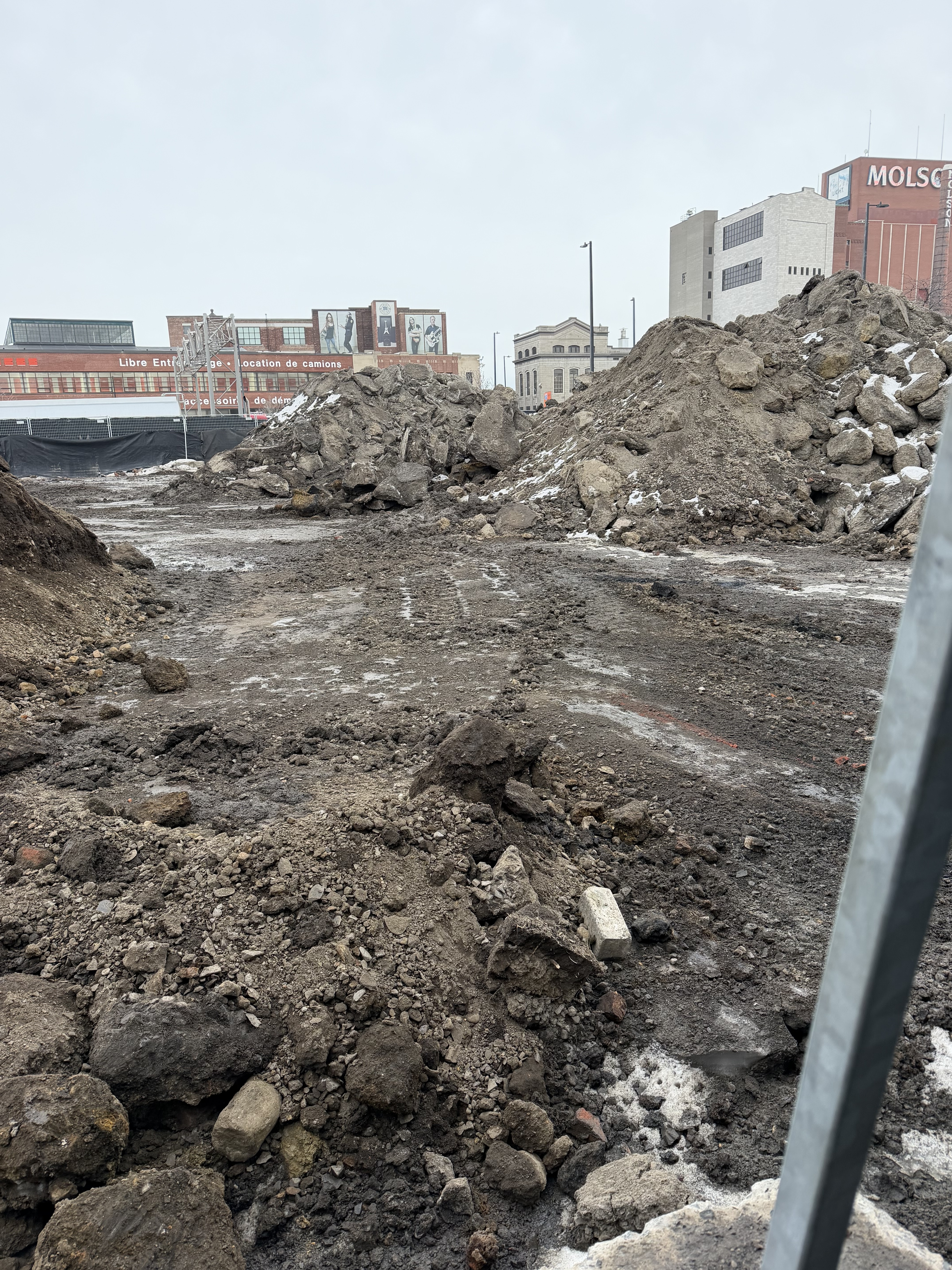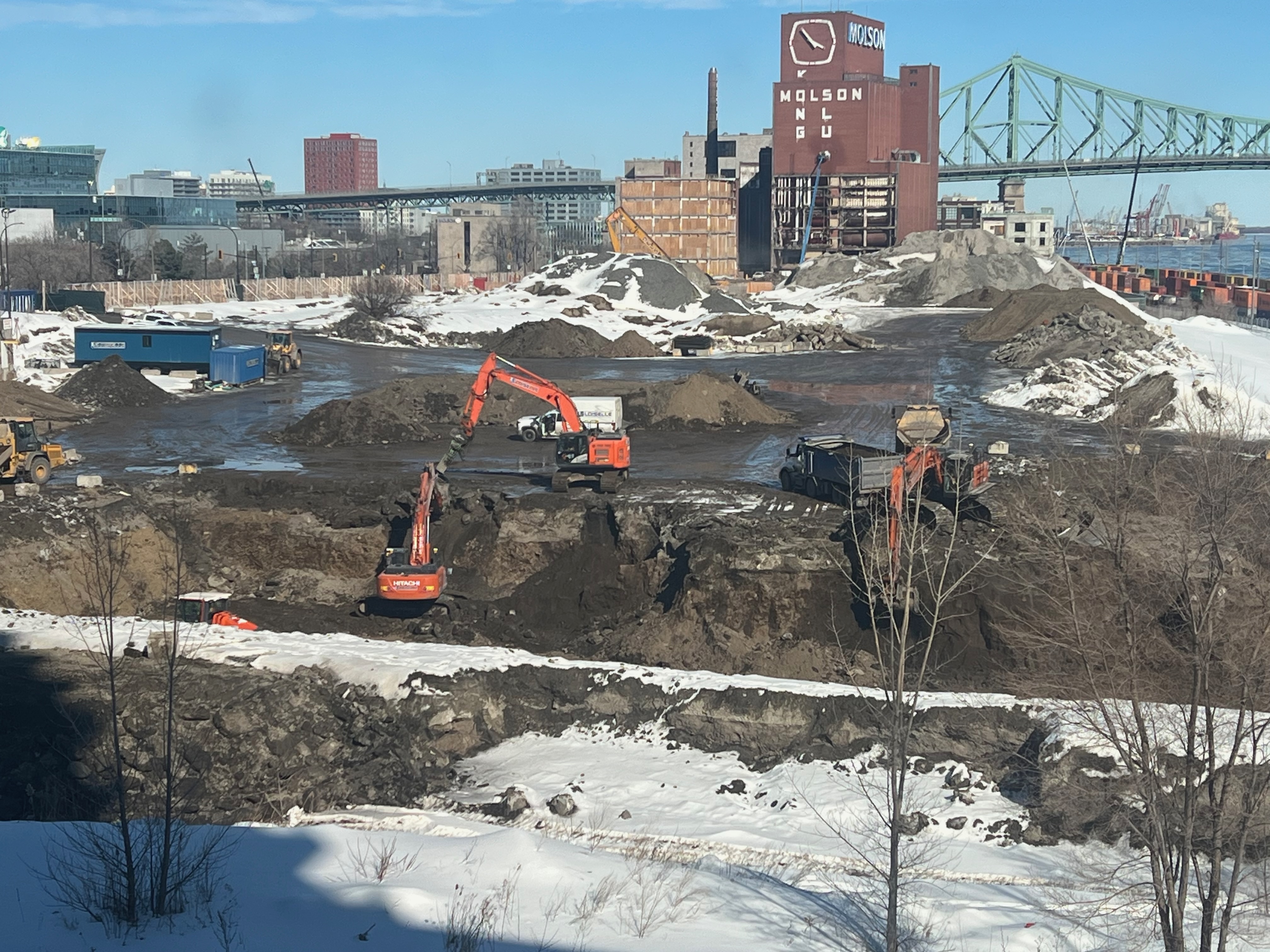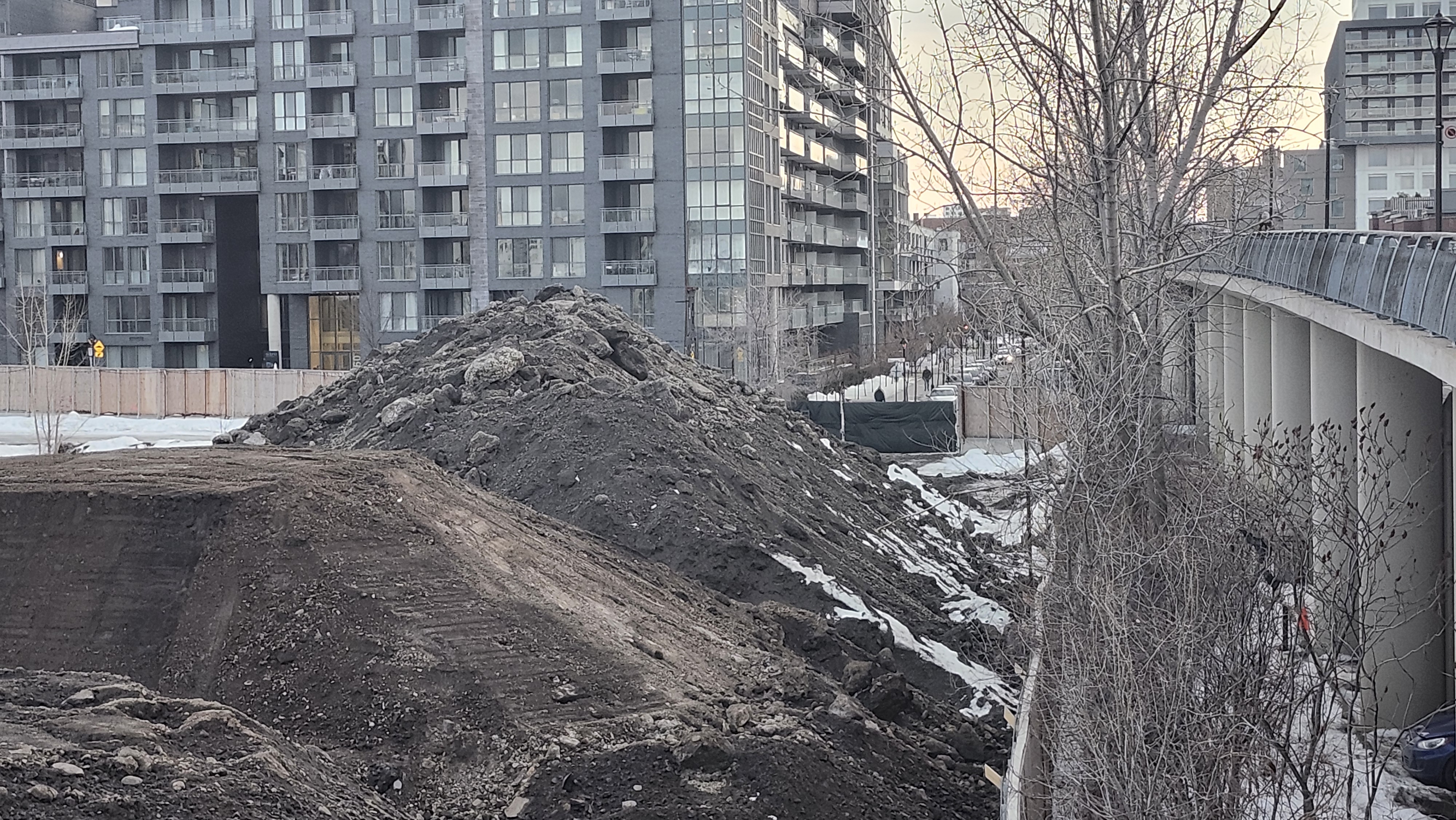 Pour référence l’endroit où il y’a une petite foreuse (et de la neige) au premier plan sur ma photo est au même niveau que atateken, la portions où sont les pelles orange est quelques mètres plus bas (cest globalement l’altitude initiale du site quand il y’avait les entrepôts et le parking Molson) et finalement le grand trou qui je pense est l’empreinte des fondations qu’ils sont encore entrain d’élargir chaque jour.