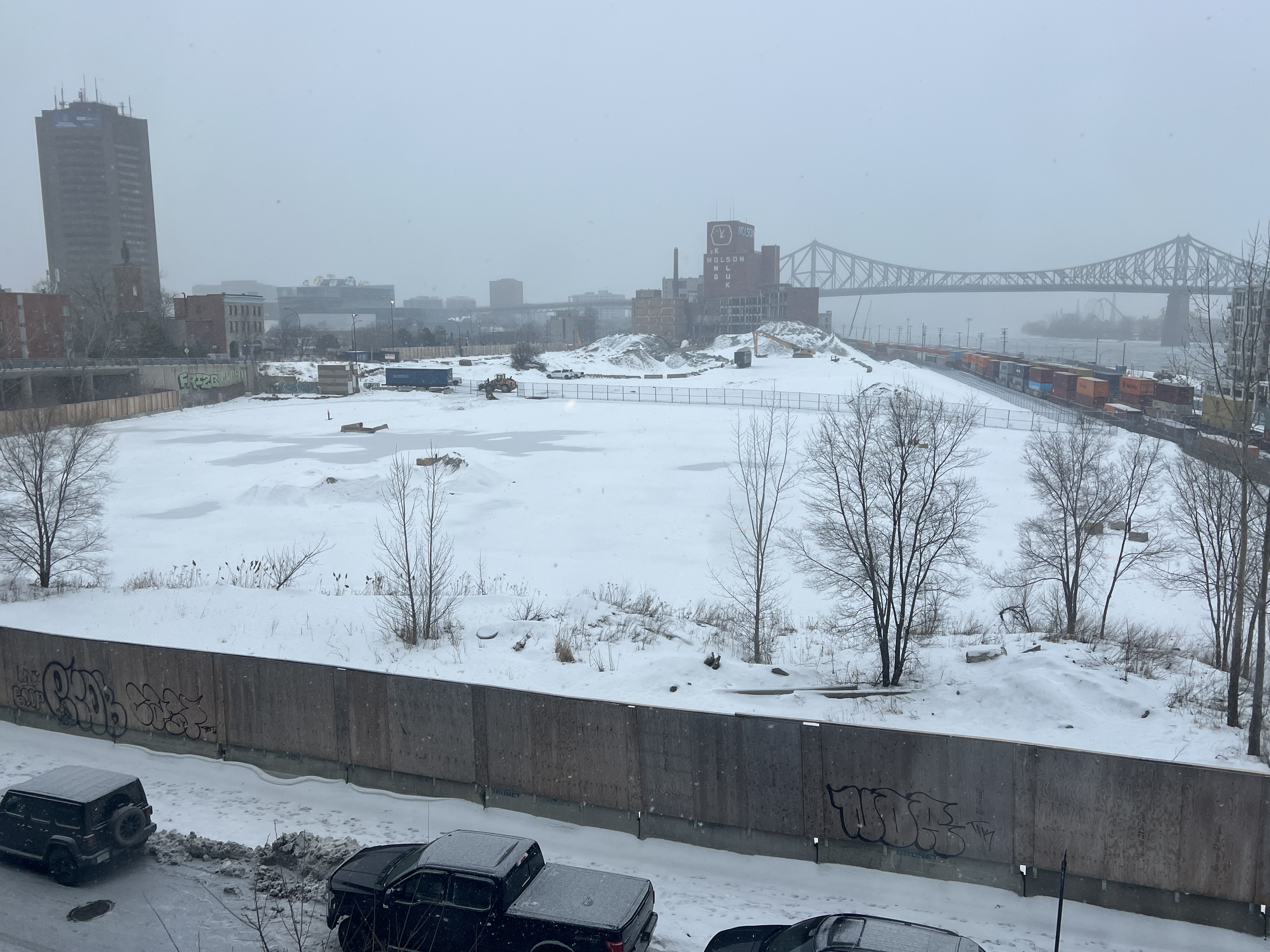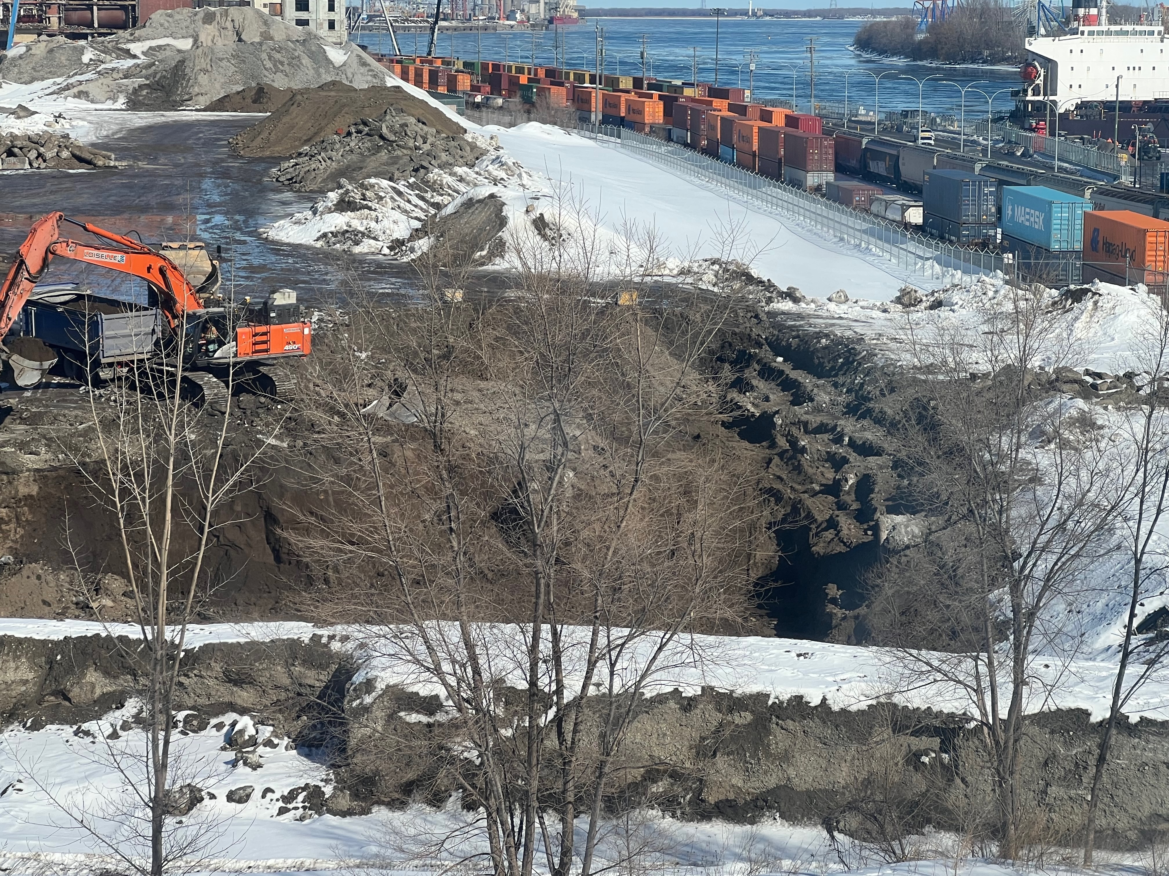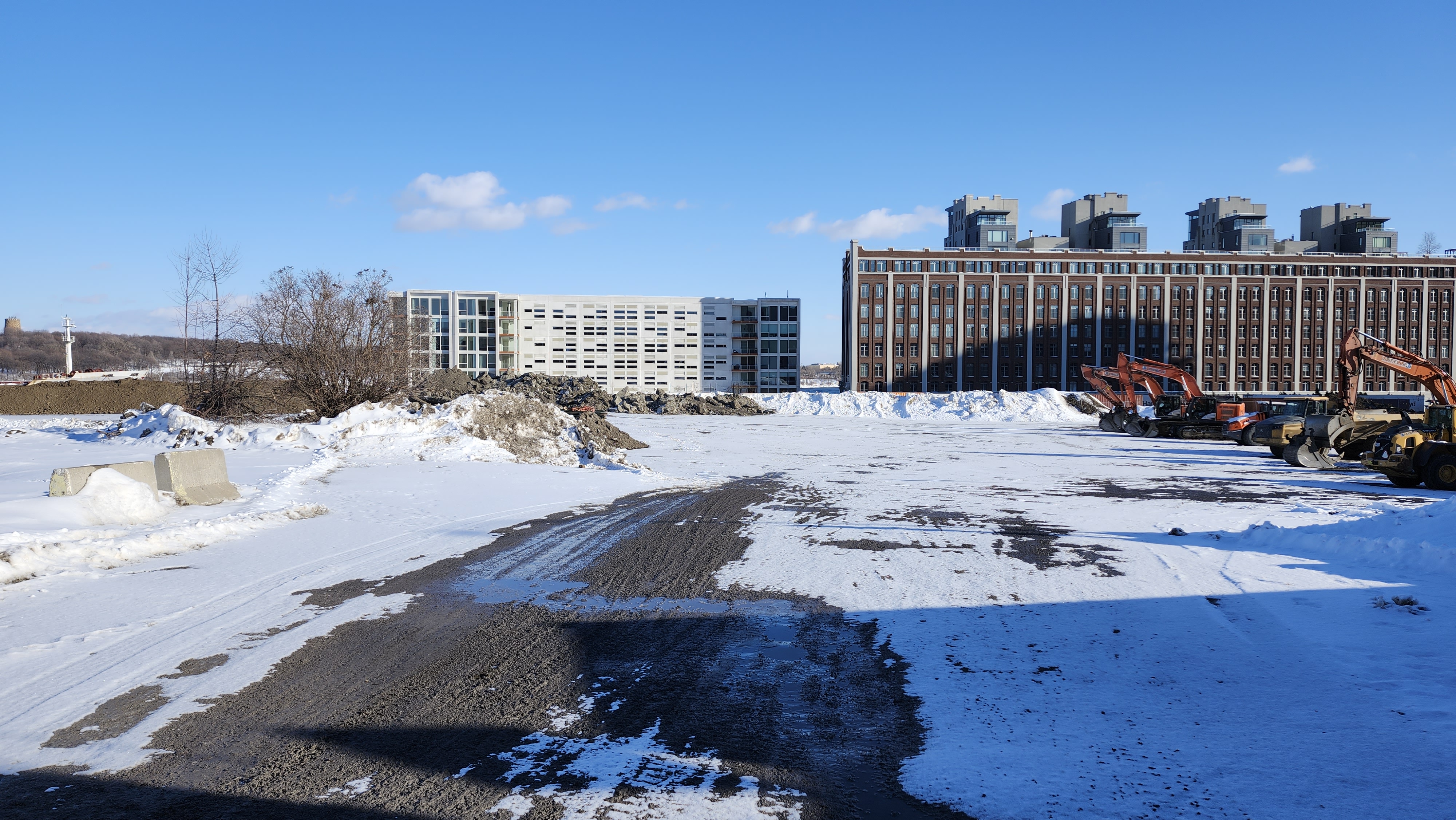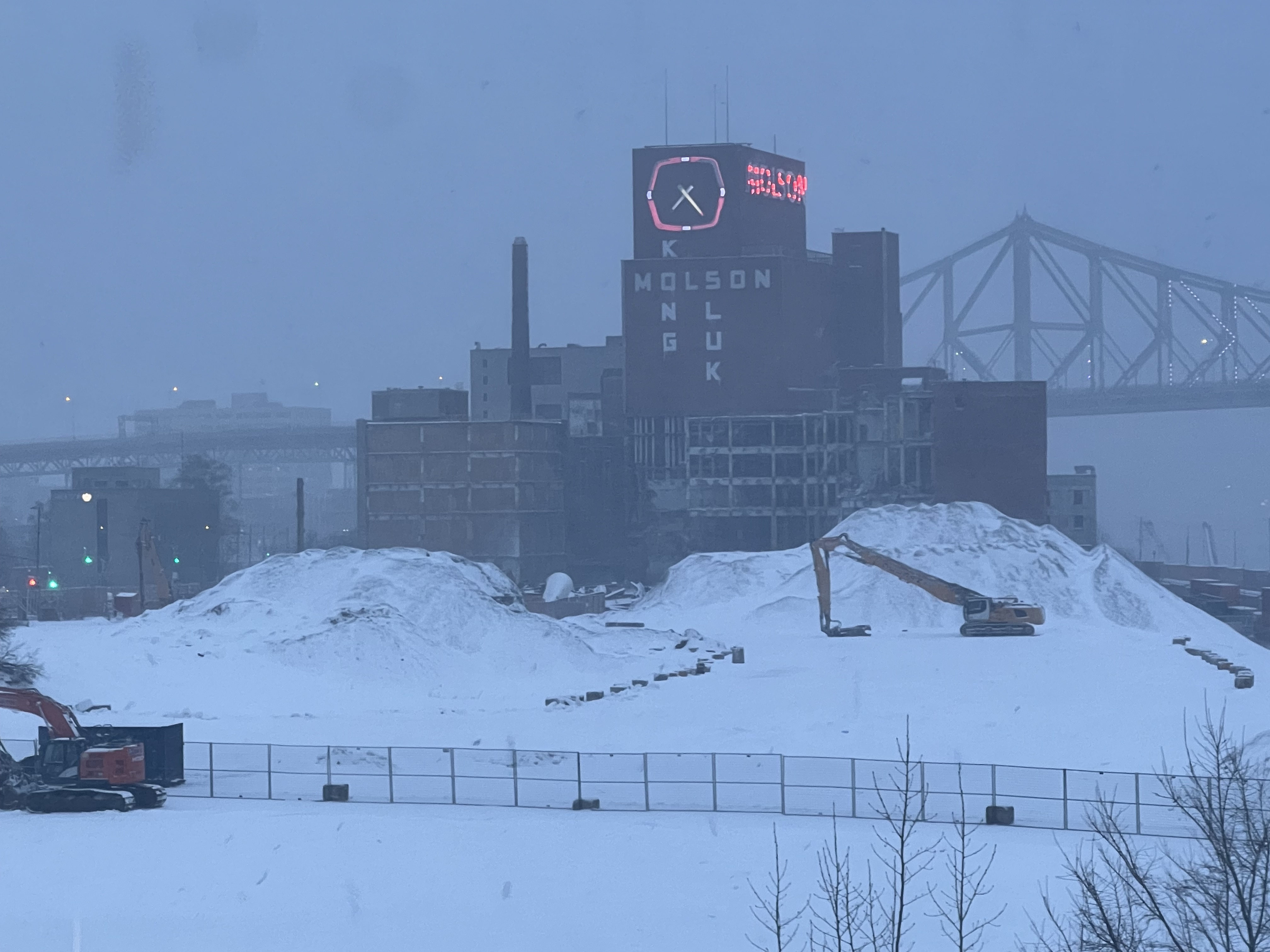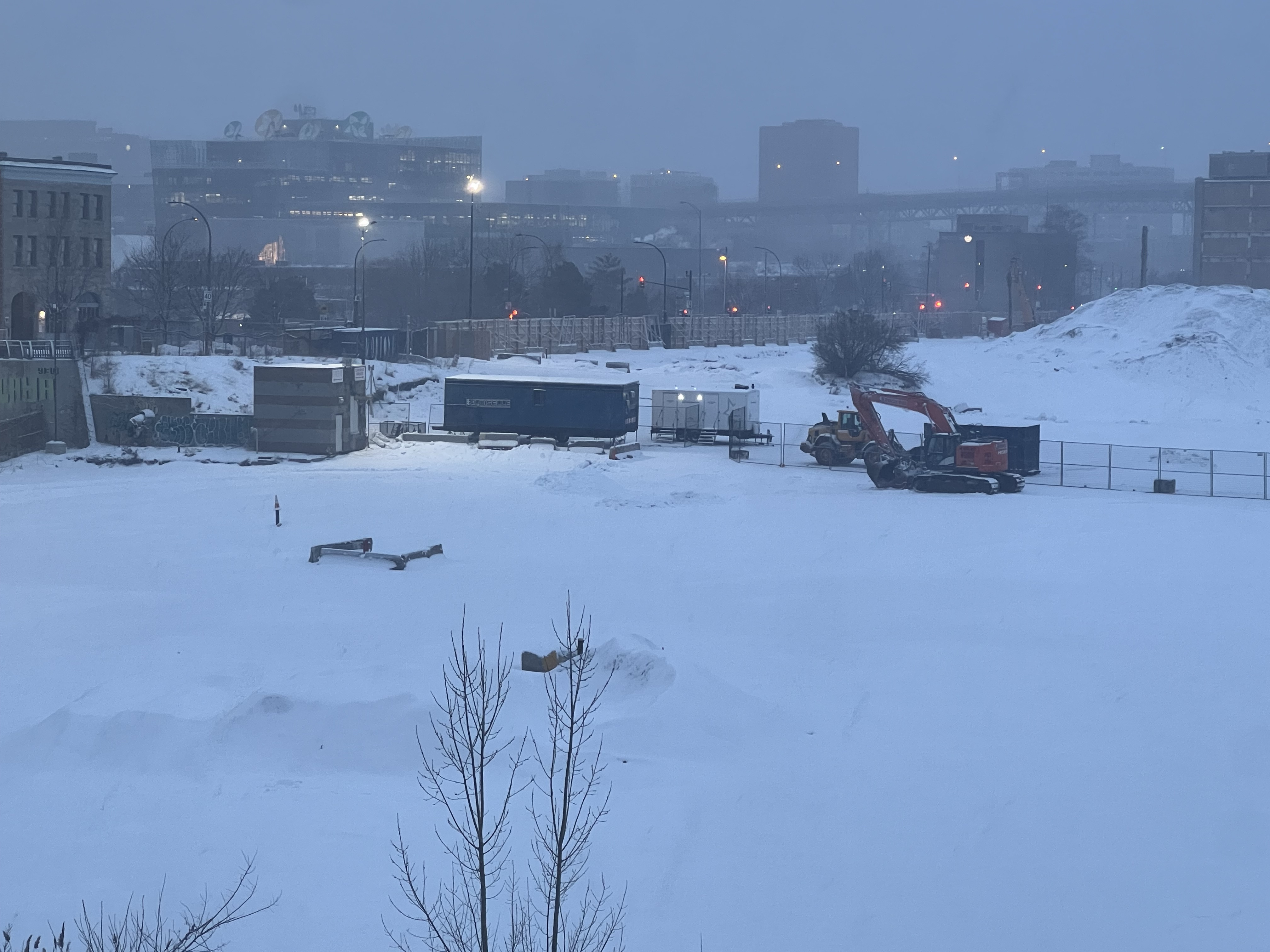 Pour référence l’endroit où il y’a une petite foreuse (et de la neige) au premier plan sur ma photo est au même niveau que atateken, la portions où sont les pelles orange est quelques mètres plus bas (cest globalement l’altitude initiale du site quand il y’avait les entrepôts et le parking Molson) et finalement le grand trou qui je pense est l’empreinte des fondations qu’ils sont encore entrain d’élargir chaque jour.