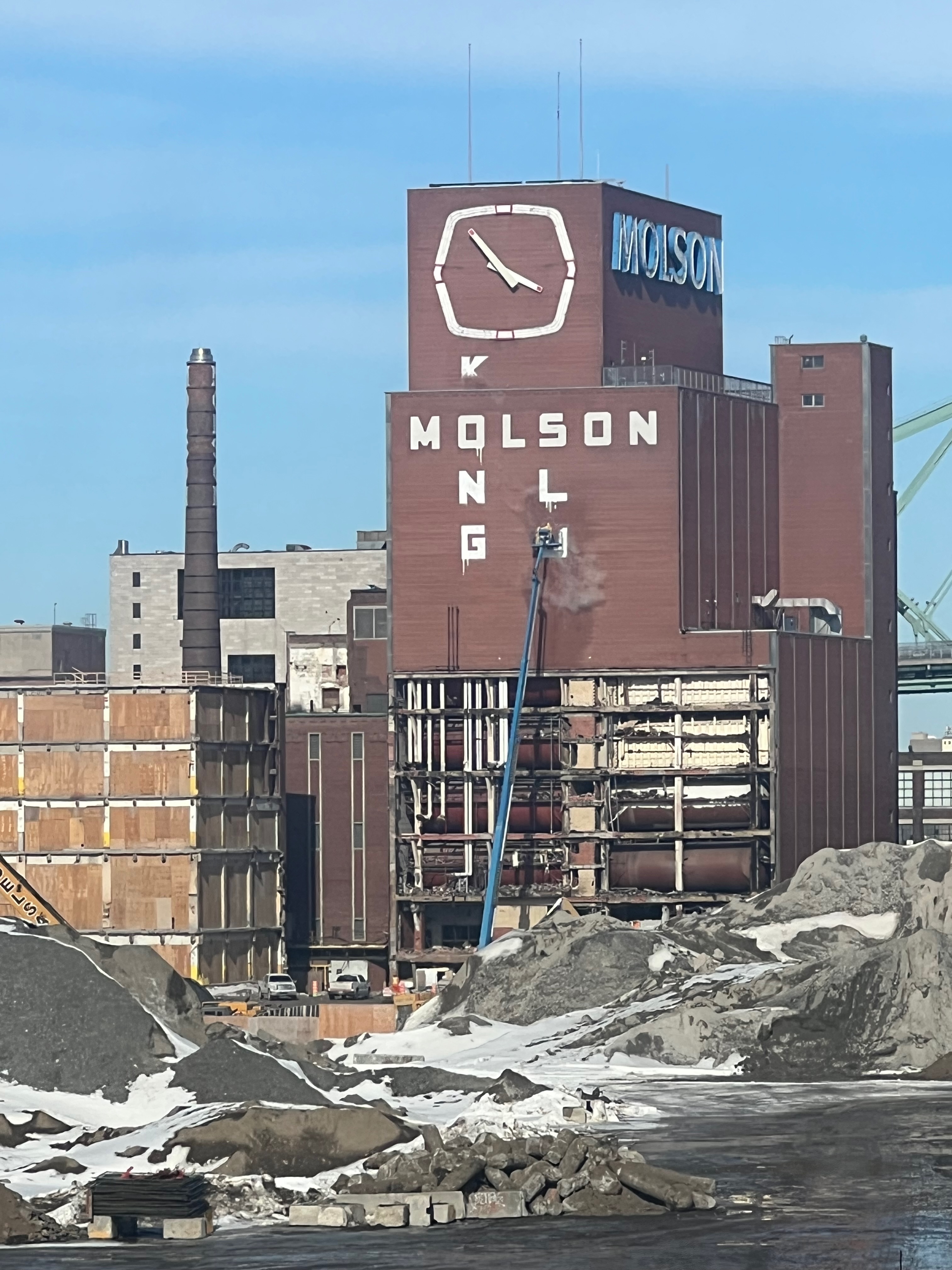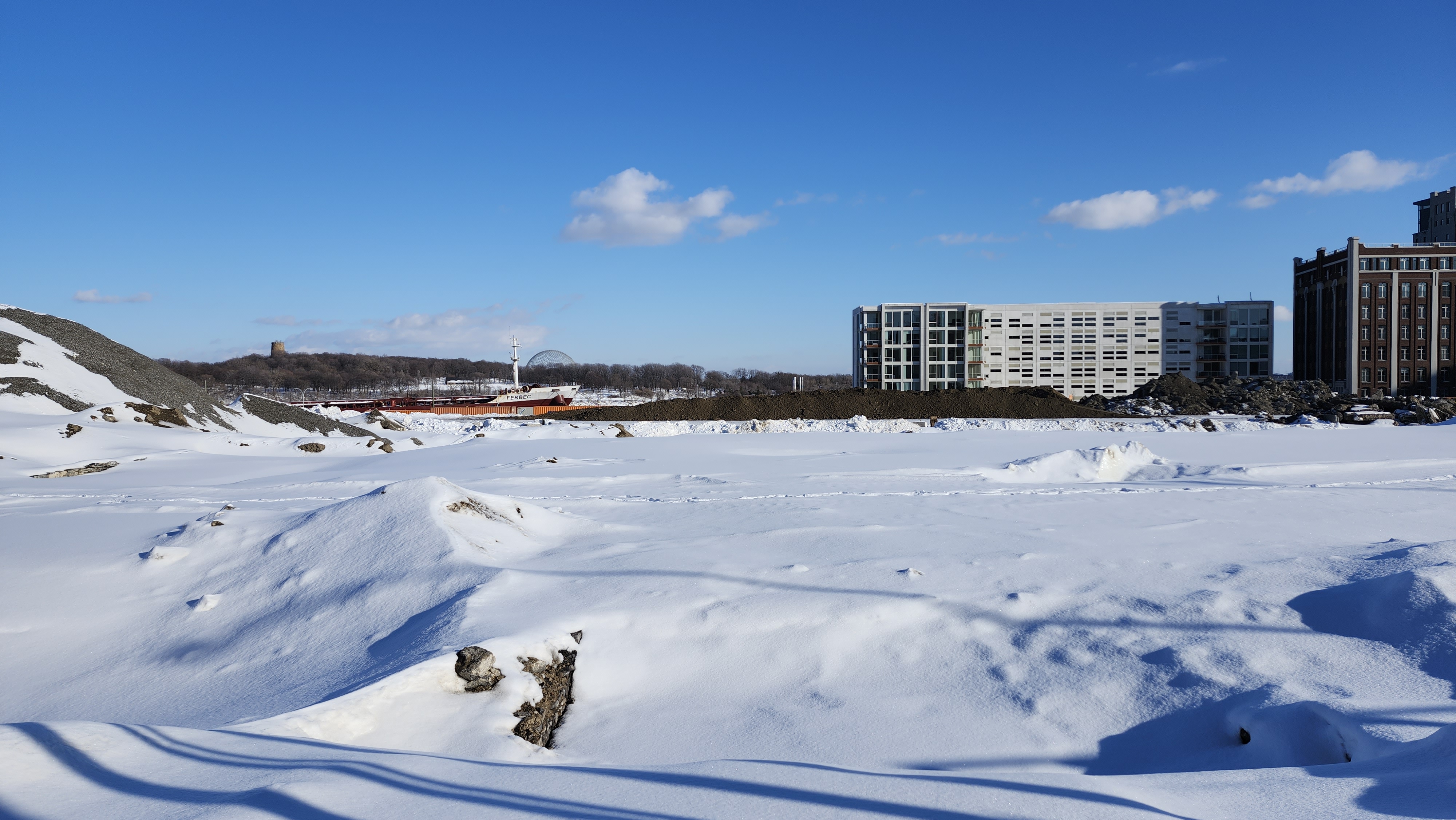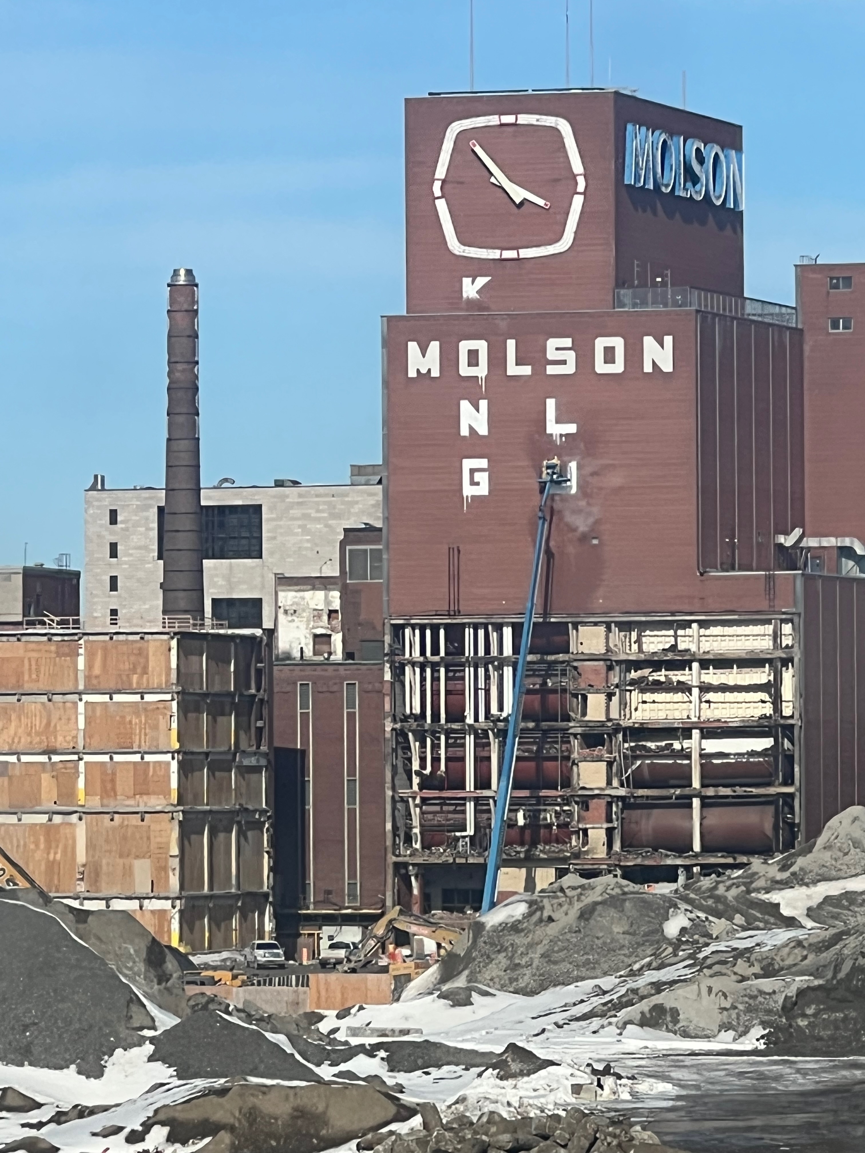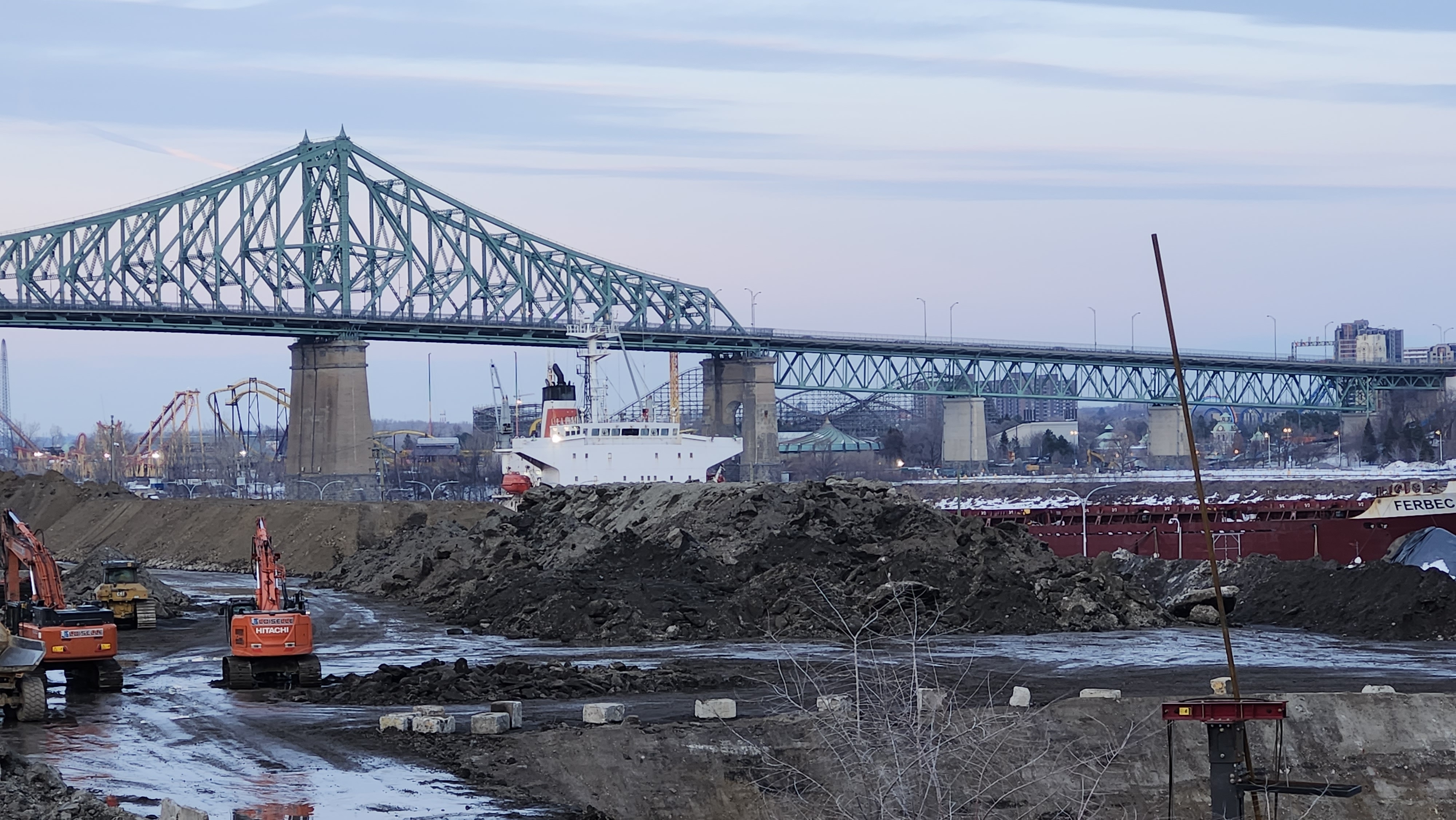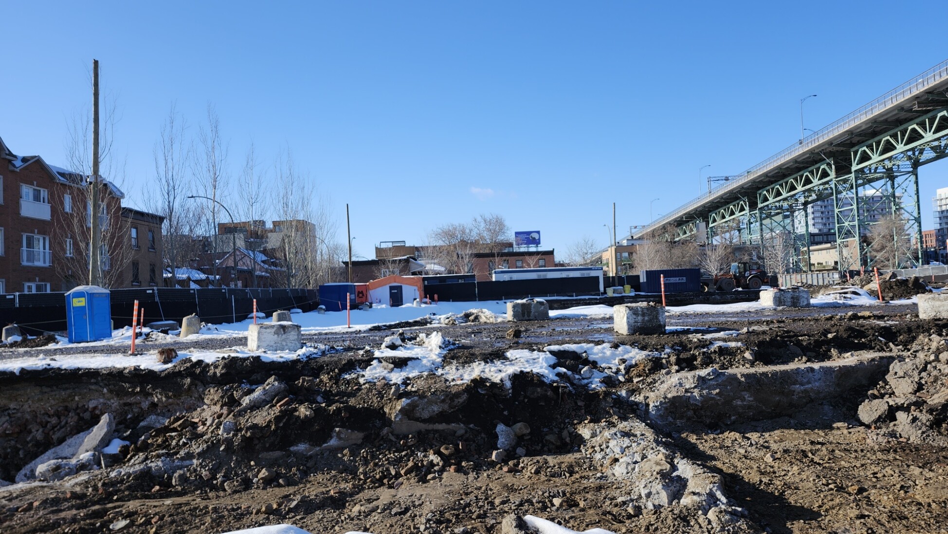 Pour référence l’endroit où il y’a une petite foreuse (et de la neige) au premier plan sur ma photo est au même niveau que atateken, la portions où sont les pelles orange est quelques mètres plus bas (cest globalement l’altitude initiale du site quand il y’avait les entrepôts et le parking Molson) et finalement le grand trou qui je pense est l’empreinte des fondations qu’ils sont encore entrain d’élargir chaque jour.