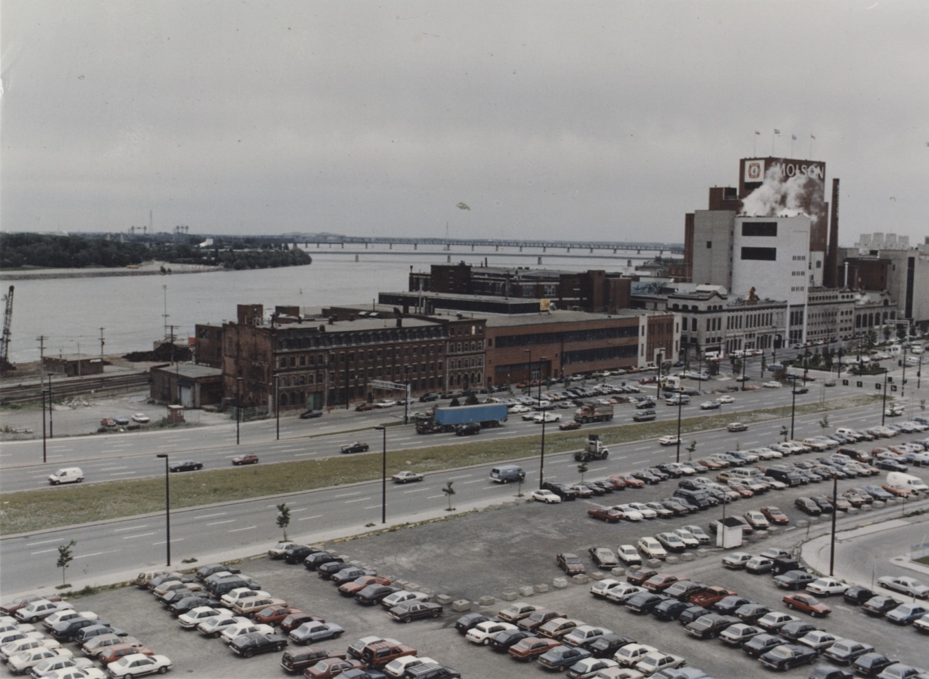 Le site Molson le 13 juin 1989. De belles maisons anciennes ont été démolies dans les années 90 pour offrir un stationnement à U-Haul. Des drapeaux ornaient les mats au-dessus du bâtiment principal.