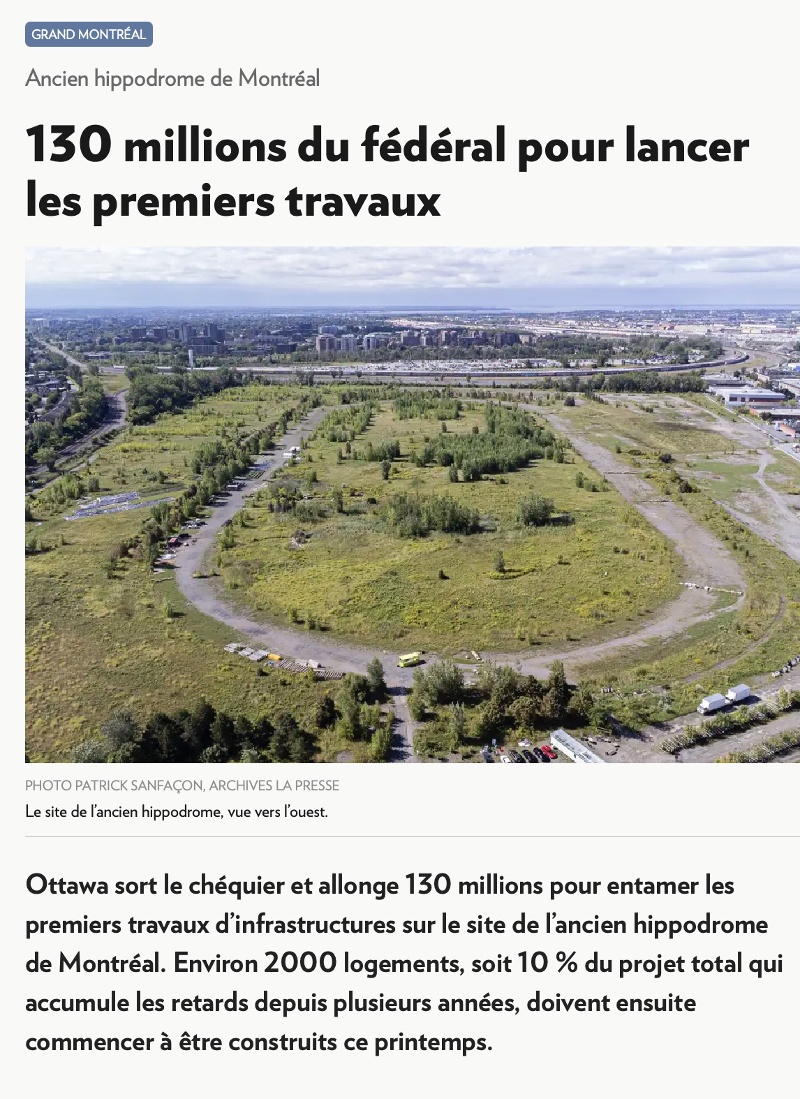 Ottawa sort le chéquier et allonge 130 millions pour entamer les premiers travaux d’infrastructures sur le site de l’ancien hippodrome de Montréal. Environ 2000 logements, soit 10 % du projet total qui accumule les retards depuis plusieurs années, doivent ensuite commencer à être construits ce printemps.