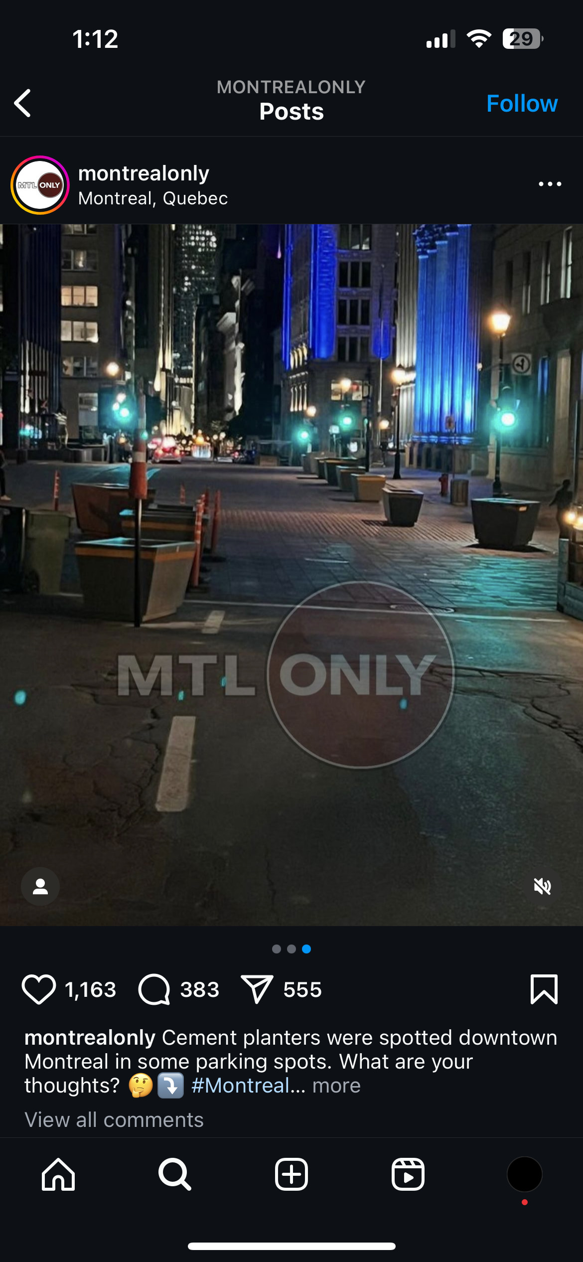 Je ne suis pas sûr mais je crois que la publication sur Instagram du compte très populaire de «montrealonly» représente une partie du projet de la piétonnisation permanente autour de la basilique Notre Dame. Je crois que les jardiniers de ciment sur la photo viennent tout juste d’être placé. Malheureusement, avec peu de contexte et d’explications sur le projet de la part du compte montrealonly les commentaires sous la publication sont remplis de désinformation: