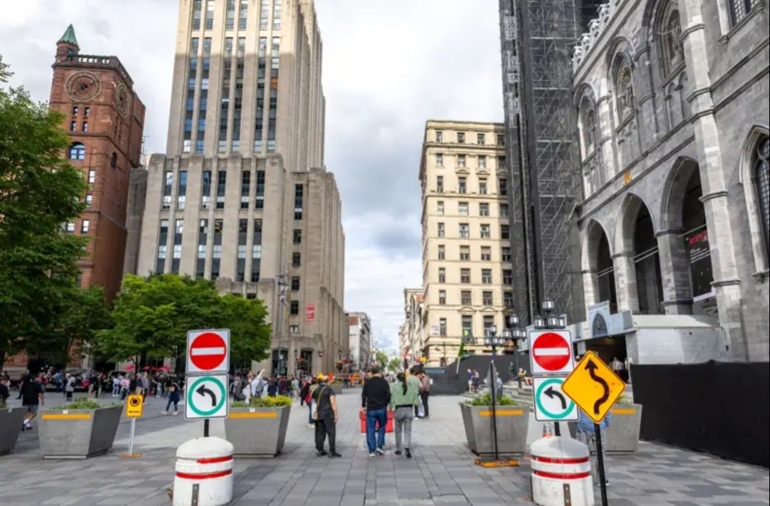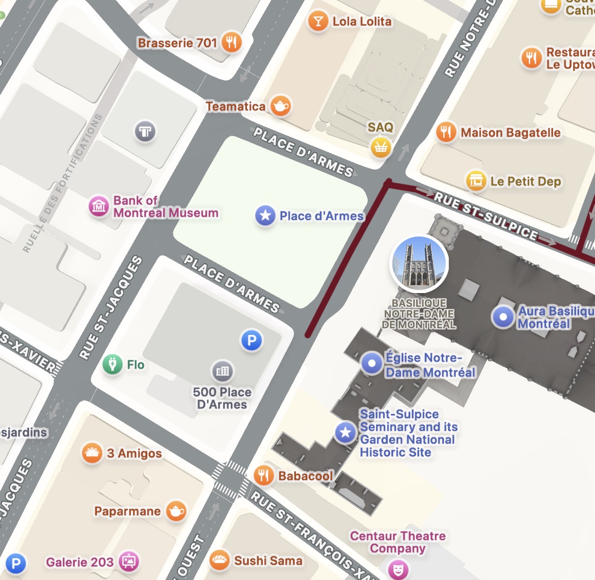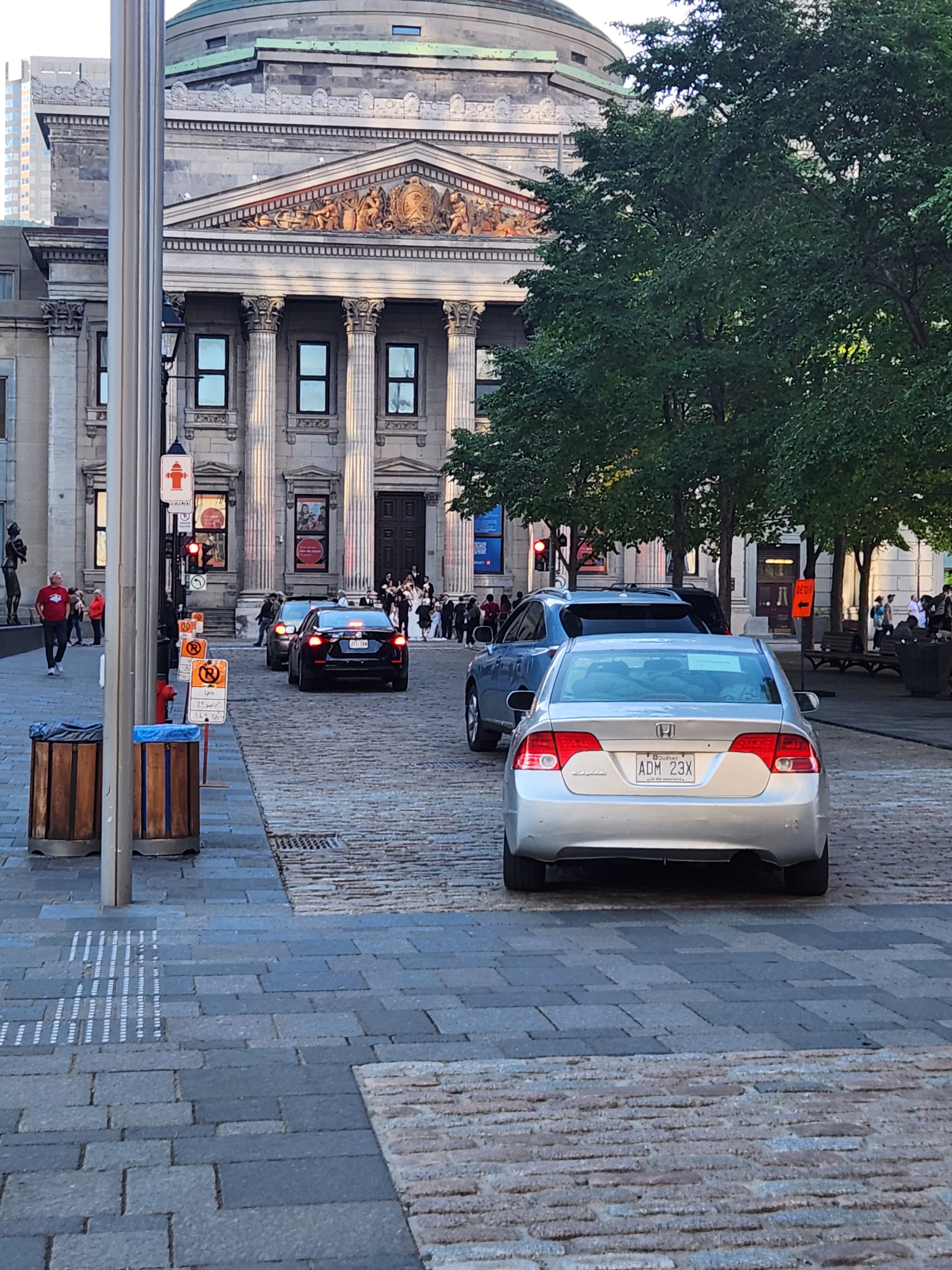Je suis quand même surpris, je croyais qu’on avait piétonnisé les rives de la Place d’Armes, mais en fait c’est juste le petit bout face à Basilique. Le traffic est donc maintenant détourné face au 500 Place d’Armes.