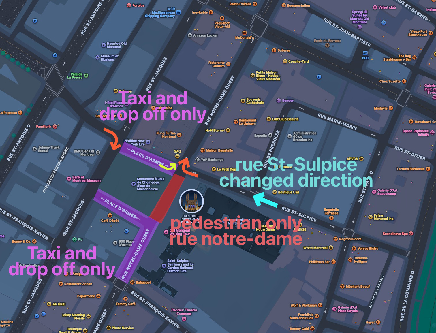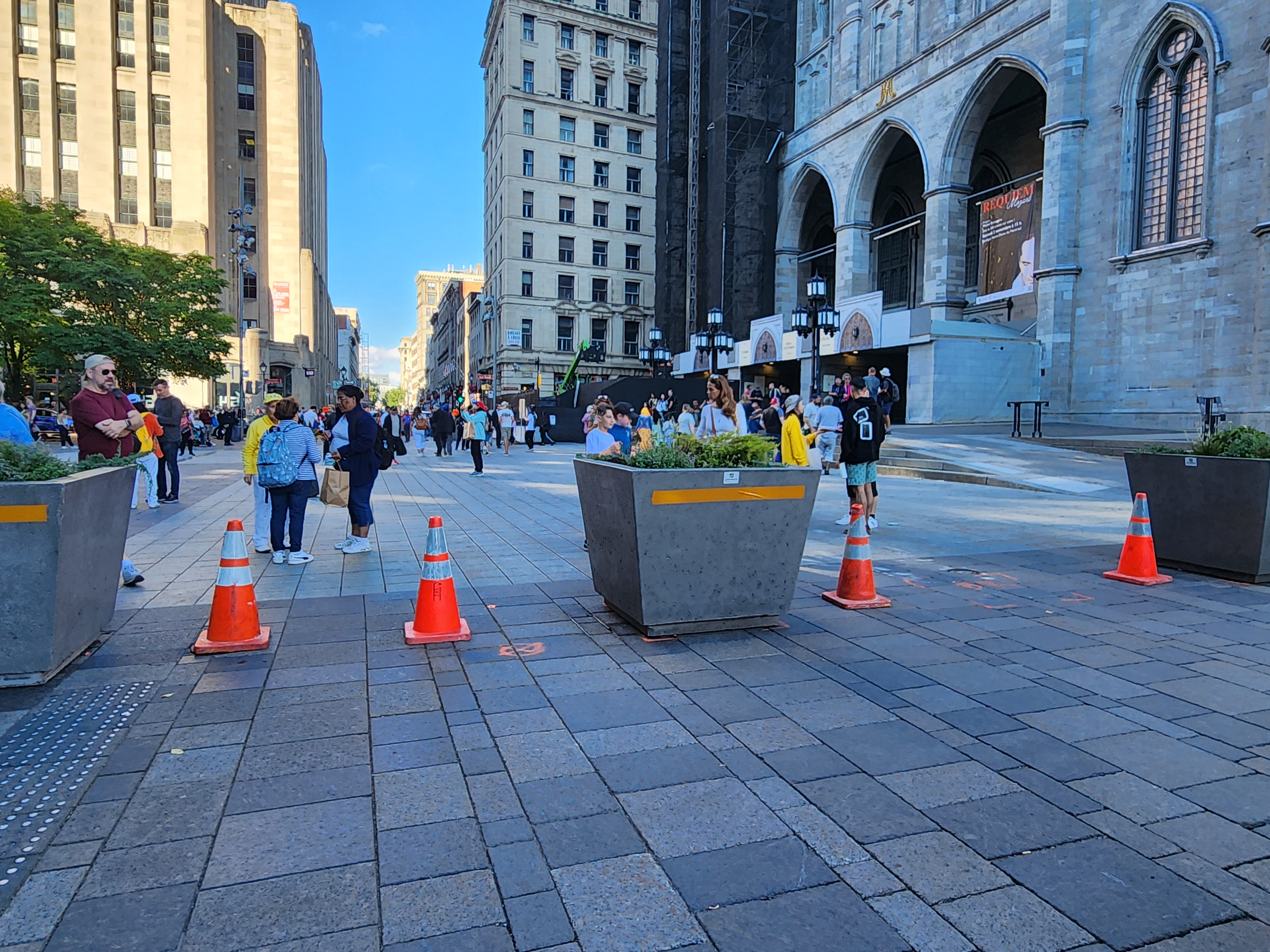 Spécifiquement devant Notre-Dame, c’est plus que symbolique, c’est un secteur avec de nombreux conflits j’ai l’impression. Pas que je sois en désaccord avec ton approche, mais spécifiquement ce tronçon semble avoir une problématique de sécurité. Chaque fois que je vais là, les touristes sont surpris en bougeant entre la basilique et la place publique de se ramasser avec la circulation.