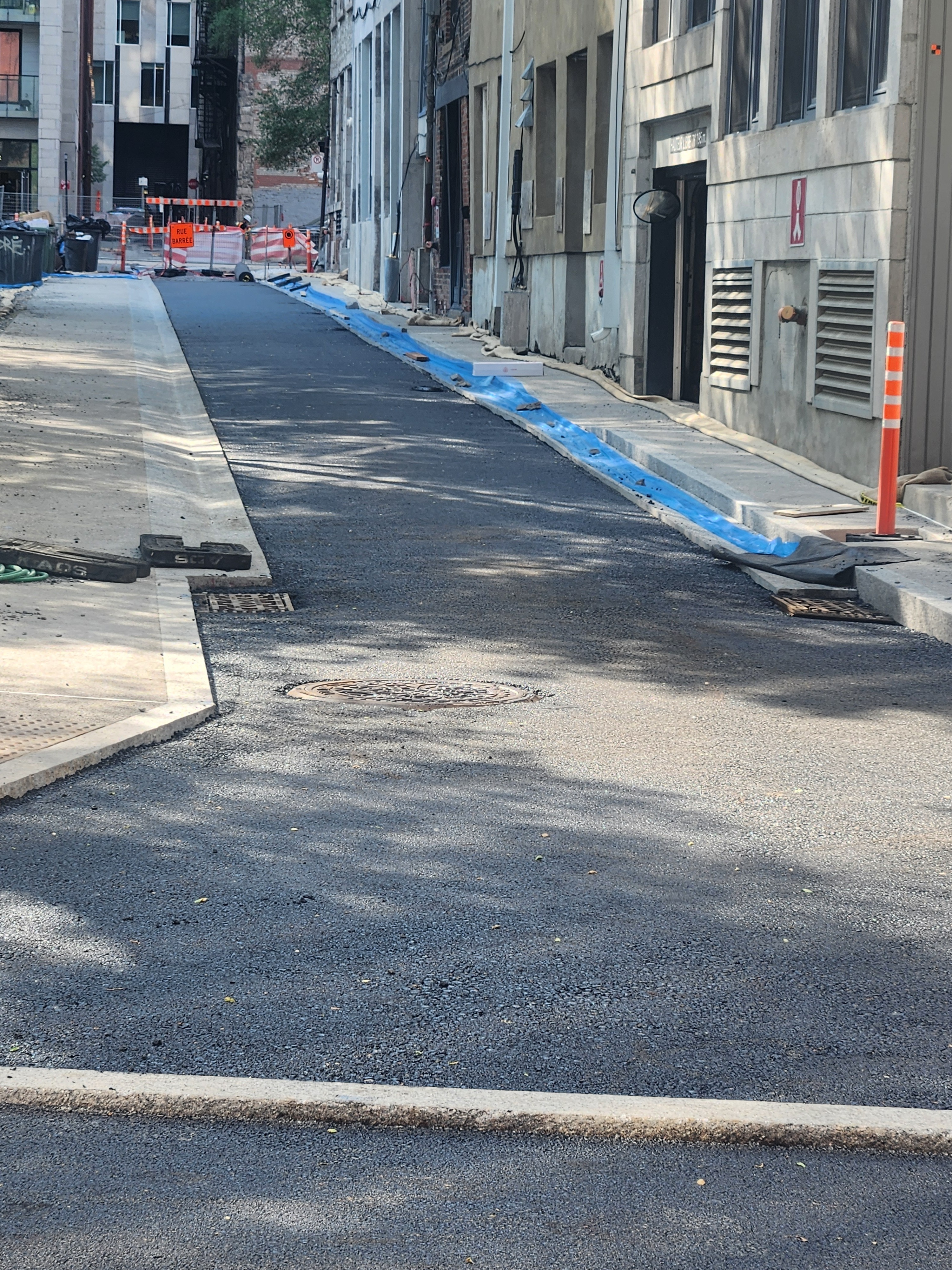 Après des trottoirs en béton granulé et des bordures en granit, la rue de Longueuil est finalement complétée en simple bitume noir. On semble avoir la combinaison d’un pari qualitatif rehaussé (trottoirs et bordures) et standard (rue bitume) dans le même projet.