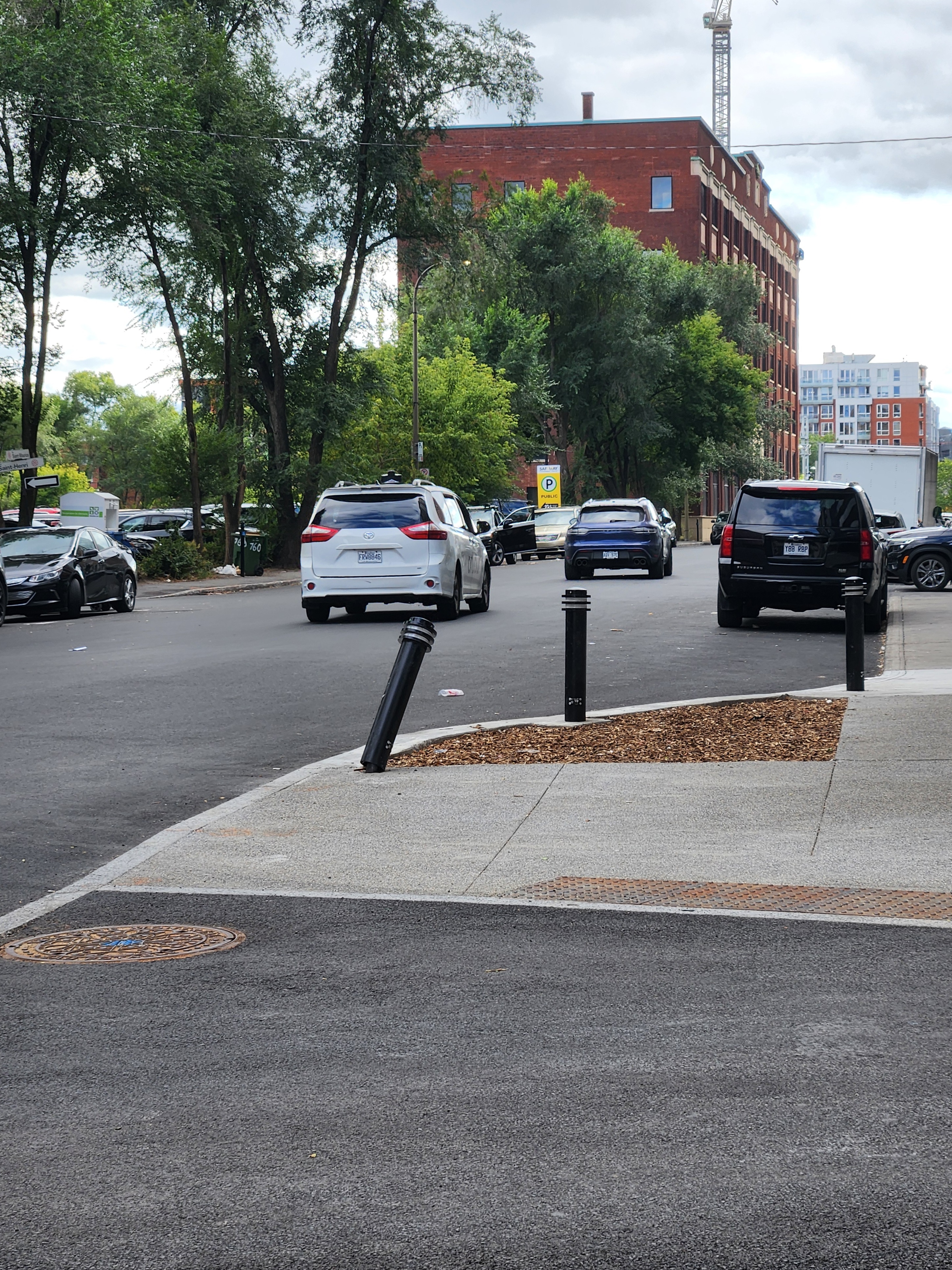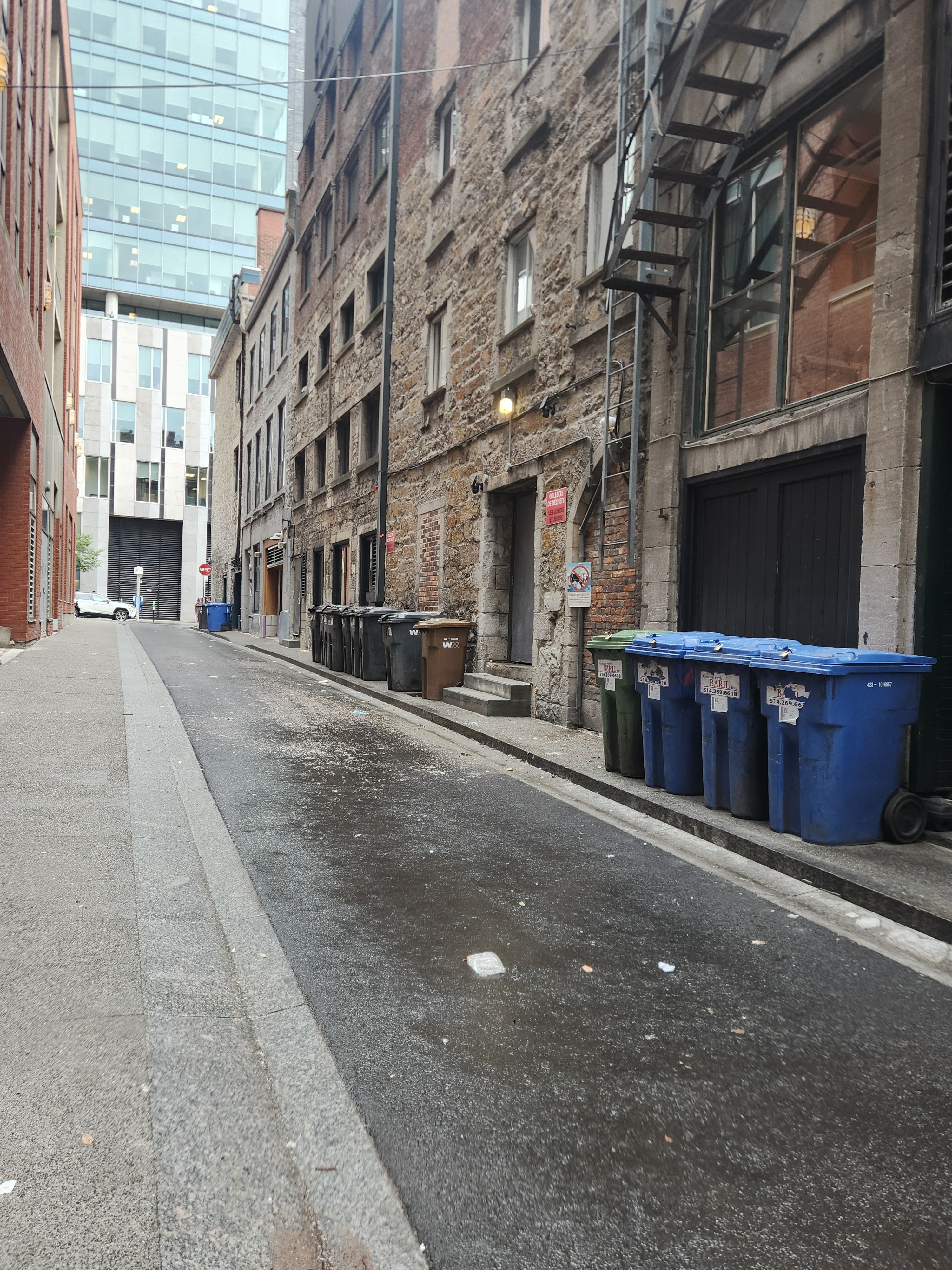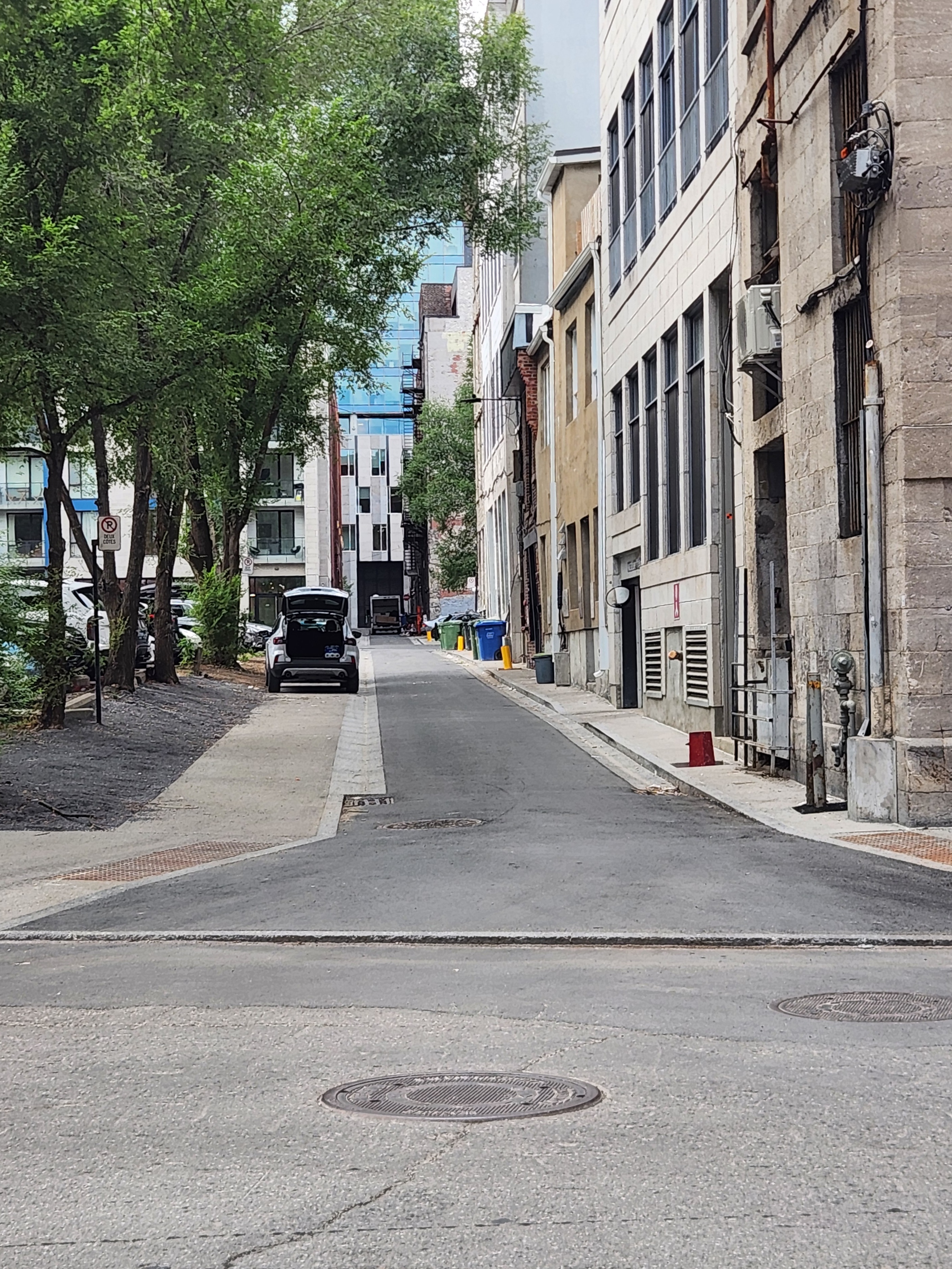 La rue de Longueuil a certainement une “vibe” de ruelle avec ses bacs à recyclage qui sont posés en bordure de trottoir de façon permanente. Est-ce légal sur une “rue”? L’aménagement a au moins permis de mettre un trottoir apprécié du côté ouest. Le bollard accroché a été redressé à peine 4 jours après avoir été signalé dans ce fil sur Agora ![]()