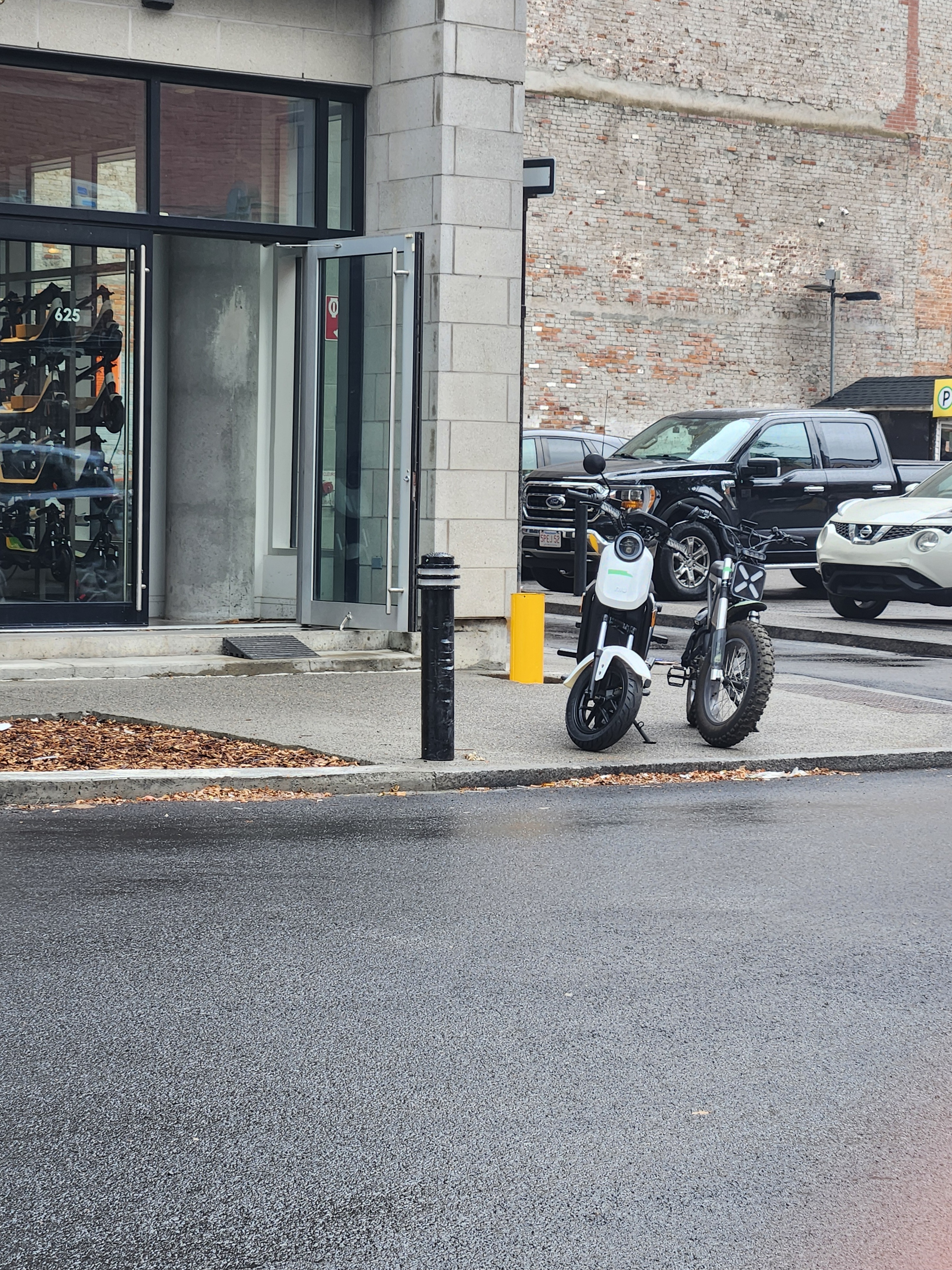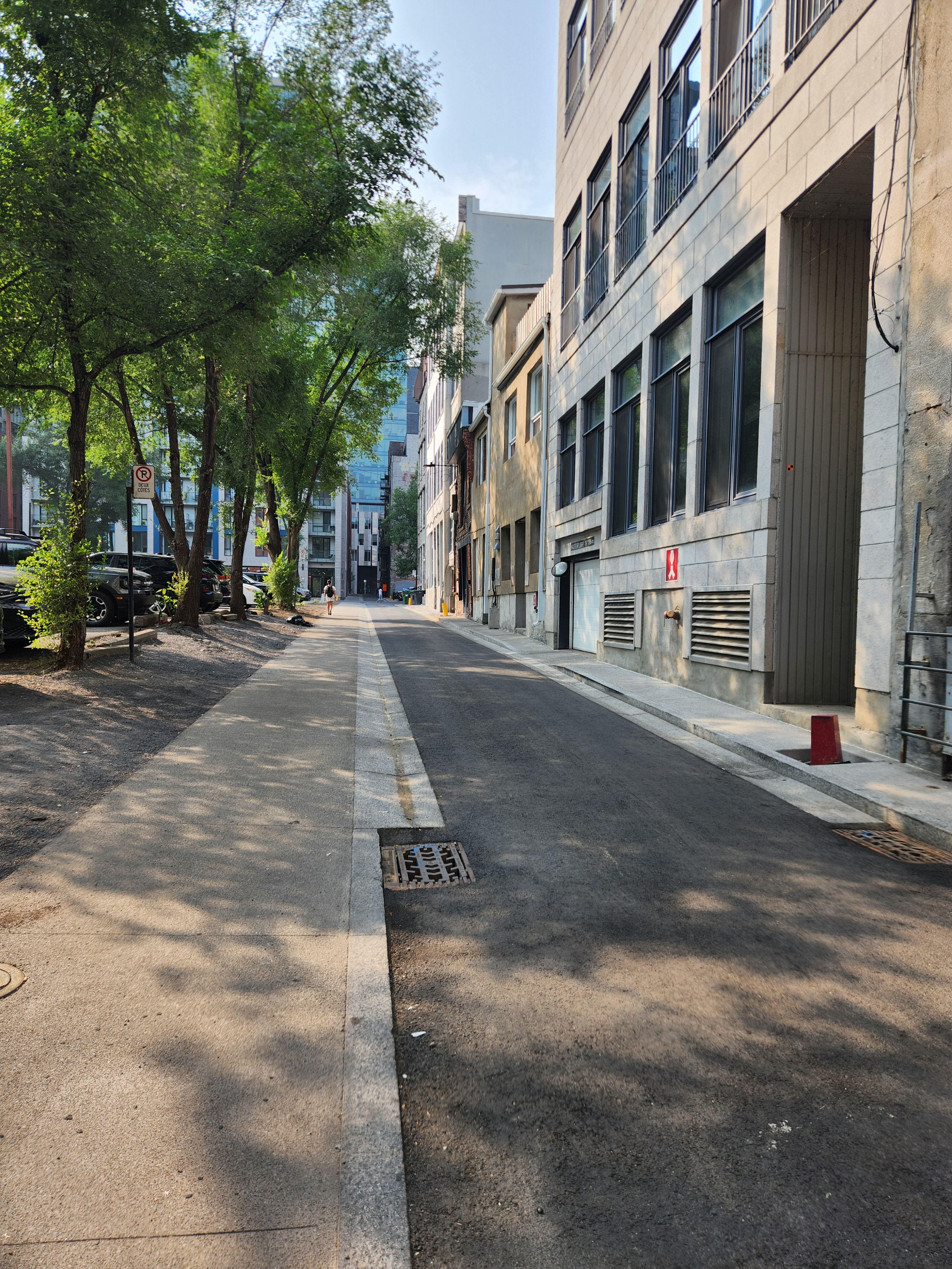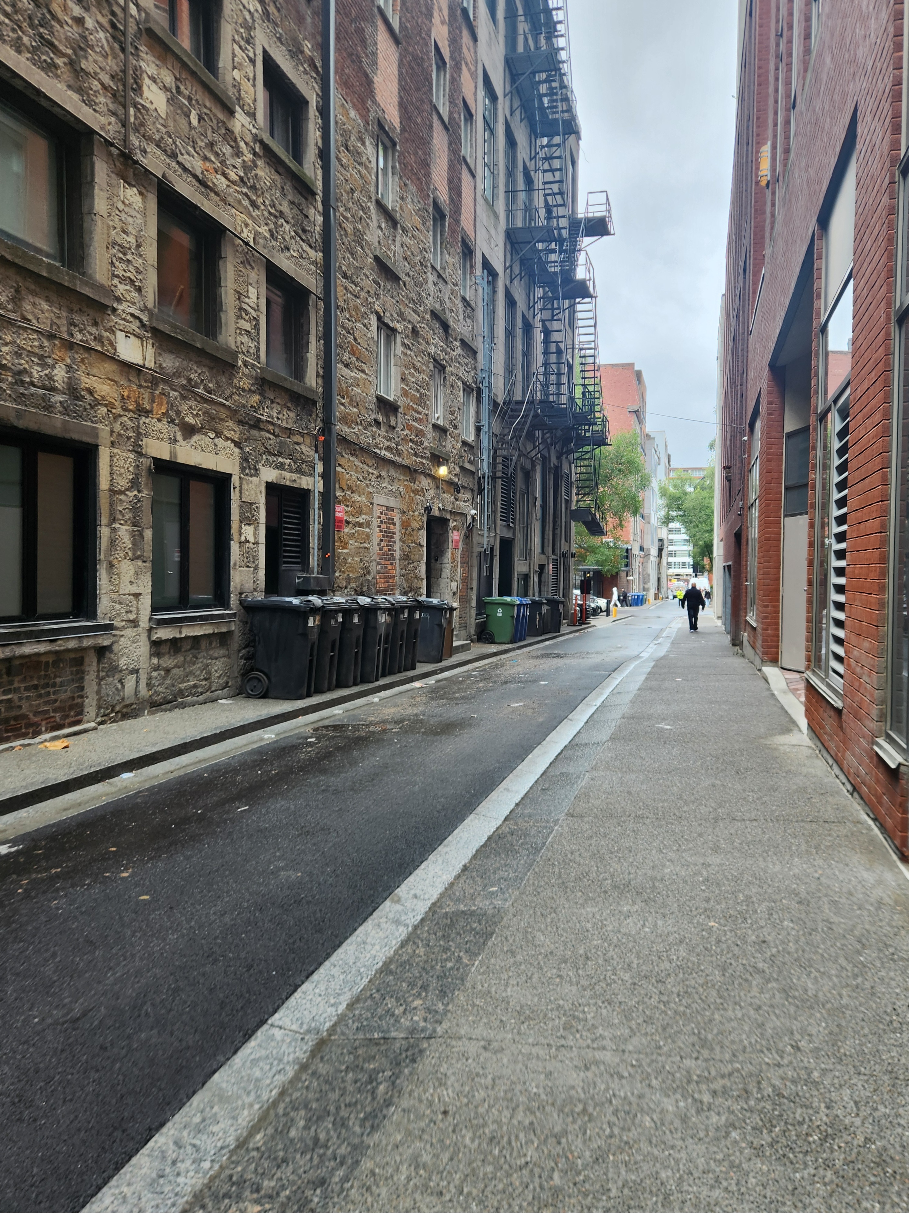 La rue de Longueuil a certainement une “vibe” de ruelle avec ses bacs à recyclage qui sont posés en bordure de trottoir de façon permanente. Est-ce légal sur une “rue”? L’aménagement a au moins permis de mettre un trottoir apprécié du côté ouest. Le bollard accroché a été redressé à peine 4 jours après avoir été signalé dans ce fil sur Agora ![]()