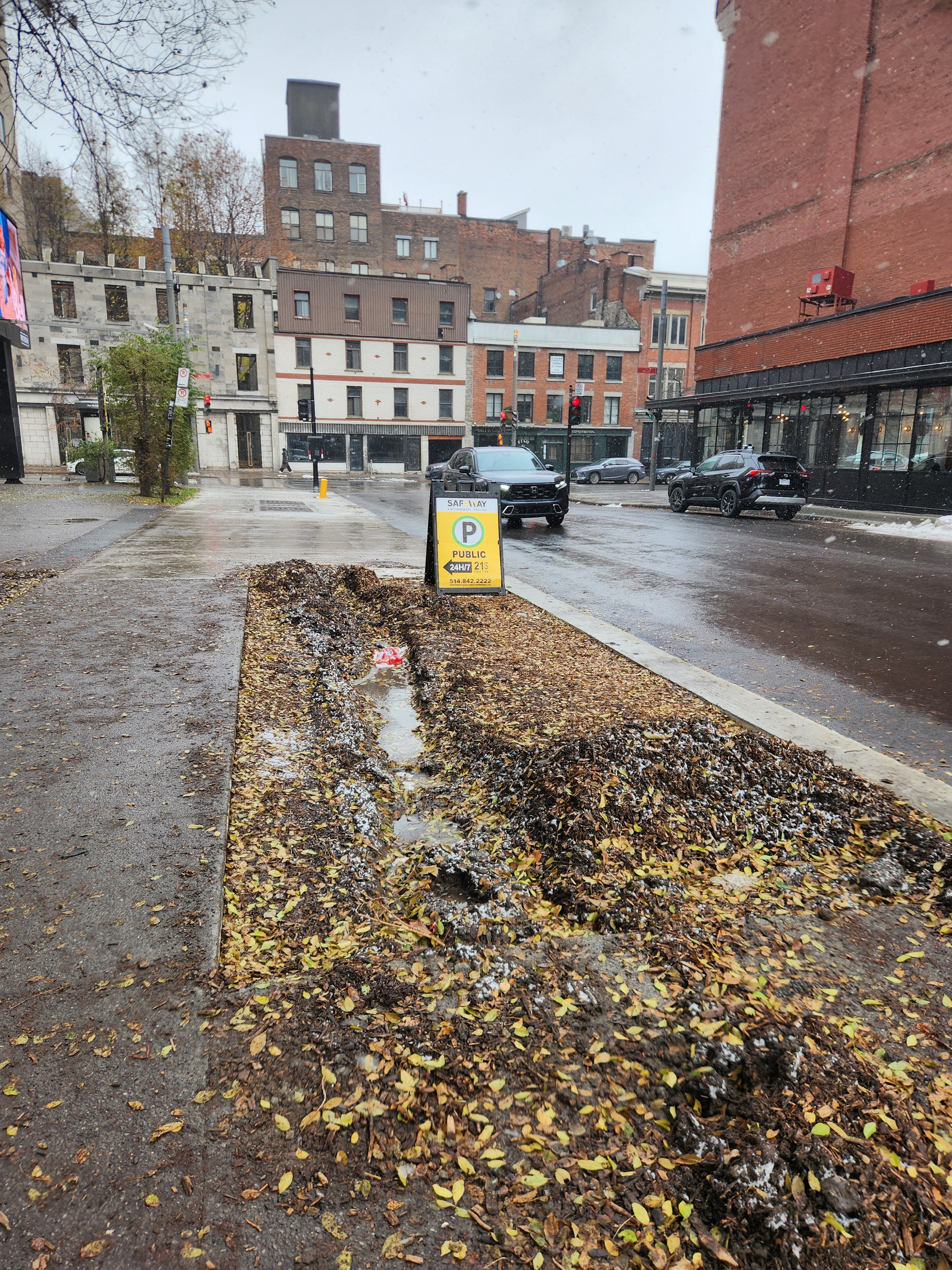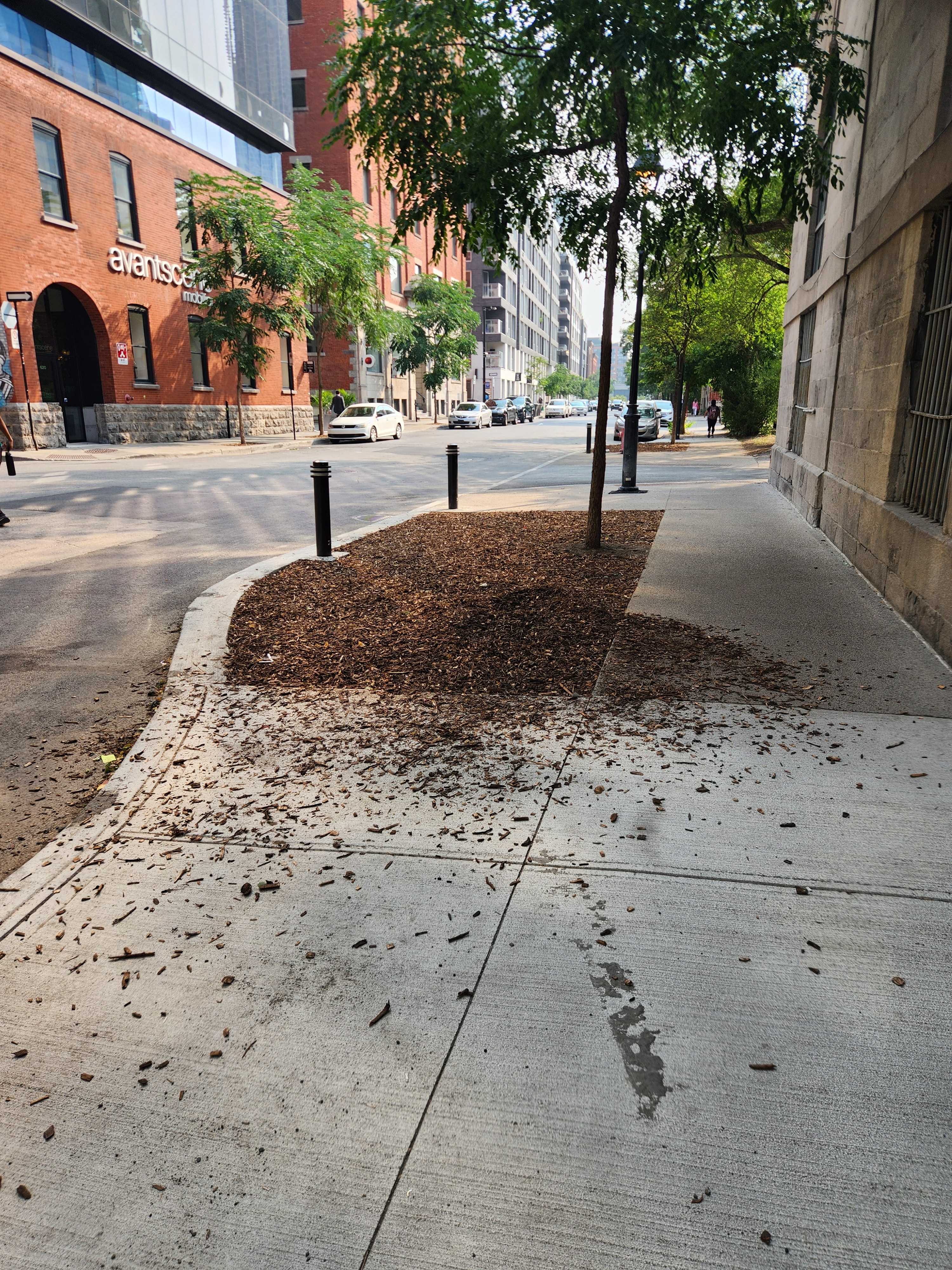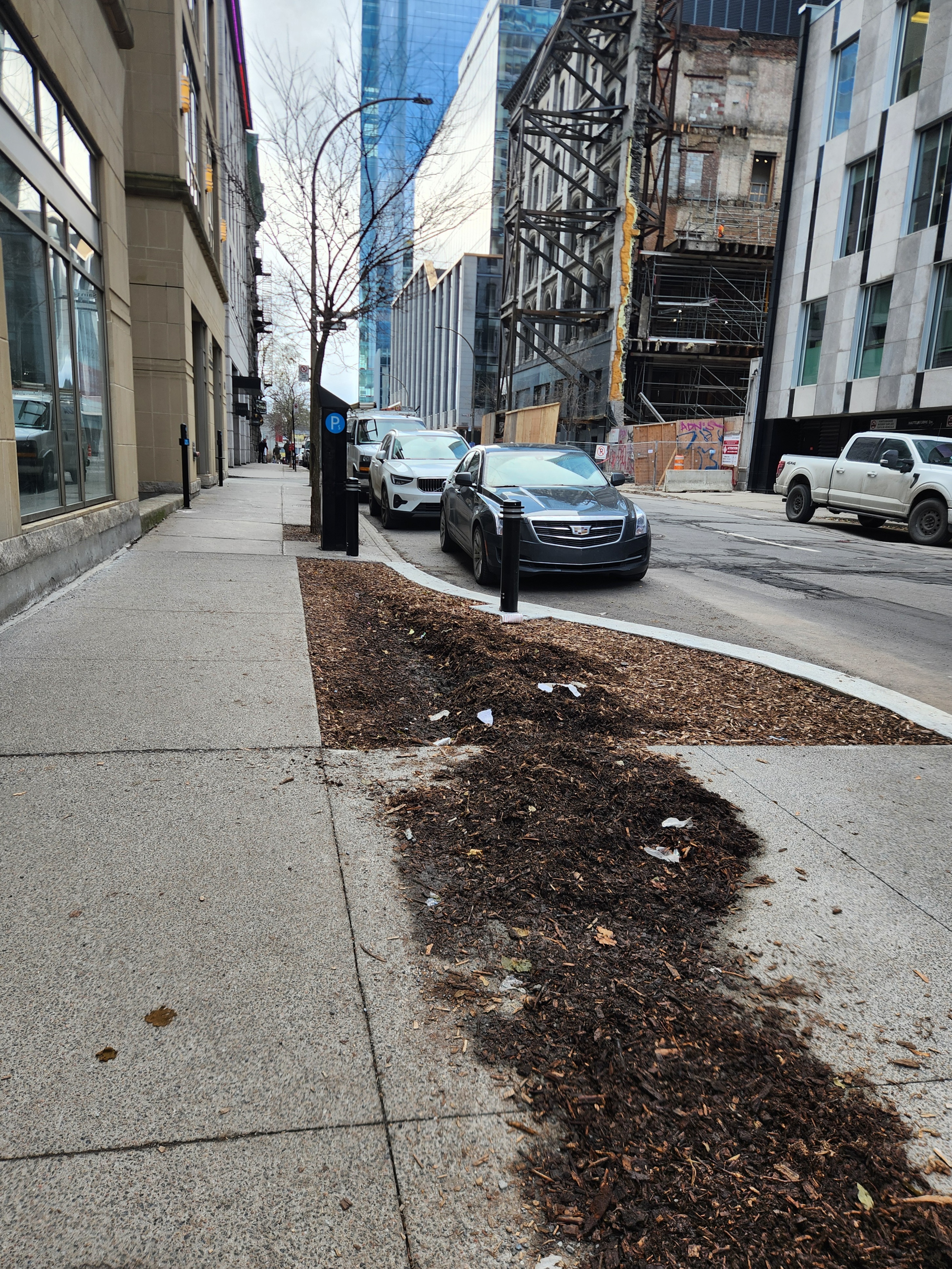 Les nouvelles fosses surdimentionnées connexes à la rue de Longueuil ne sont pas ratées par les chenillettes, ici face à la rue Notre-Dame. Les végétaux n’ont heureusement pas encore été plantés. Je me demande si la largeur des nouvelles fosses pose un enjeu. On a aussi des traces de pneus dans les fosses sur la rue Saint-Maurice.