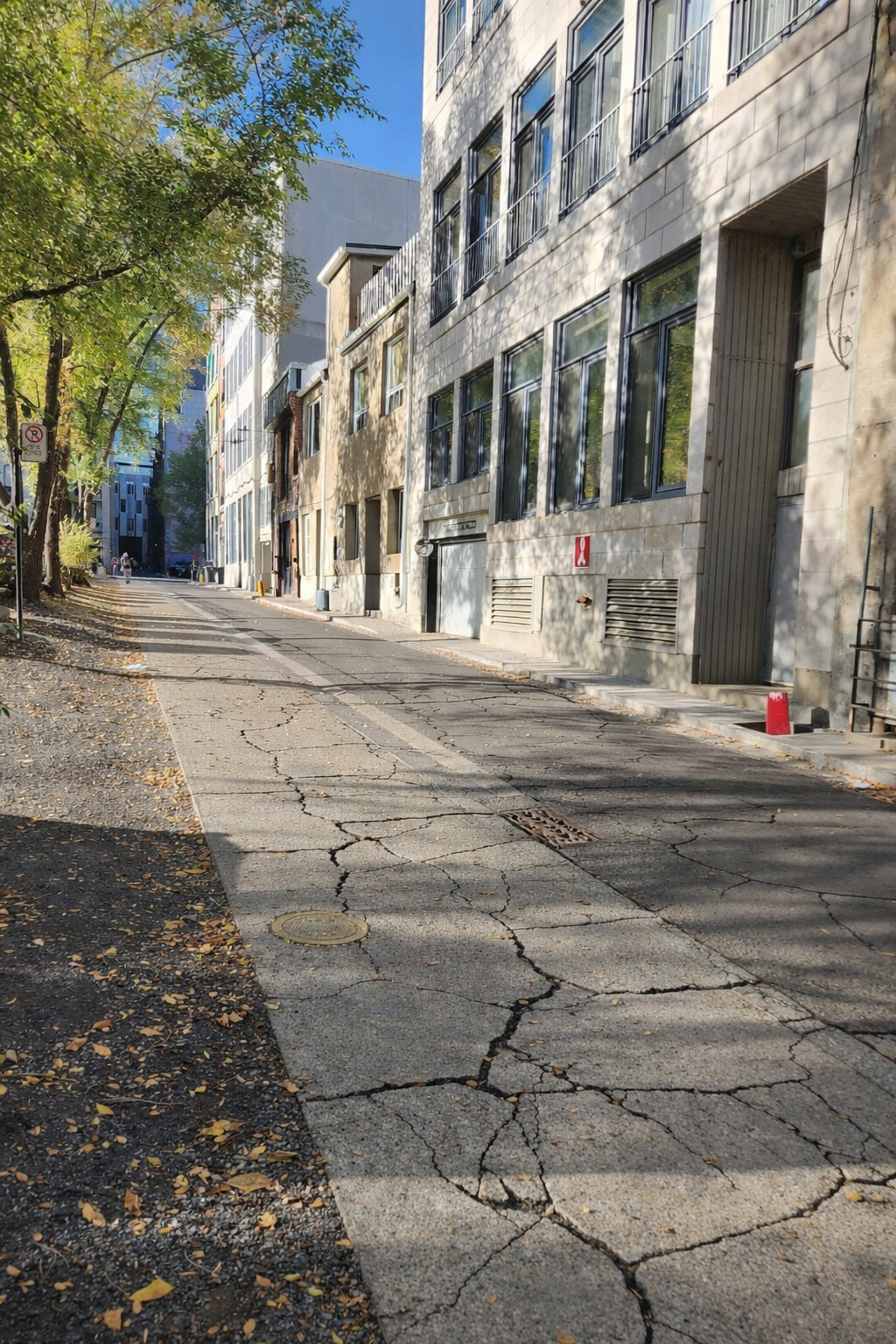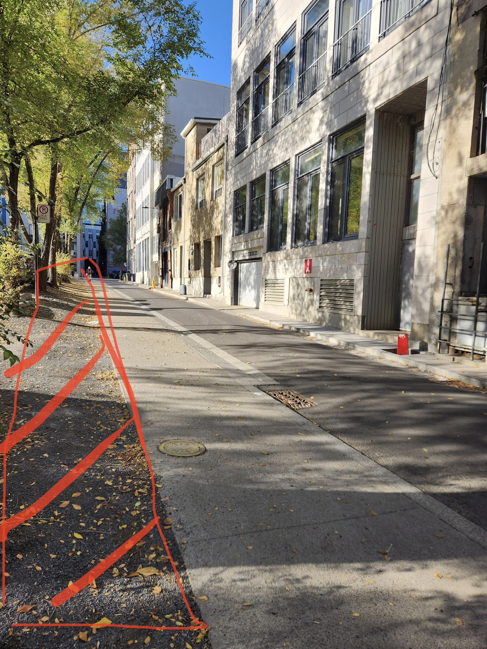 L’espacement entre le bâtiment et le fosse est plus grand que l’espace entre le bâtiment et la fosse d’arbre un peu plus loin. Et a peine plus petit que l’espacement entre le bâtiment et le parcomètre devant l’arbre.