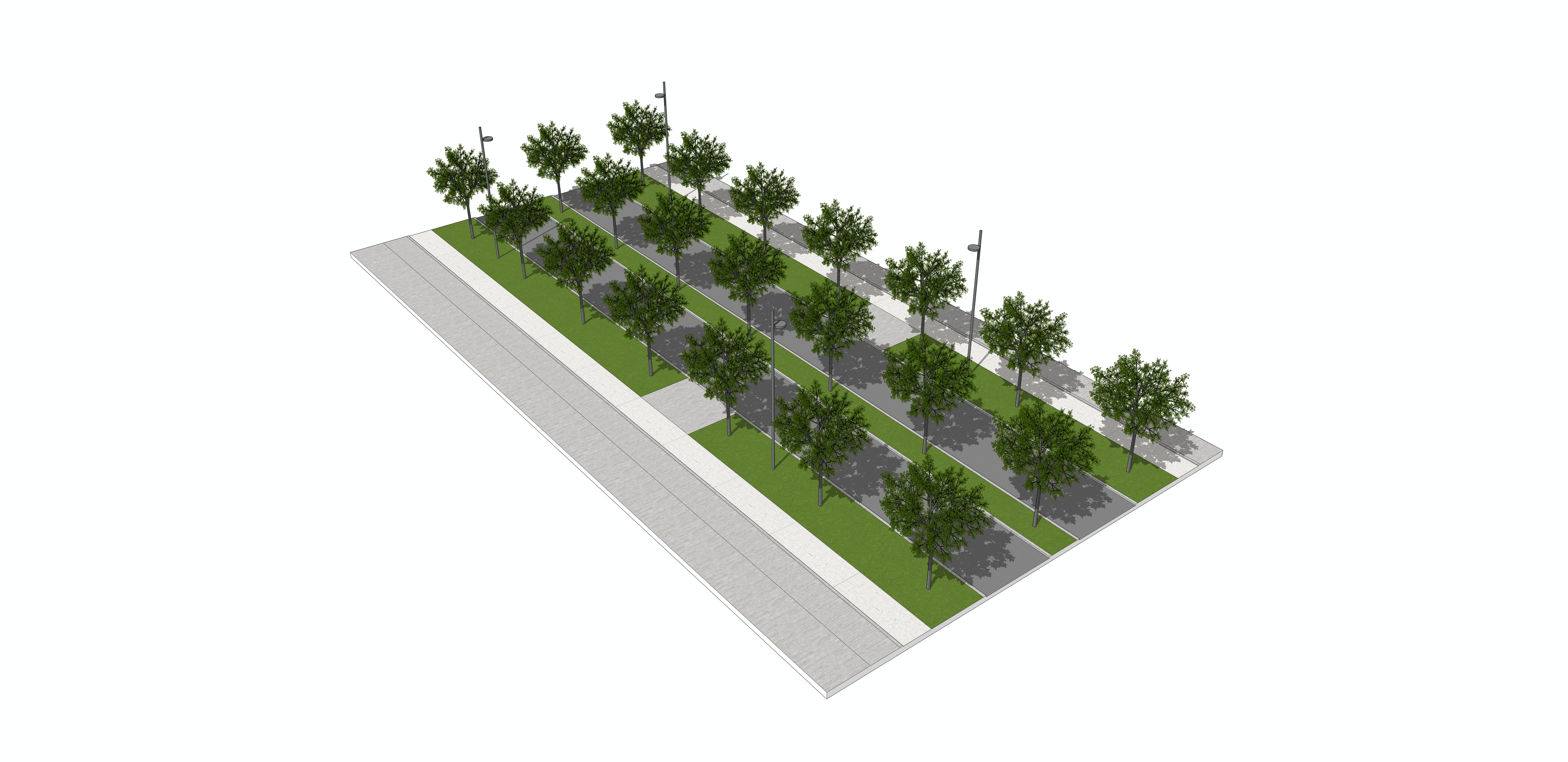 Pour le plaisir de l’exercice, j’étais curieux de voir ce qu’aurait pu donner l’option 3, en gardant la monumentalité de l’axe par de grands alignements d’arbres, mais avec un aménagement plus vert et plus résilient.