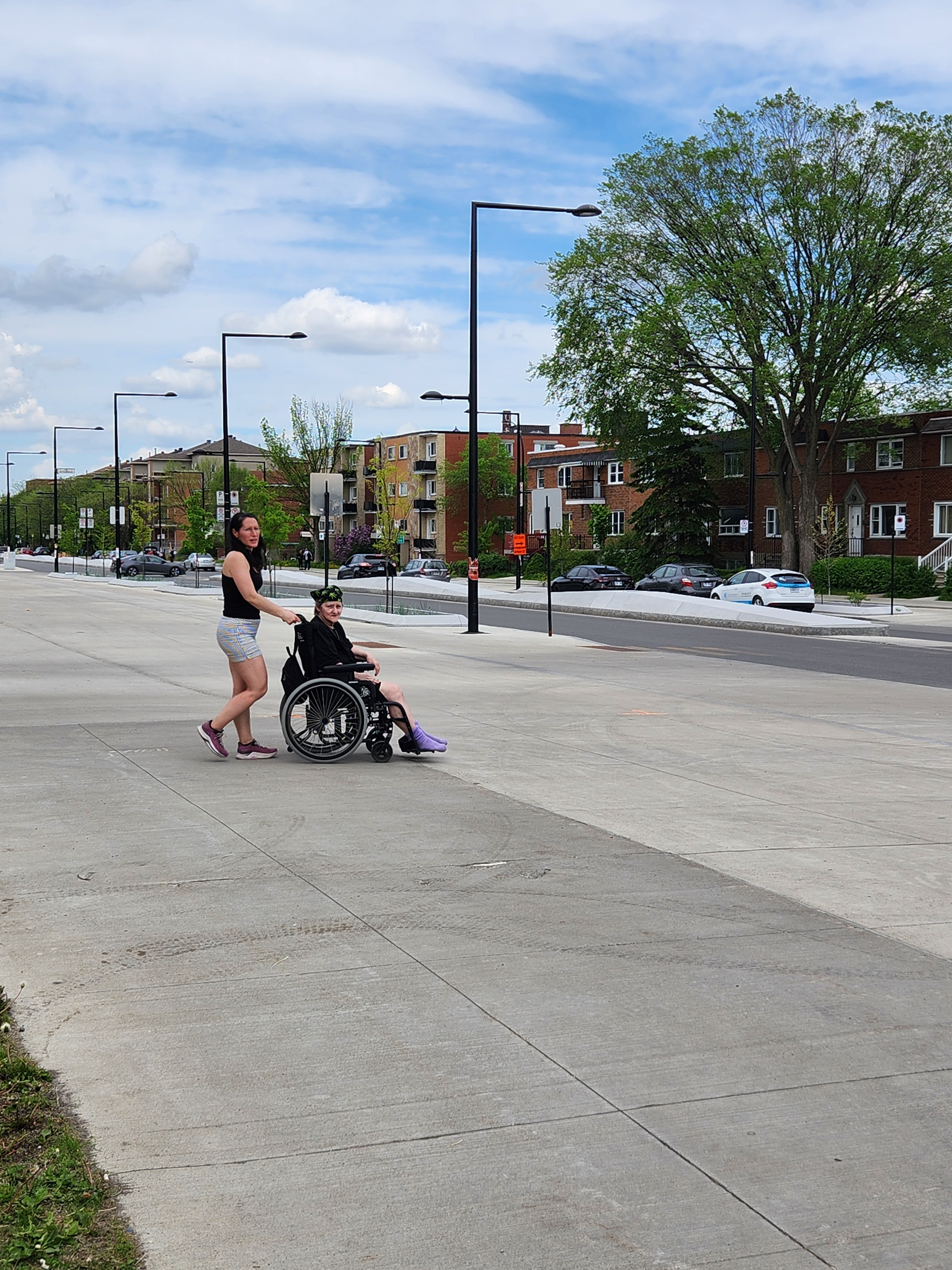 La nouvelle mouture de l’avenue large et bétonnée, un immense ilôt de chaleur. La pauvre dame avec le fauteuil roulant devait faire très attention car tout le marquage au sol des traverses piétonnes et de la piste cyclable est complètement effacé, rendant l’intersection plutôt accidentogène malgré la réduction de l’espace véhiculaire. Aussi, les voitures n’ont pas de stop à faire, mais plutôt un cédez le passage, ce qui ajoute au désagrément puisque sans marquage au sol adéquat la traverse est beaucoup moins visible, dû notamment à l’ilôt central surélevé en béton. Pourquoi le marquage, essentiel dans un tel pari de multiples voies circulatoires, n’est-il pas une priorité?