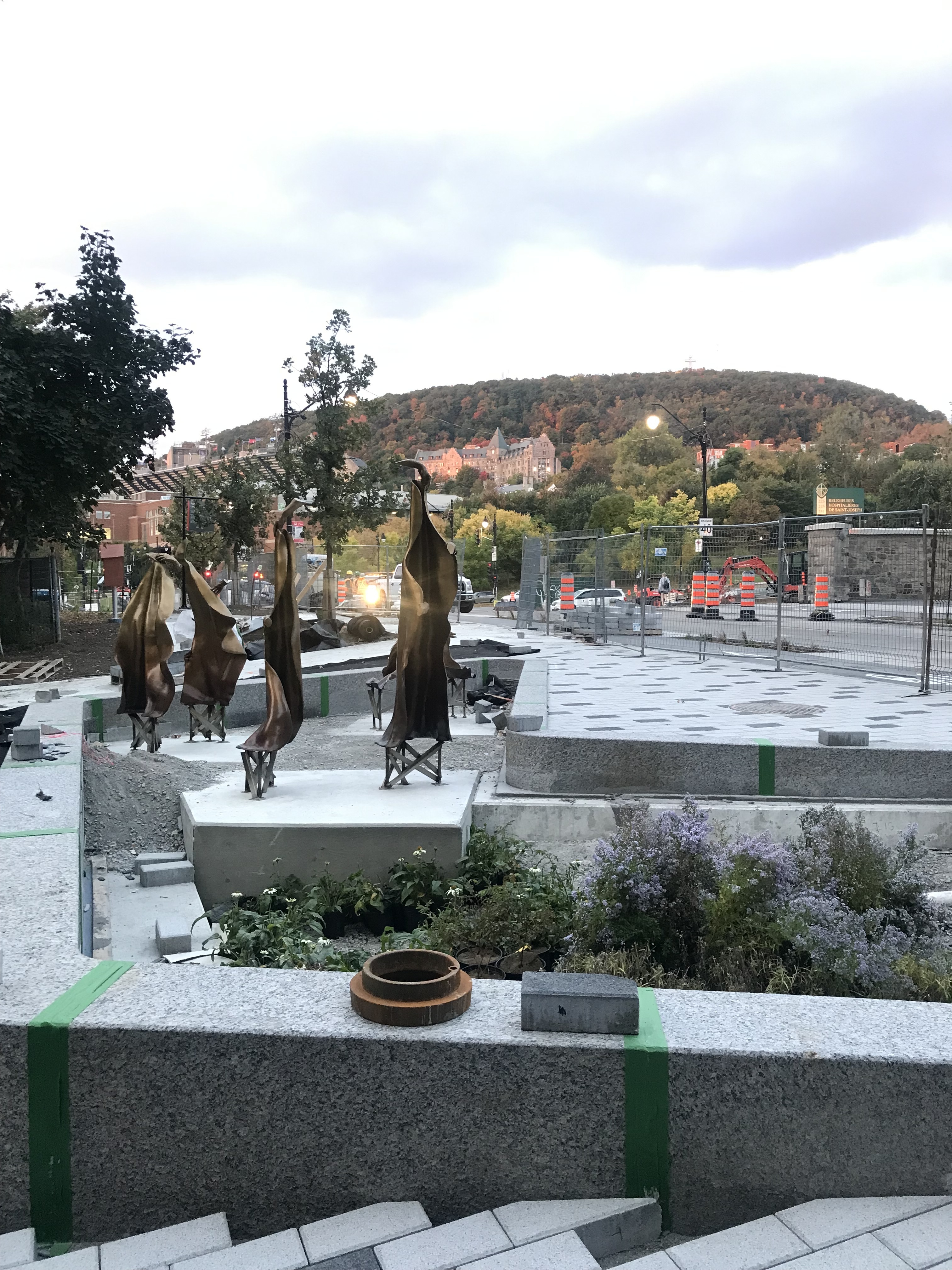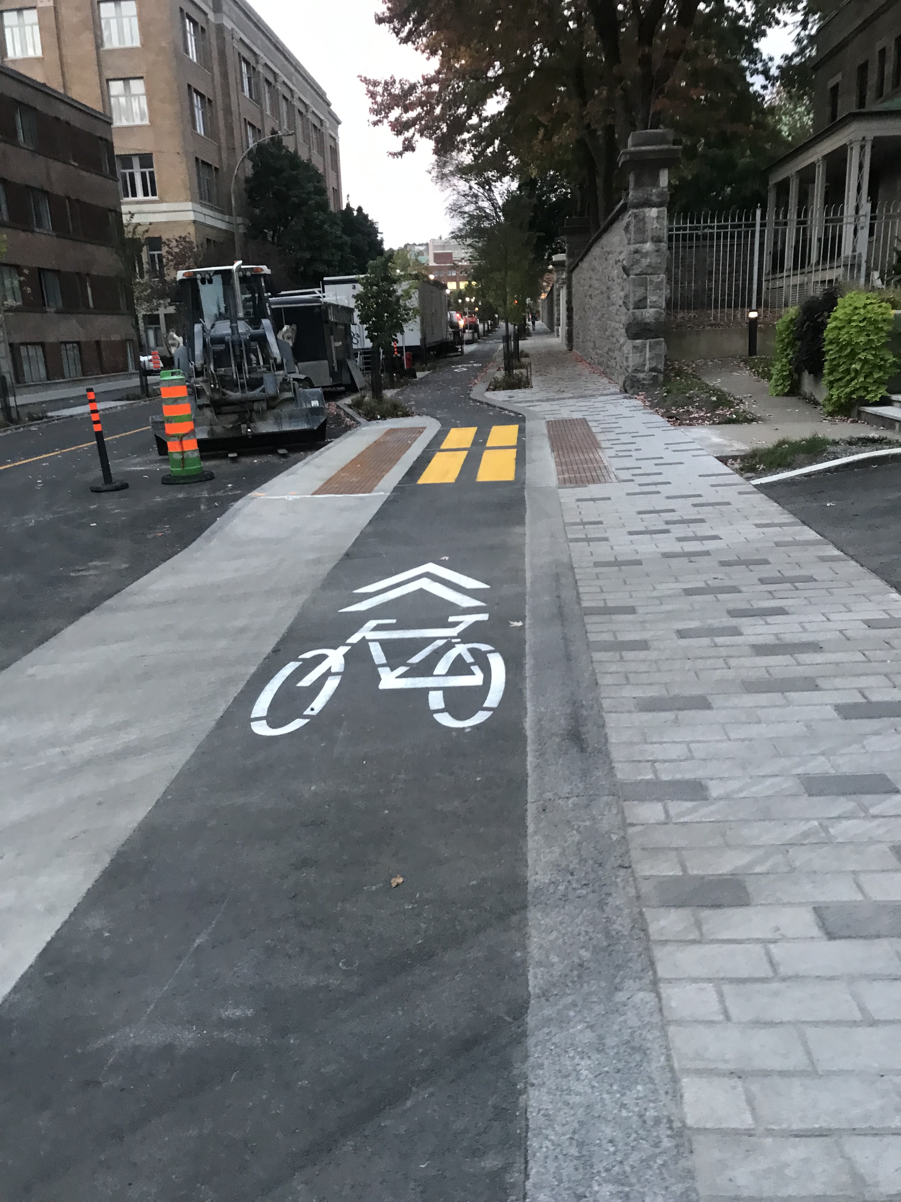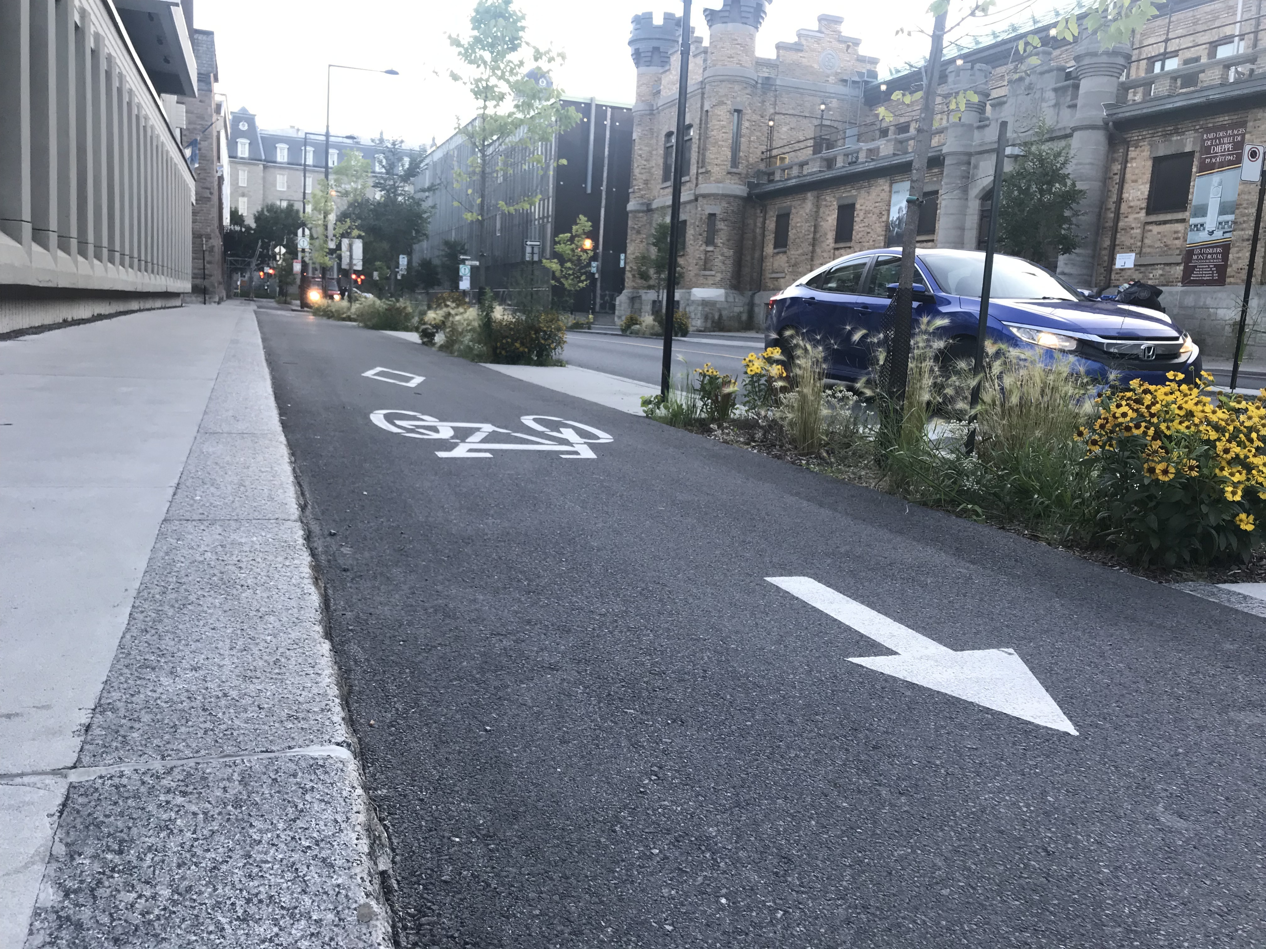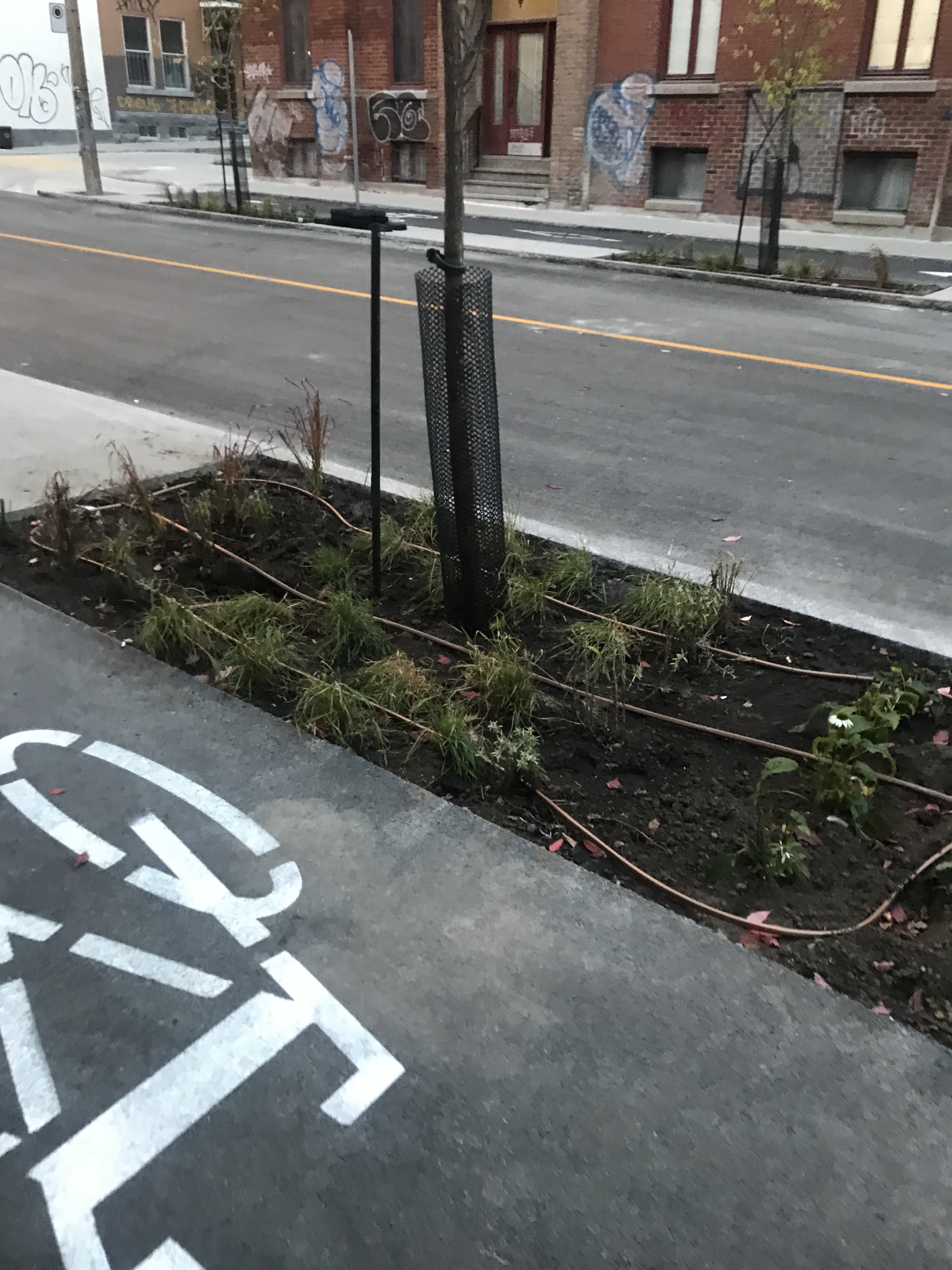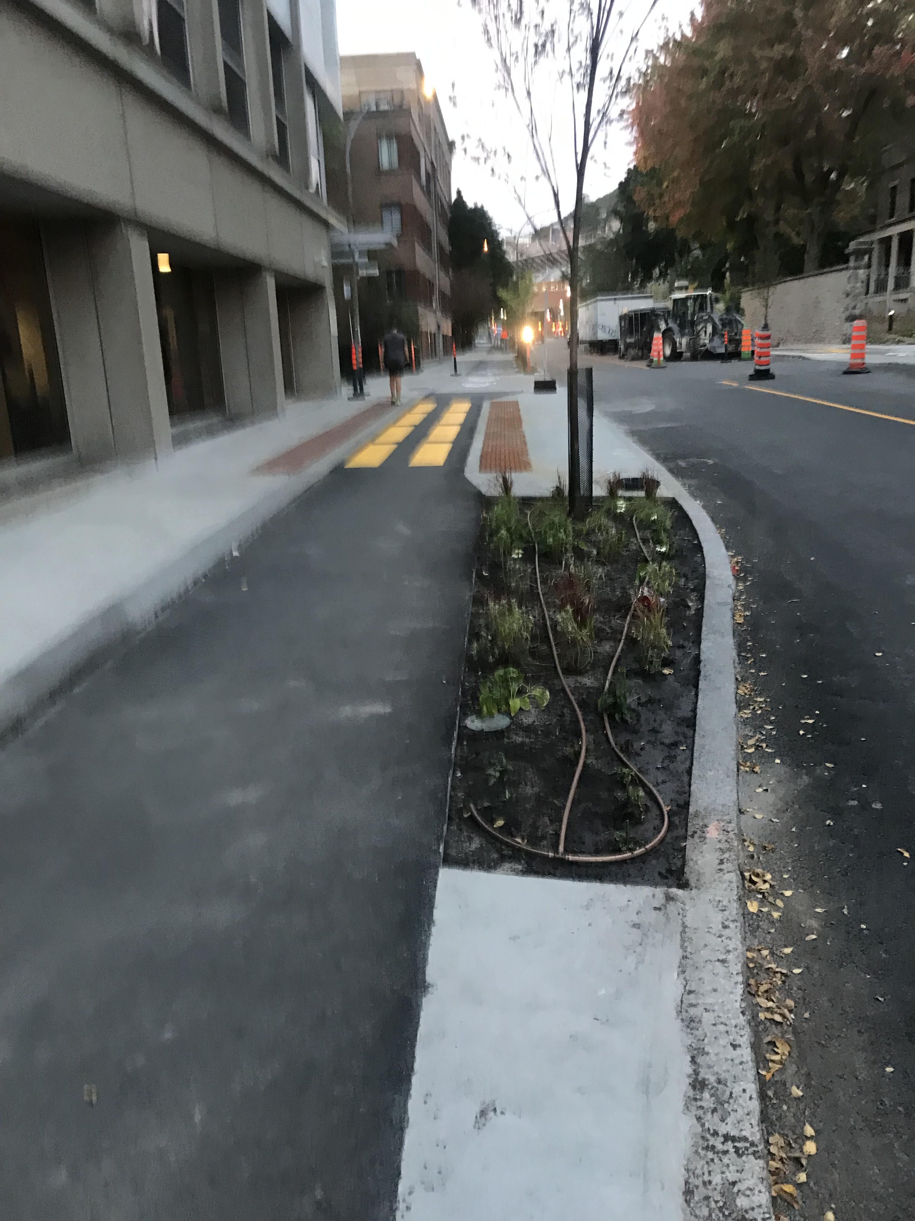 L’artère a été réaménagée pour inclure des pistes cyclables protégées des deux côtés et beaucoup plus de verdure. Une place publique est aménagée à l’intersection Jeanne-Mance.