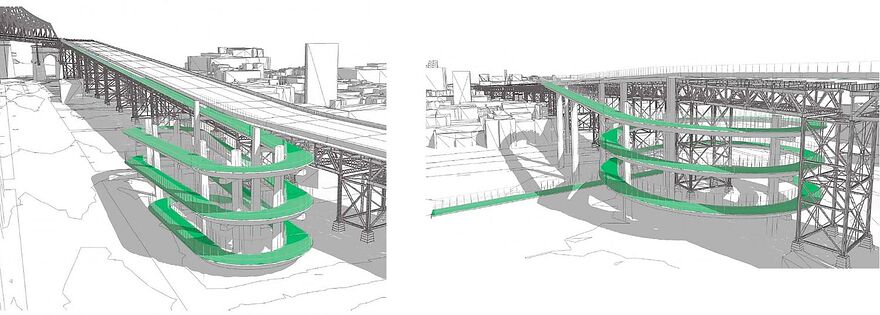 Selon notre compréhension/calculs, des rampes circulaires de 4 mètres de large et d’une longueur totale d’environ 400 mètres sur 6 paliers pourront être installées dans le parc linéaire situé sous le pont, entre les rues Sainte-Catherine et Campion. Le niveau du tablier est d’environ 18 mètres dans ce secteur. Des rampes plus larges avec des pentes d’environ 4 degrés vont assurément améliorer la sécurité pour plusieurs cyclistes afin de rejoindre le pont, mais les modifications ne conviendraient pas à tous les usagers de la mobilité active, en particulier les personnes ayant plus de difficultés de mobilité.