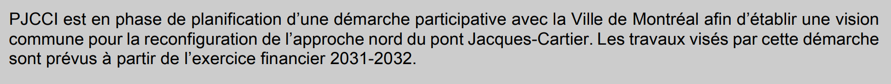 « Au terme des études réalisées […], Les Ponts Jacques Cartier et Champlain incorporée [PJCCI] a décidé de ne pas poursuivre, à l’heure actuelle, le projet d’augmentation de l’offre de service aux usagers de transports actifs sur le pont Jacques-Cartier. En effet, il a été jugé économiquement opportun de reporter l’élargissement de la piste multifonctionnelle au moment des prochains travaux de remplacement du tablier, prévus dans plusieurs années », indique Véronic Meunier, coordonnatrice de l’accès à l’information au sein de cette société d’État fédérale.