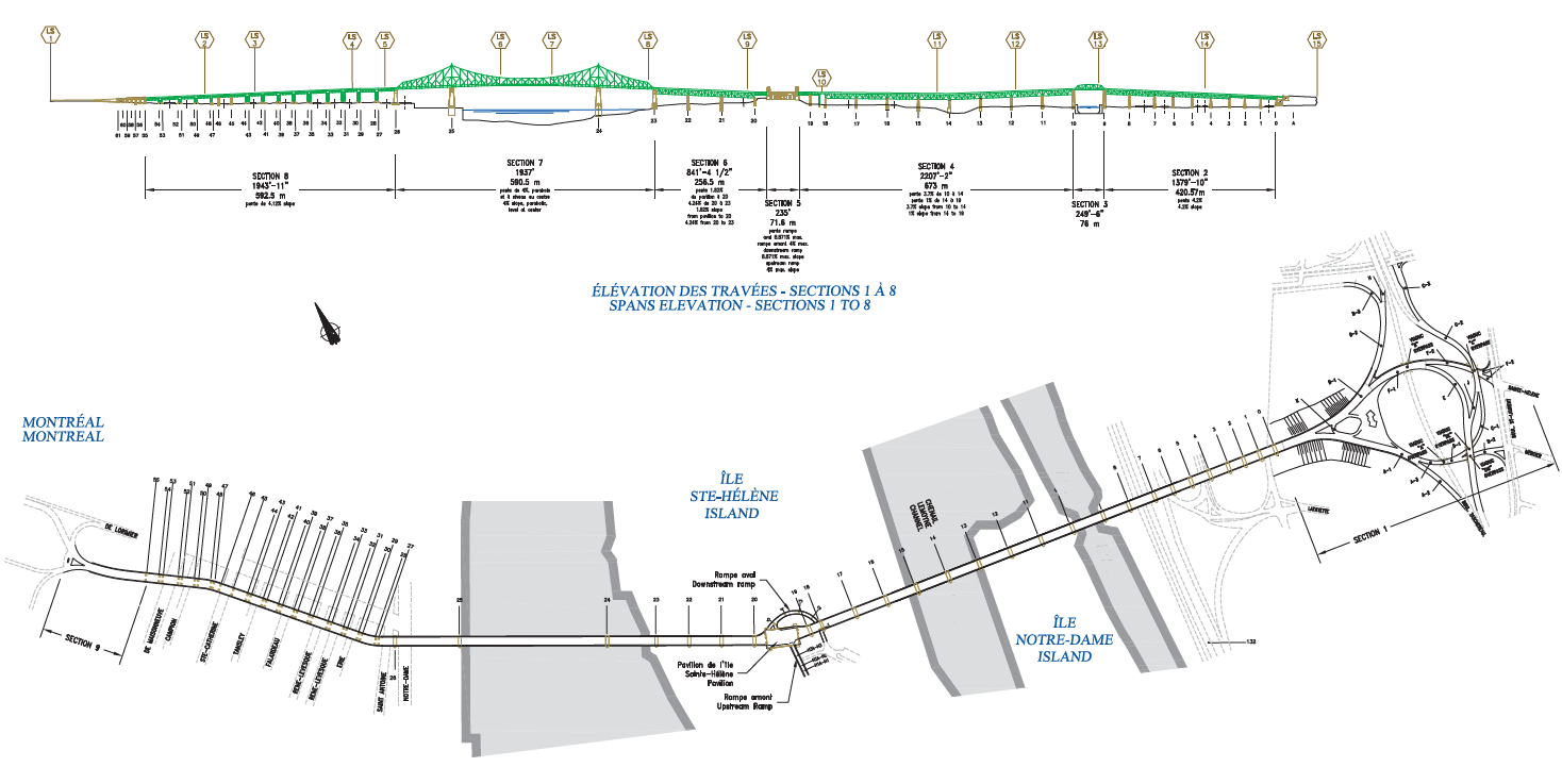 - Piste multifonctionnelle indépendante du pont aux approches Montréal et Longueuil, ainsi qu’à l’île Sainte-Hélène. Le nouveau tracé doit cependant franchir la voie maritime et le fleuve à partir de la piste sur le pont existant.