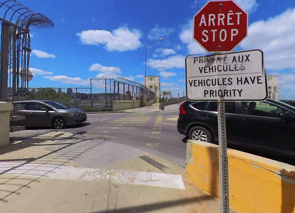 Even better, turn the bridge into a normal street. Add traffic lights in the middle on Île Sainte Hélène (with sensors to not activate unless vehicles are waiting), and make a normal street intersection on the bridge there. It would prevent cars from speeding on the slip lane and just make everything better for anyone outside of a vehicle