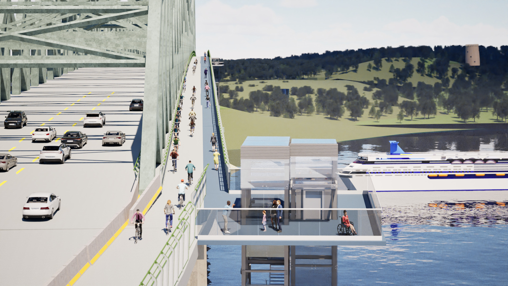 - Élargissement du trottoir du côté est à 2,5 mètres (comme la piste du côté ouest) pour offrir deux pistes unidirectionnelles, une de chaque côté du pont.