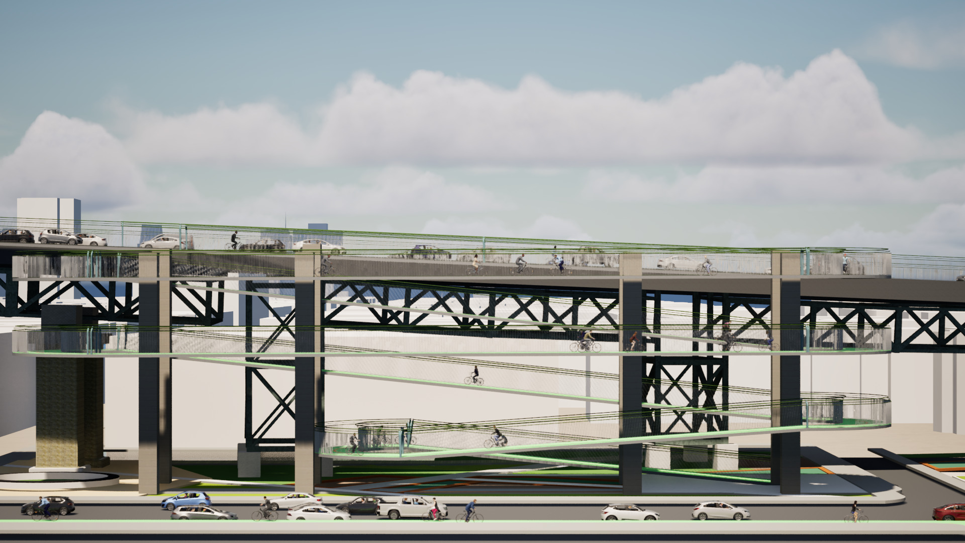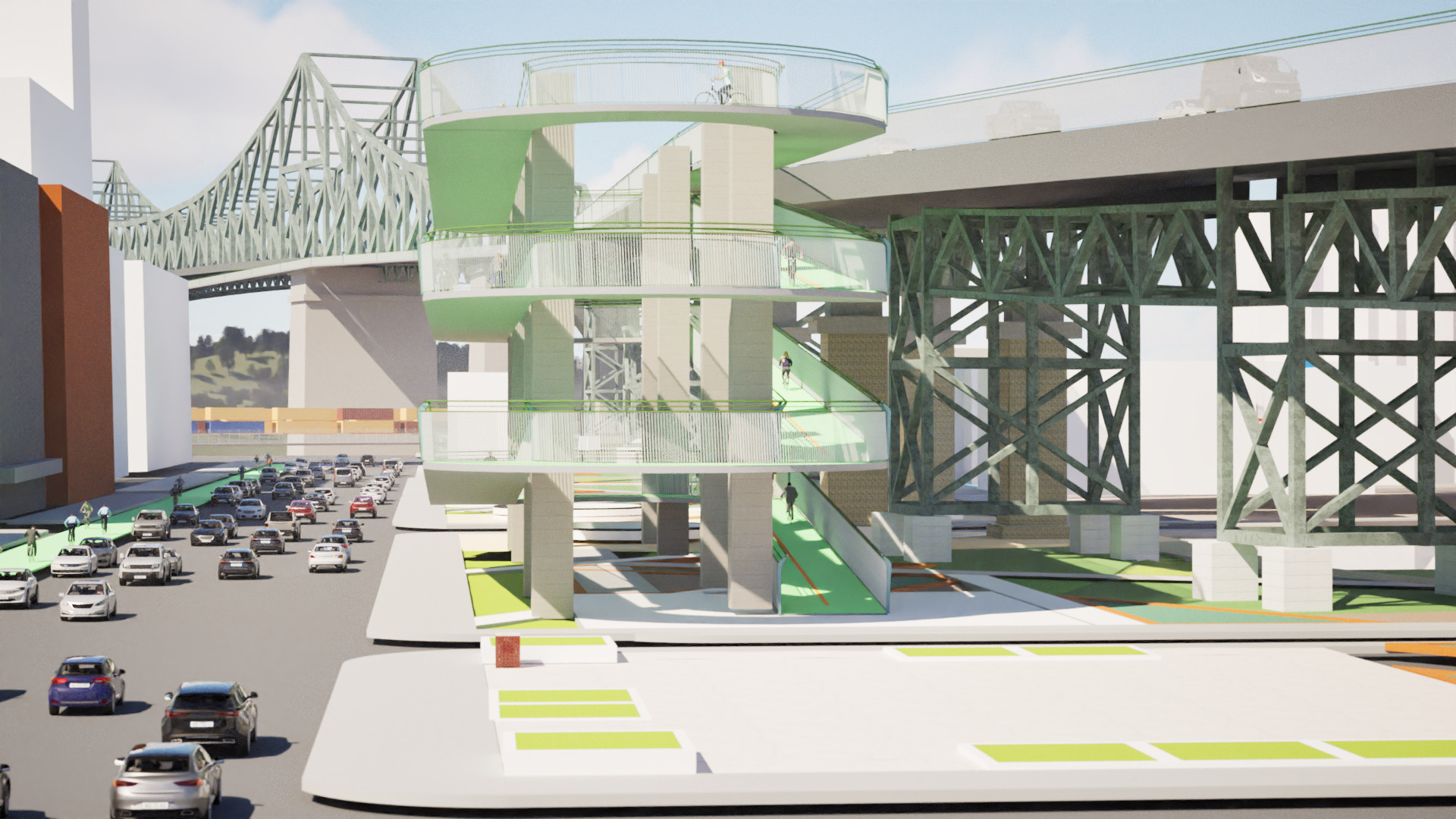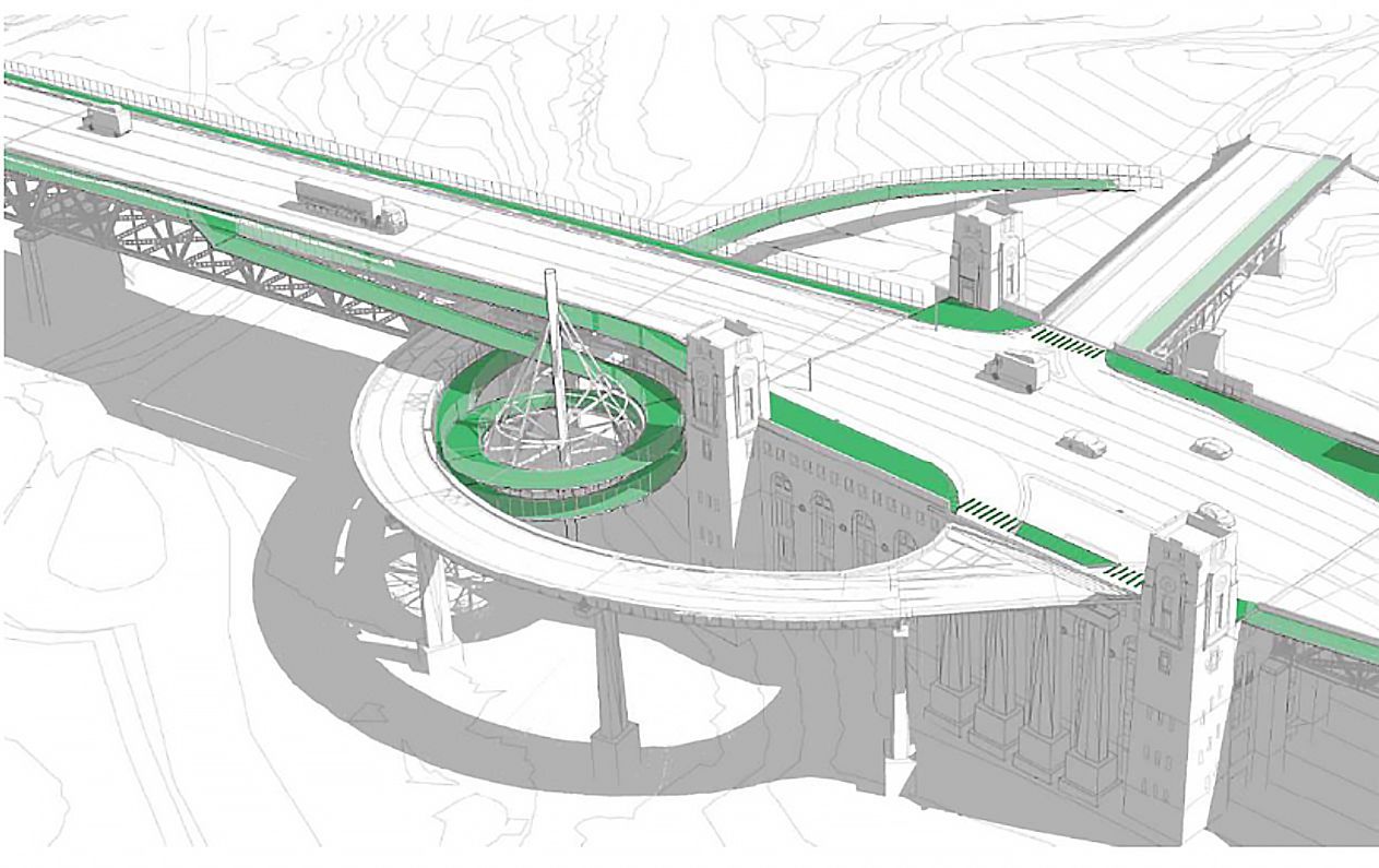 Photo: Figure extraite du rapport technique d’avant-projet fourni par le Consortium ParsonsDes maquettes montrent notamment des pentes en spirale de plusieurs étages qui créent un lien cyclable entre le sol et le pont.Ces professionnels n’ont pas craint de « penser hors du cadre » : des maquettes montrent notamment des pentes en spirale de plusieurs étages qui créent un lien cyclable entre le sol et le pont. Des passerelles permettant aux cyclistes de survoler les zones propices aux conflits avec les automobilistes — tout en limitant les pentes sur la piste — font aussi partie des scénarios proposés.