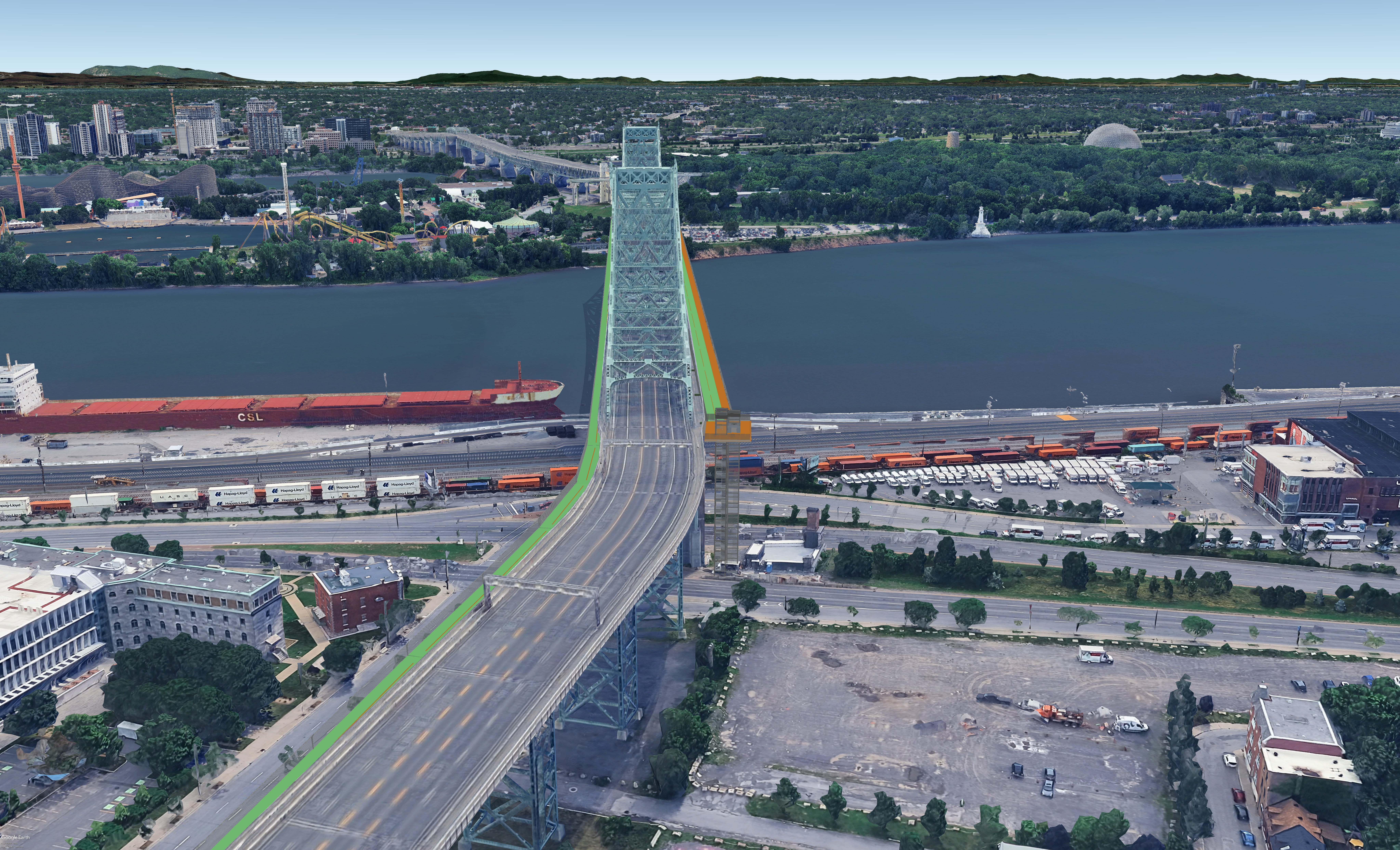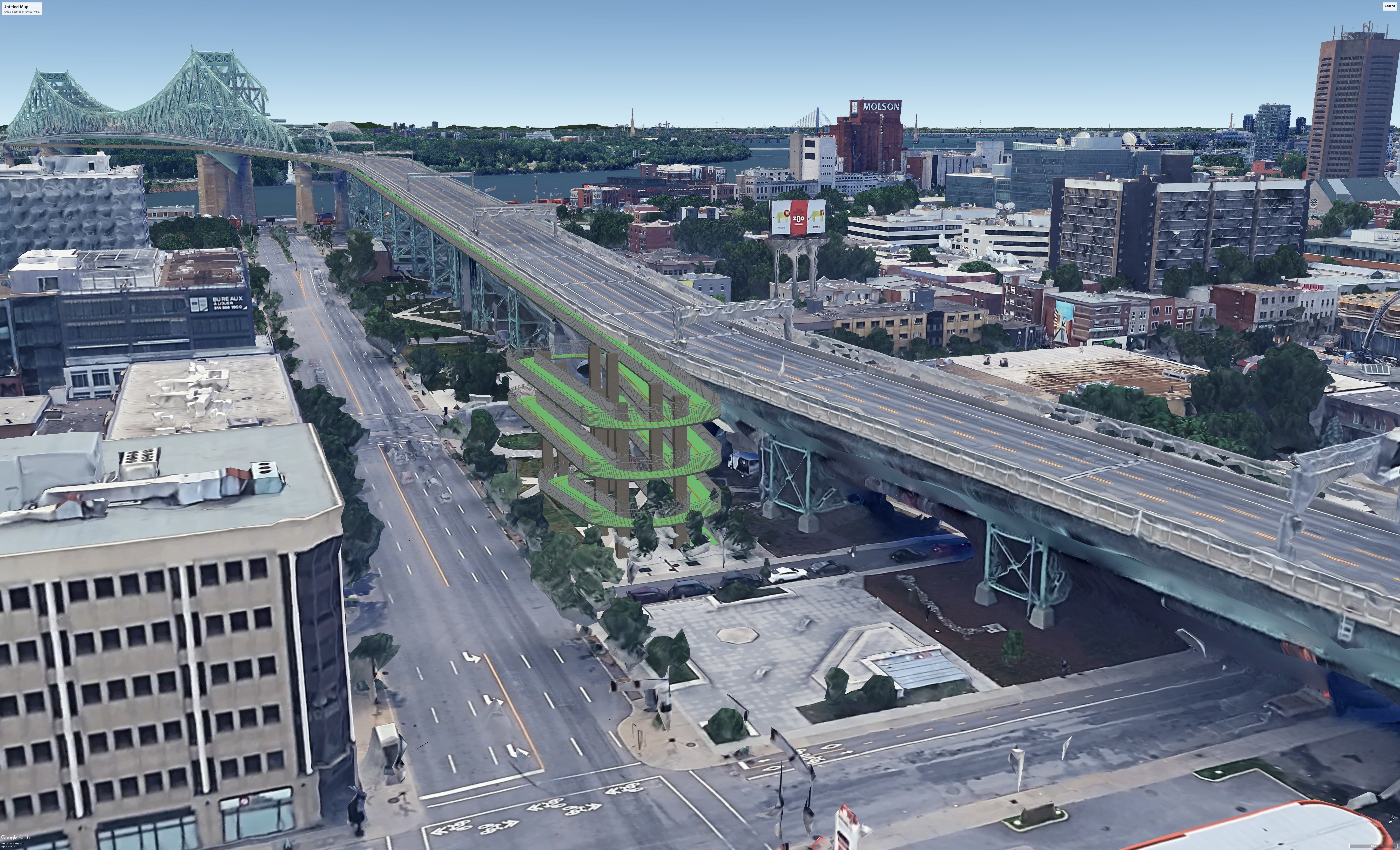 Trois scénarios ont été retenus par la société d’état qui est responsable du pont Jacques-Cartier pour améliorer la mobilité active sur le pont. Nous avons essayé de reproduire le scénario où on mettait en lumière des rampes circulaires pour mieux sécuriser la piste. La société dit vouloir repousser les travaux correctifs au moment du remplacement du tablier du pont prévu en 2060.