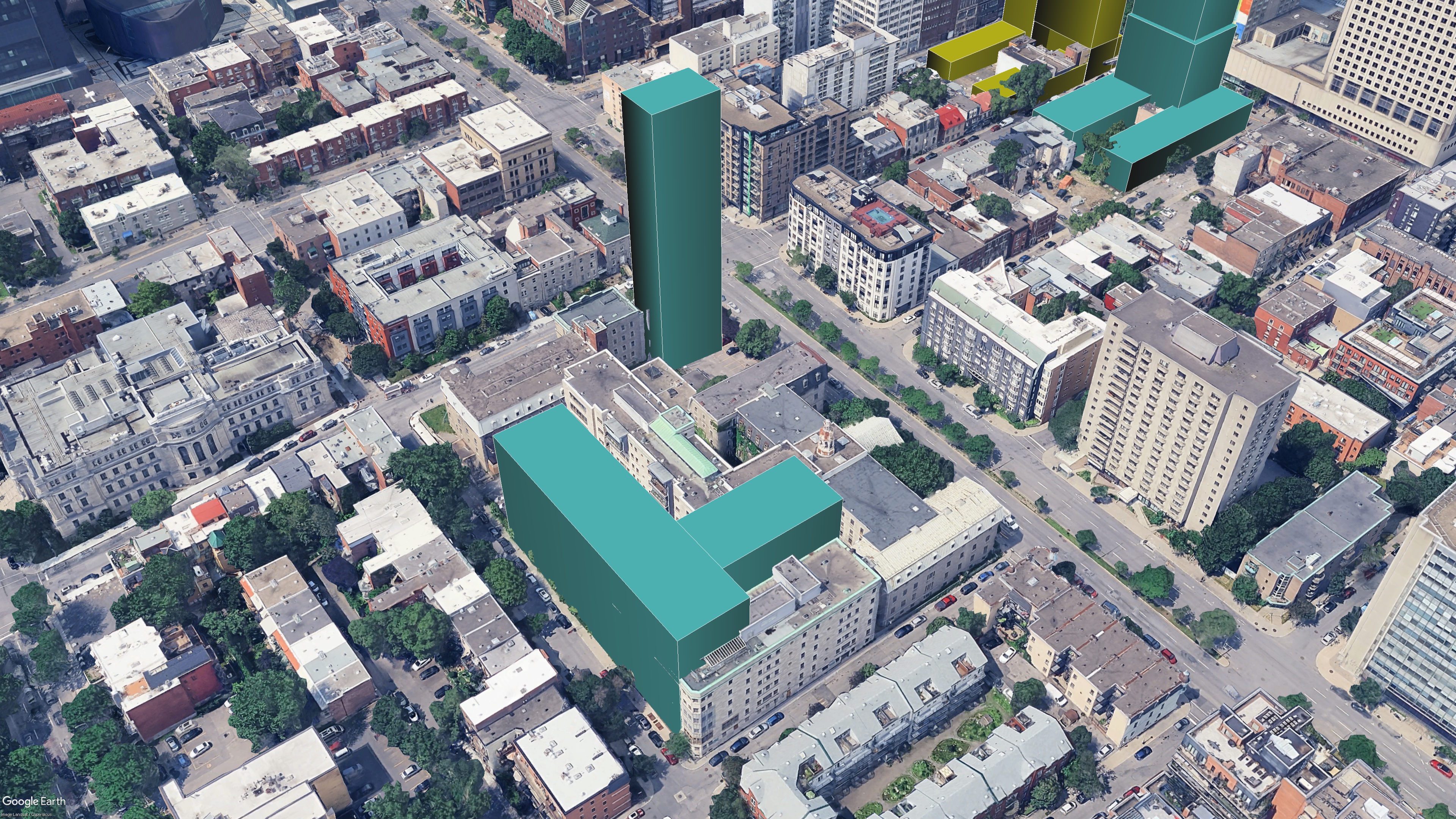 Je crois que les nouveaux volumes s’agencent environ comme ça? J’ai juste quelques 4 élévations pour juger, sans un plan d’ensemble. En tout cas, à environ 90 mètres, la tour s’impose.