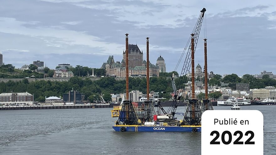 Une plateforme de forage fait des prélèvements dans le fond du fleuve Saint-Laurent pour documenter la qualité des sols en vue de la construction du tunnel Québec-Lévis.