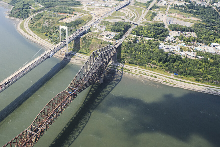 Par ailleurs, des travaux amorcés par l’ancien propriétaire, le CN, se poursuivent près de la rive sud. Ce sont les tentes blanches que l’on aperçoit sous la chaussée du pont de Québec.