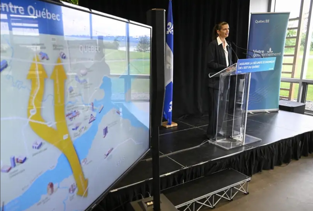 La ministre Geneviève Guilbault présente le corridor retenu pour le troisième lien à la salle du Quai du Cap-Blanc. (Caroline Grégoire/Le Soleil)