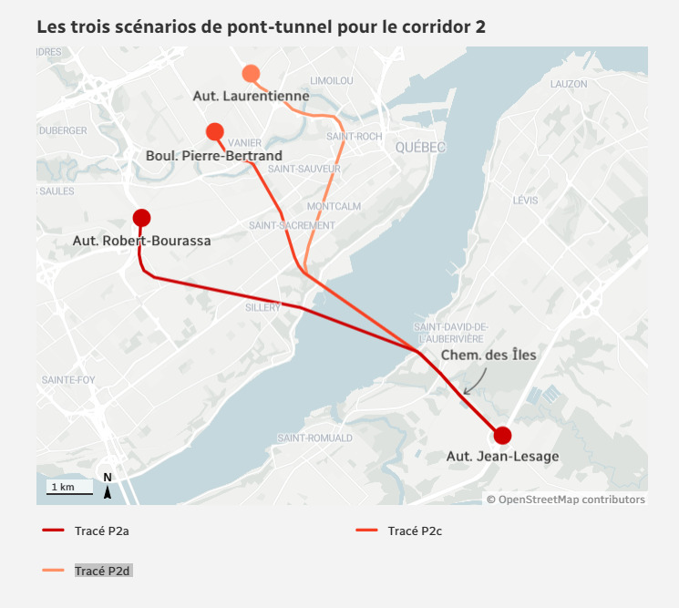 Dans une séance d’information technique offerte aux médias jeudi matin, des fonctionnaires ont confirmé qu’un pont-tunnel permettant de joindre les autoroutes Félix-Leclerc (40), à Québec, et Jean-Lesage (20), à Lévis, constitue le scénario le plus «optimal».
