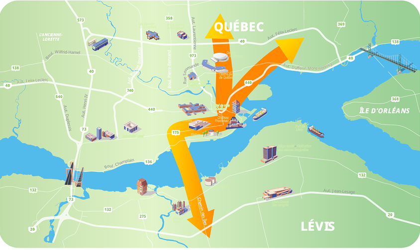 Selon nos sources, le projet de pont se connecterait à partir du chemin des Îles, dans le secteur de Valero, à Lévis par l’autoroute 20. Il s’agit d’une zone industrielle. Une fois sur la rive nord, le pont se transformerait en tunnel. La structure passerait au-dessus de la voie ferrée existante et du boulevard Champlain.