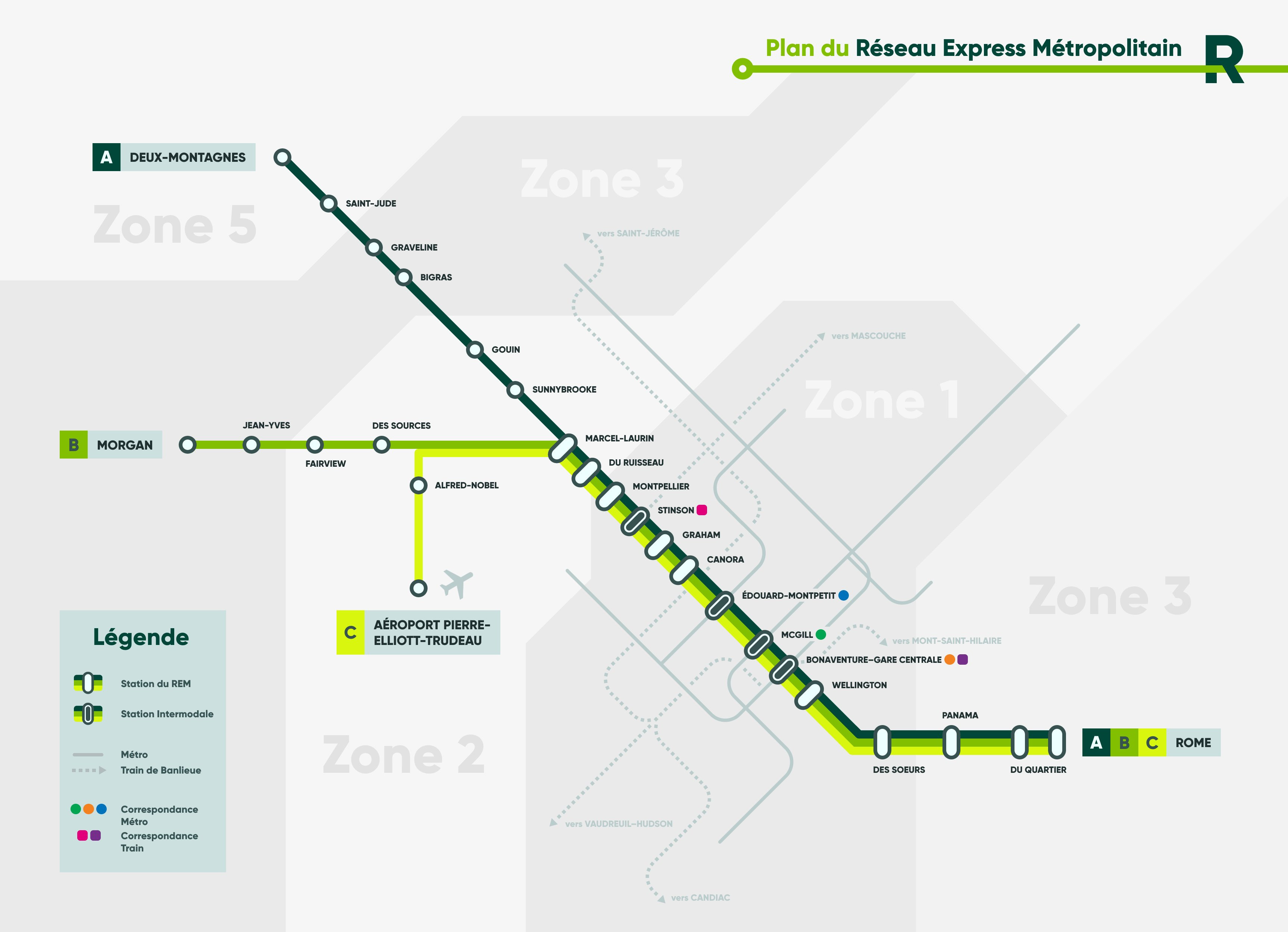 Les thèmes de couleur tirent leurs inspirations des lieux traversés par le tracé du REM. Par exemple, le bleu « riverain » s’inspire de la rivière des Prairies, le vert forestier rappelle l’accès aux parcs de l’Ouest et le rouge du secteur urbain mixte fait référence à la brique qu’on retrouve dans le secteur à la fois industriel et résidentiel de l’arrondissement Saint-Laurent et du secteur de Ville-de-Mont-Royal.