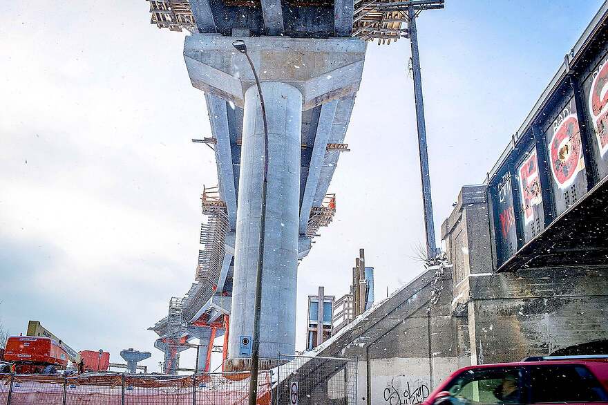 Les dernières poutres de la structure aérienne du Réseau express métropolitain reliant la Rive-Sud à la gare Centrale, au centre-ville de Montréal, ont été installées à la mi-janvier. PHOTO : CDPQ INFRA