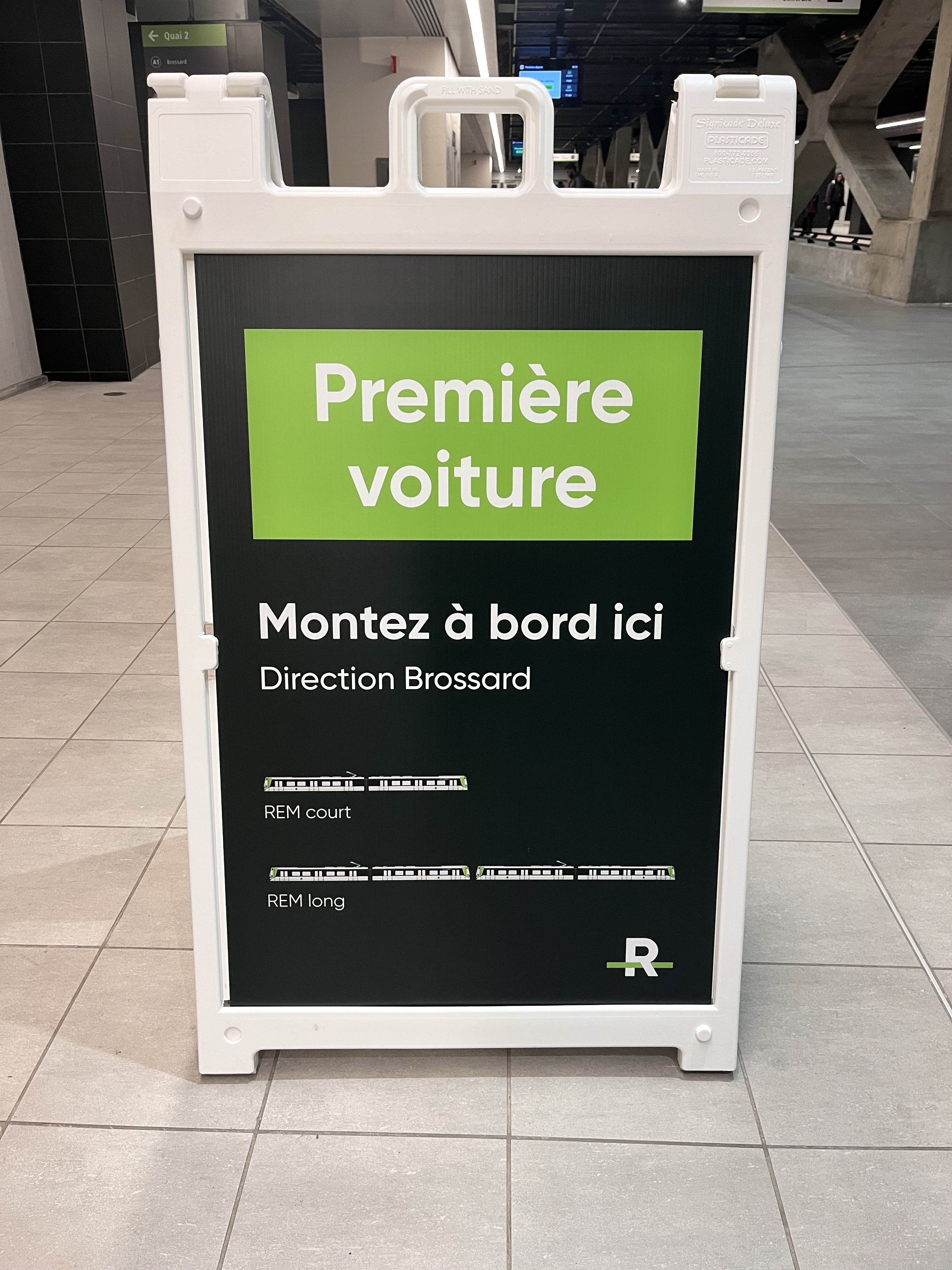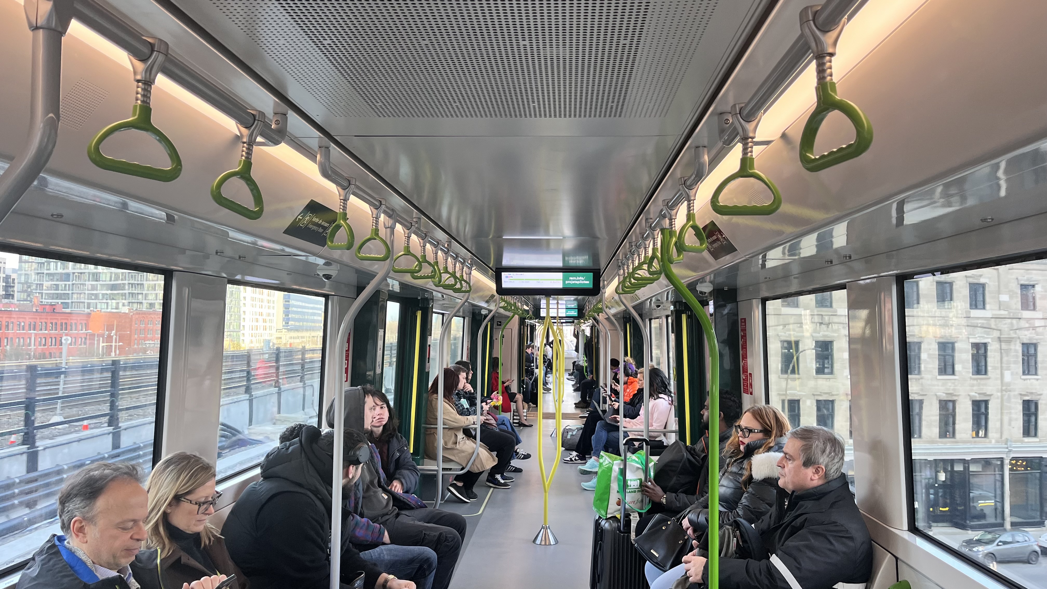 Je suis allé voir ça et je peux confirmer que c’est aussi plus silencieux à l’intérieur. Il n’y a pas d’overcrowding (photo prise aux alentours de 18h30 en direction Brossard). Les indicateurs de charge ne fonctionnent toujours pas, tel que prévu. Belle signalétique claire. Tout fonctionne à merveille!