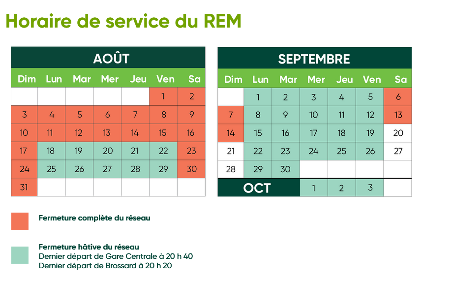 Le REM sera complètement fermé les week-ends du 30 et 31 août, 6, 7, 13 et 14 septembre. Des navettes seront en place en dehors des heures de service.