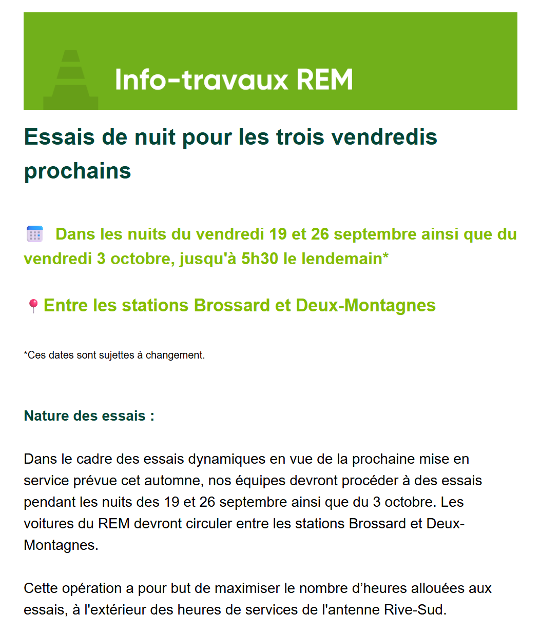 Dans le cadre des essais dynamiques en vue de la prochaine mise en service prévue cet automne, nos équipes devront procéder à des essais pendant les nuits des 19 et 26 septembre ainsi que du 3 octobre. Les voitures du REM devront circuler entre les stations Brossard et Deux-Montagnes.