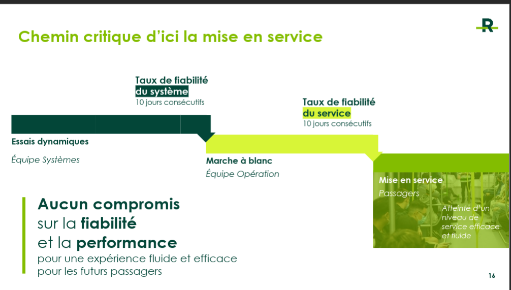 Je comprends pas pourquoi c’est annoncé comme étant particulier de faire des essais la nuit. La plupart des réseaux dans le monde c’est ça qu’ils font pour leurs prolongements. Pour ce qui est de la marche à blanc c’est 5h30 à 1h pendant 1 mois avec les passagers qui débarquent à gare centrale.