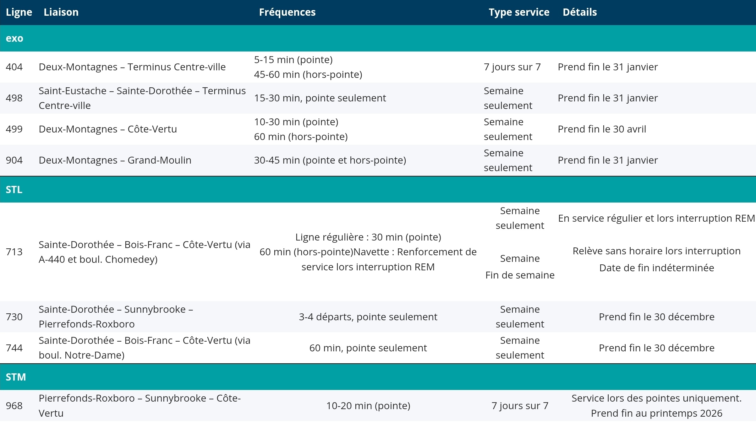 La nouvelle branche misera sur ces « alternatives existantes », a-t-il précisé, qui seront bonifiées en cas de pannes par « des services de relève ». Sans la chiffrer, le directeur de l’ARTM a annoncé qu’« une réserve opérationnelle temporaire » avait été prévue pour rendre plus « costaude » l’offre de service à Montréal et Laval jusqu’au 31 décembre 2026.