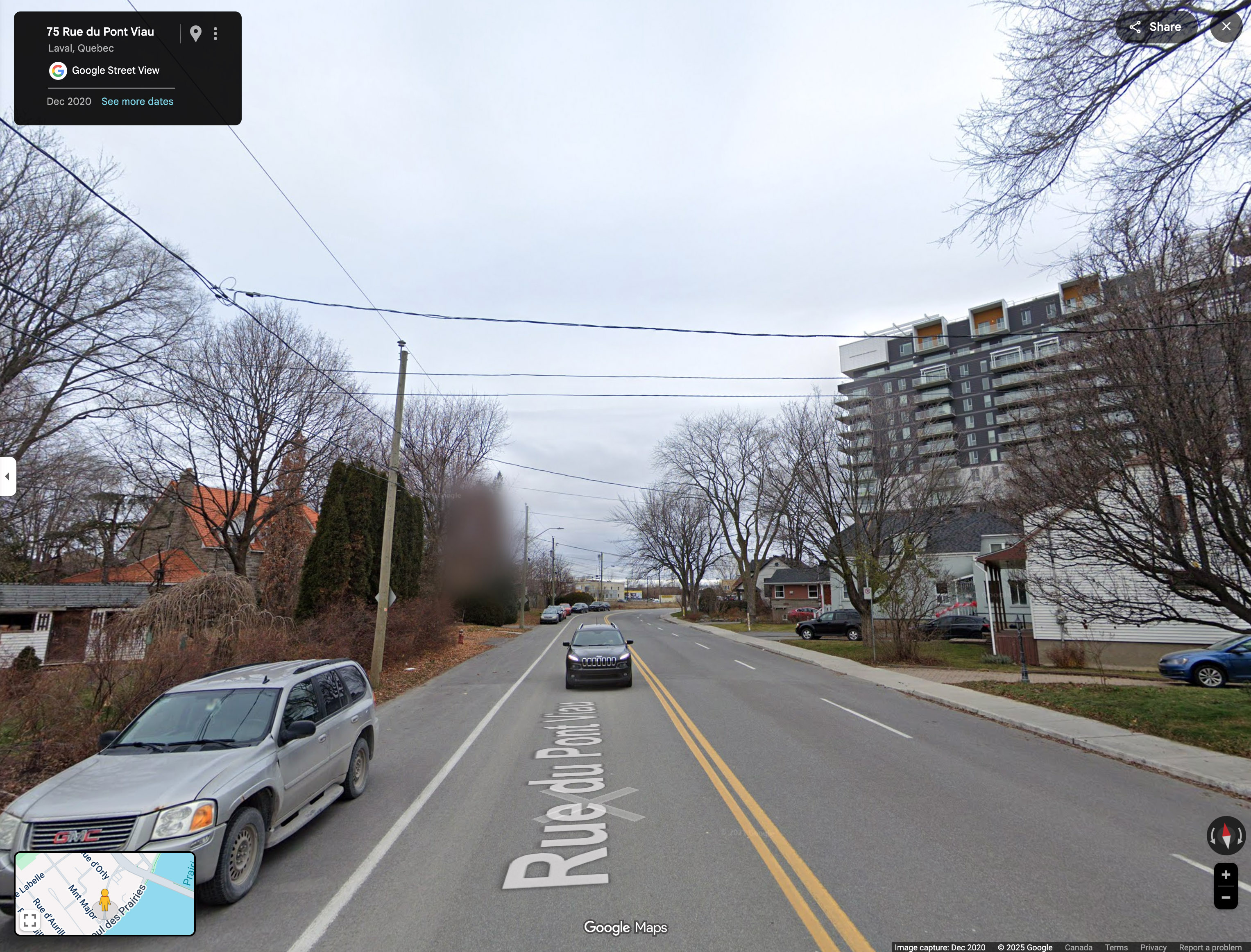 C’est la rue du Pont-Viau. Le côté à gauche dessert 3 unifamiliales. Je ne crois pas que cet endroit génère un gros trafic piétonnier, et il n’y a pas trop de raisons de traverser la voie. Le rue est principalement une bretelle d’accès au boulevard des Laurentides et au pont (mais cela devrait être amené à changer dans le cadre du TOD Cartier).