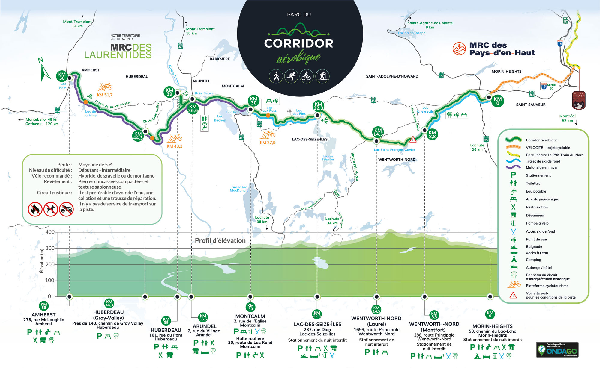 Dans les dernières semaines, j’ai fait un long voyage à vélo (de marde (il faisait 40 tous les jours)) et j’ai découvert une nouvelle piste au nord de Montréal vraiment cool: c’est le Parc du corridor aérobique des Laurentides.