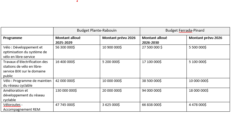 - Diminution de 36 millions / 5 ans du budget de développement du réseau vs. augmentation de 20 millions / 5 ans du programme de véloroute du REM. Globalement diminution de l’ambition du développement du réseau cyclable, et le projet de Véloroute prend une part plus importante du financement.