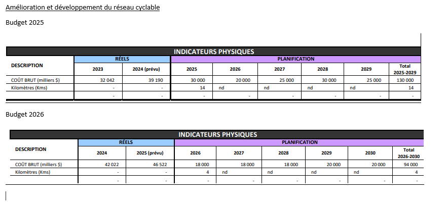 Résumé des changements entre le PDI 2026 et ce qui était prévu en 2025 sur les programmes d’investissements concernant le réseau cyclable: