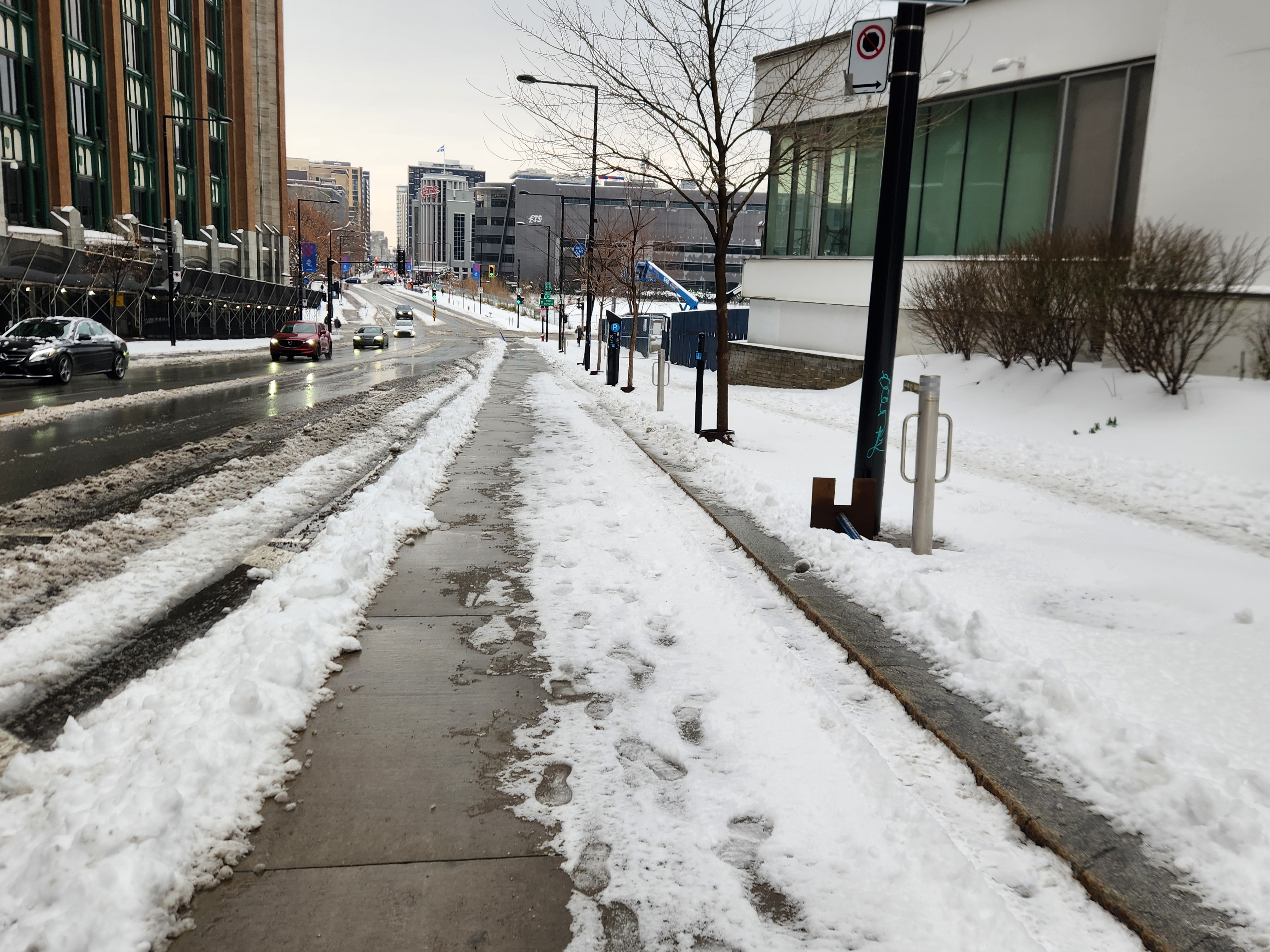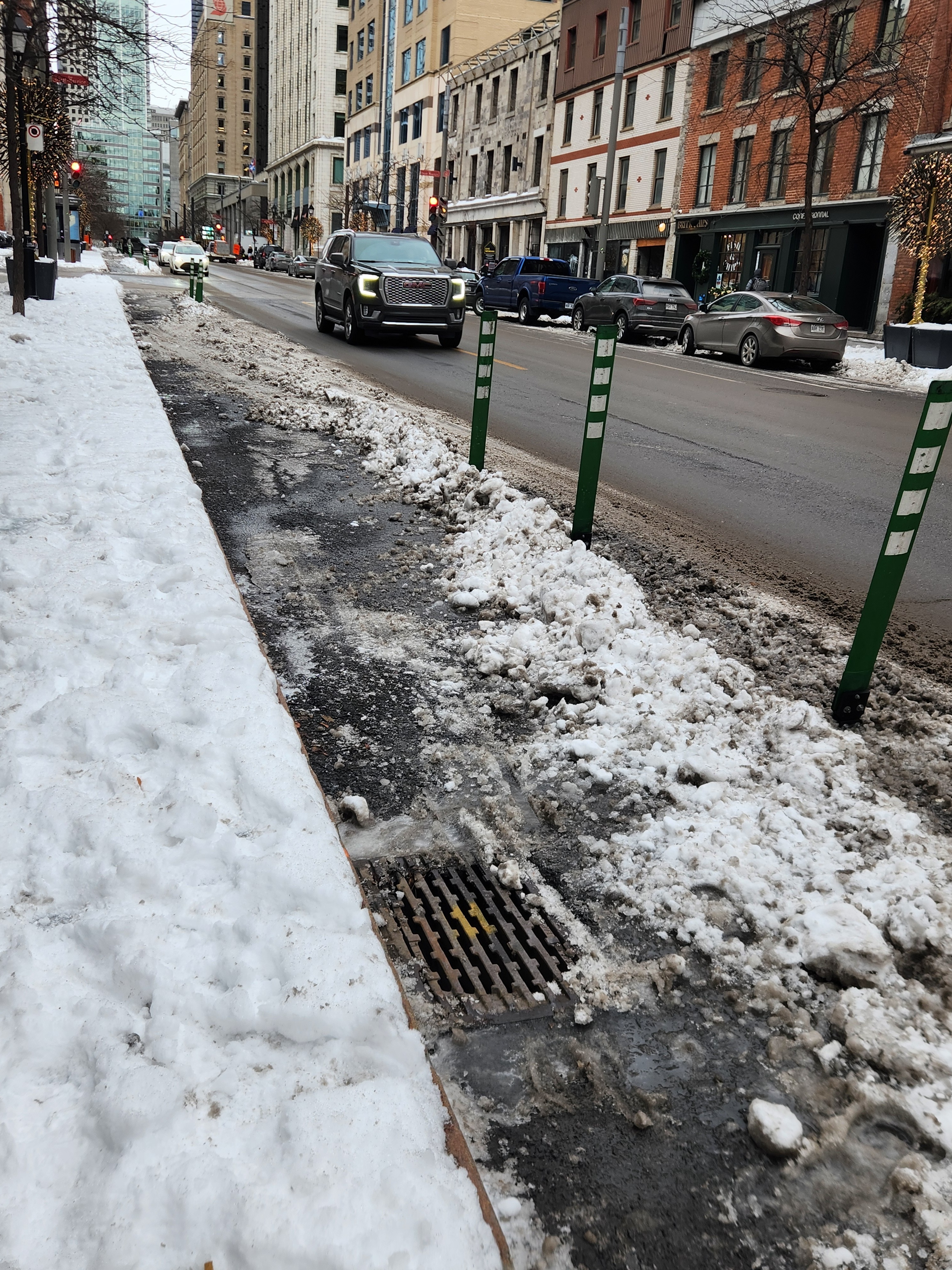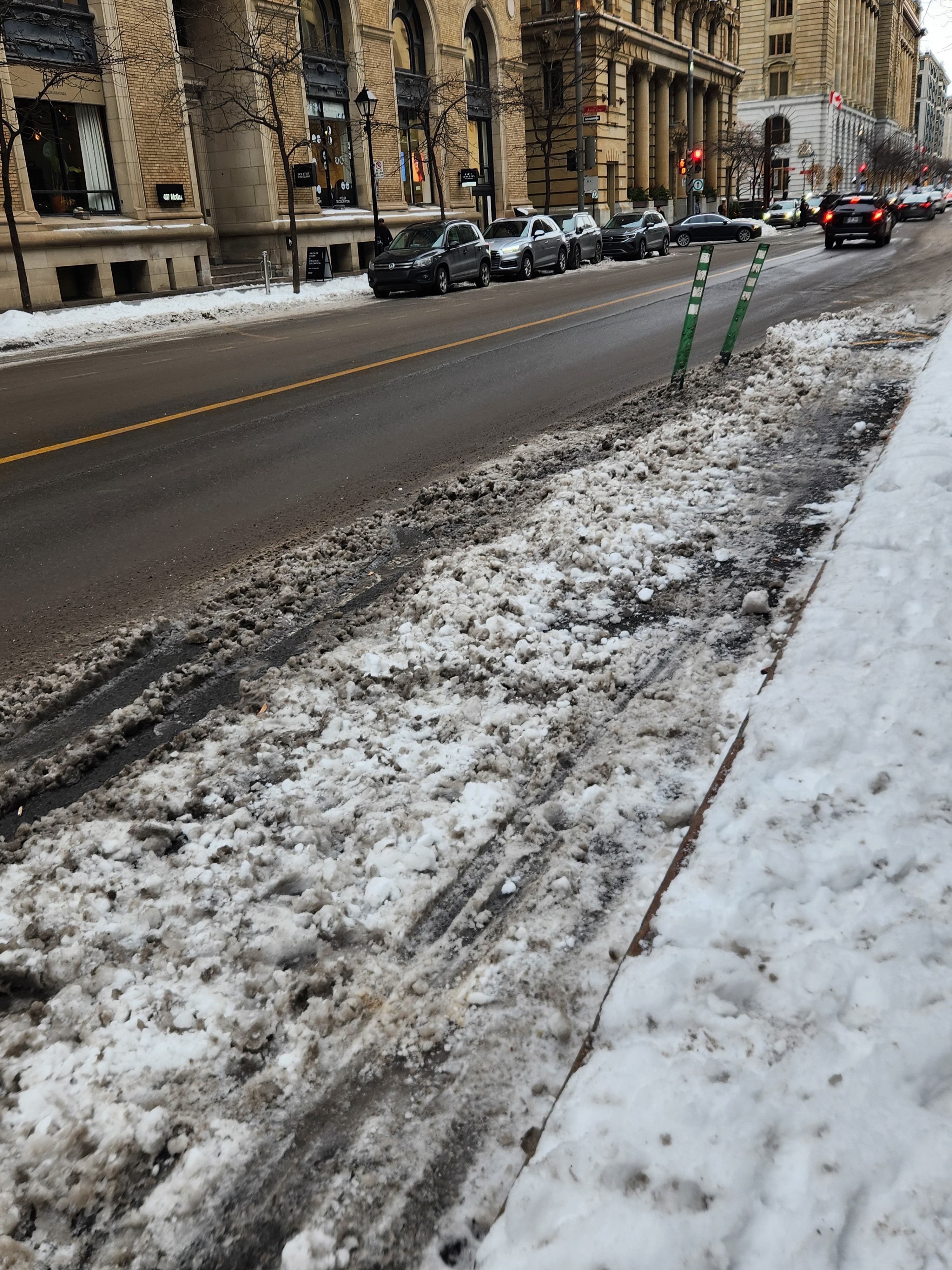 En même temps, avec ce genre d’installation, faut pas s’attendre à mieux, avec une bordure la neige aurait été arrêtée et sans bollard la neiges aurait été tassée complètement sur la bordure du trottoir, avec trop de bollards ça aide pas le déneigement