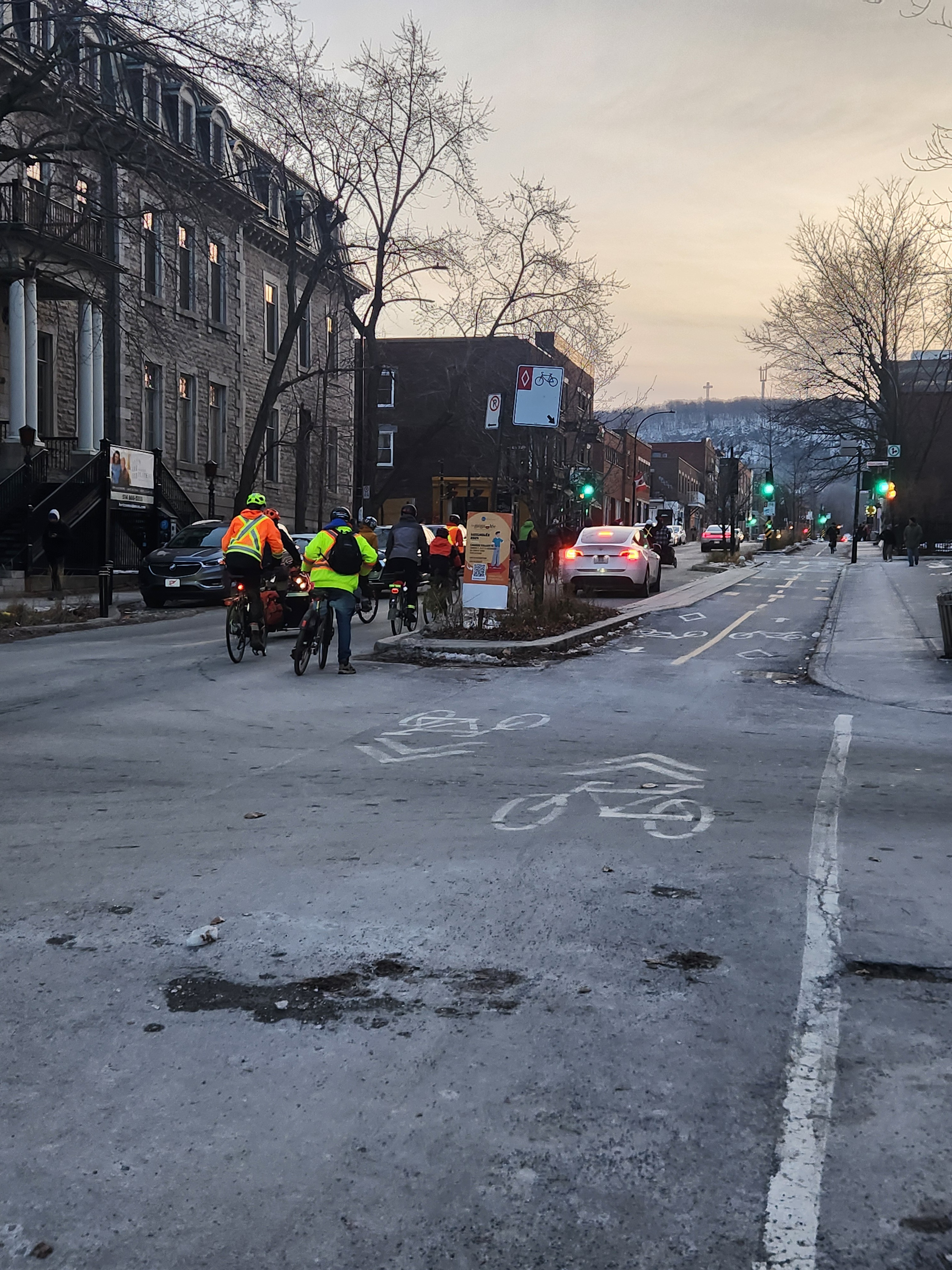 Un groupe d’une dizaine de cyclistes pédalait sur la rue Rachel au son d’une musique de Noël avec des enfants. Par contre, ils pédalaient en pleine rue alors qu’il y a une piste cyclable à côté. Pas trop sûr si c’est plus sécuritaire mais ça me rappelle l’auto dans la piste cyclable, en pari opposé ![]()